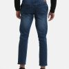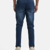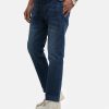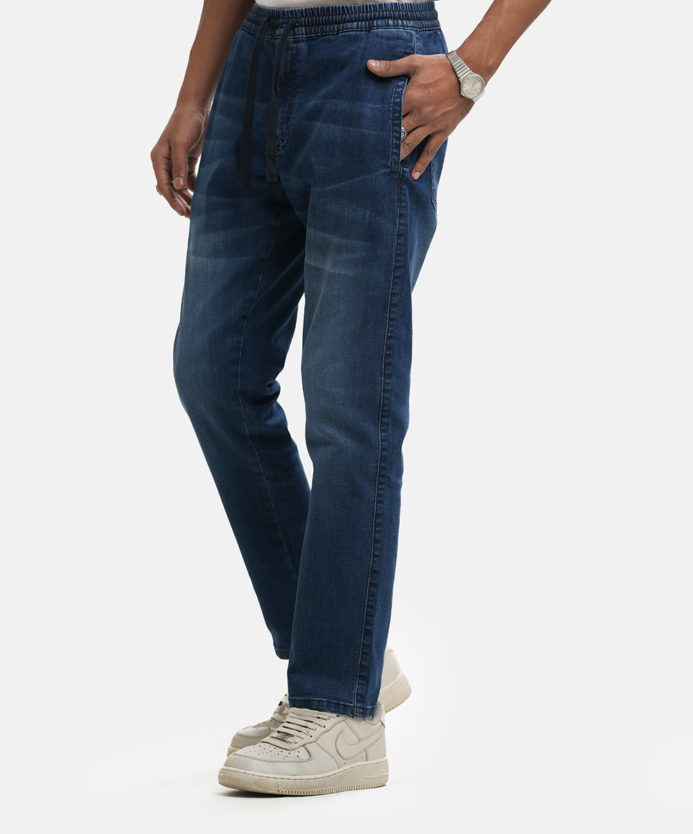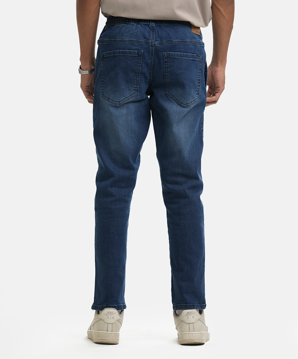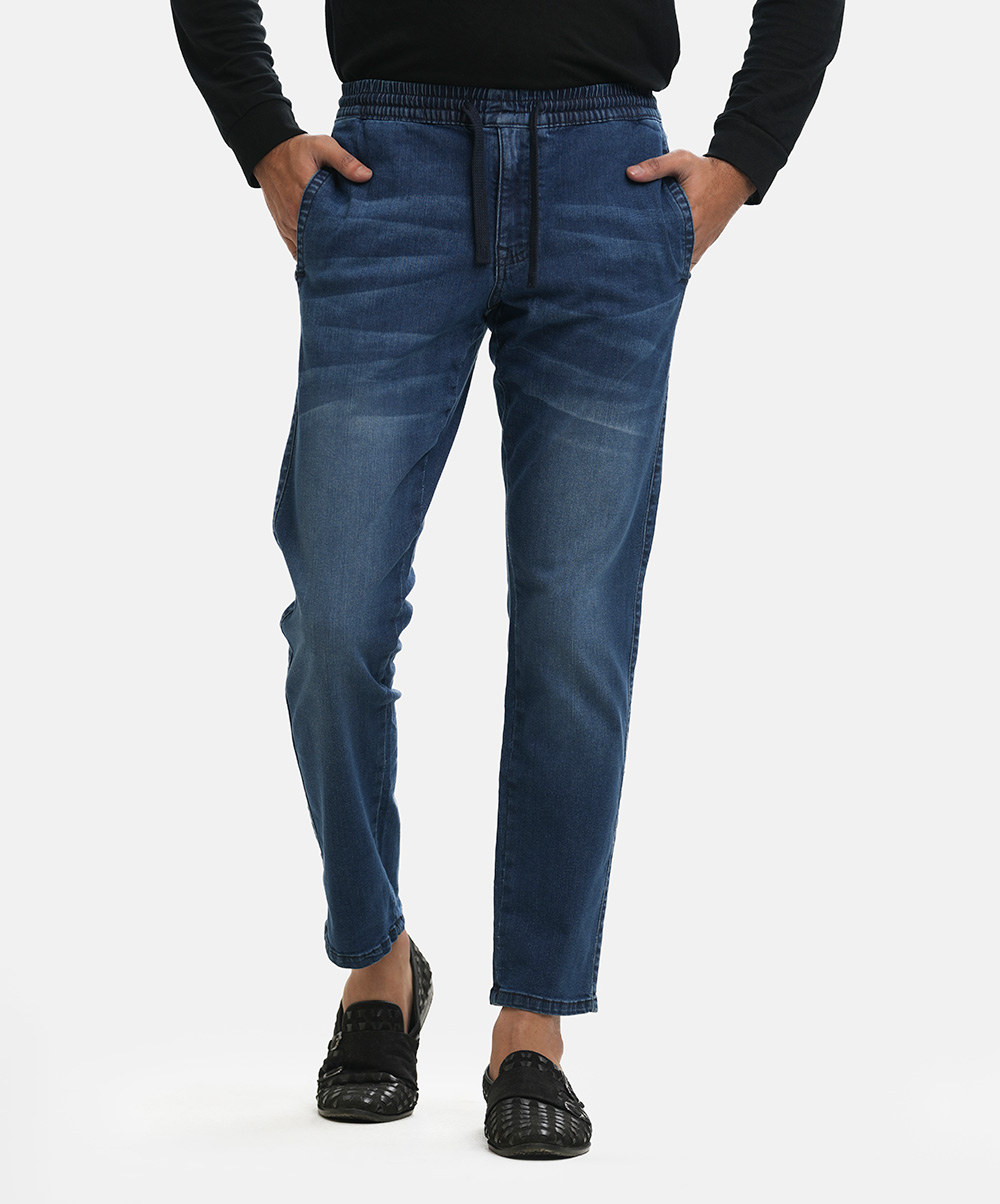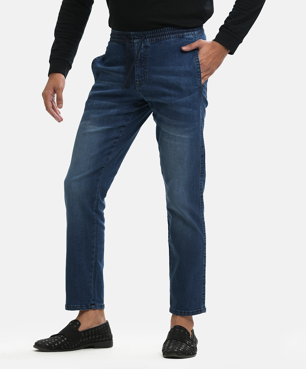 Men’s jeans pants in cotton blended denim fabric. Four pockets, concealed elasticated with cords and zipper fly.