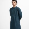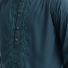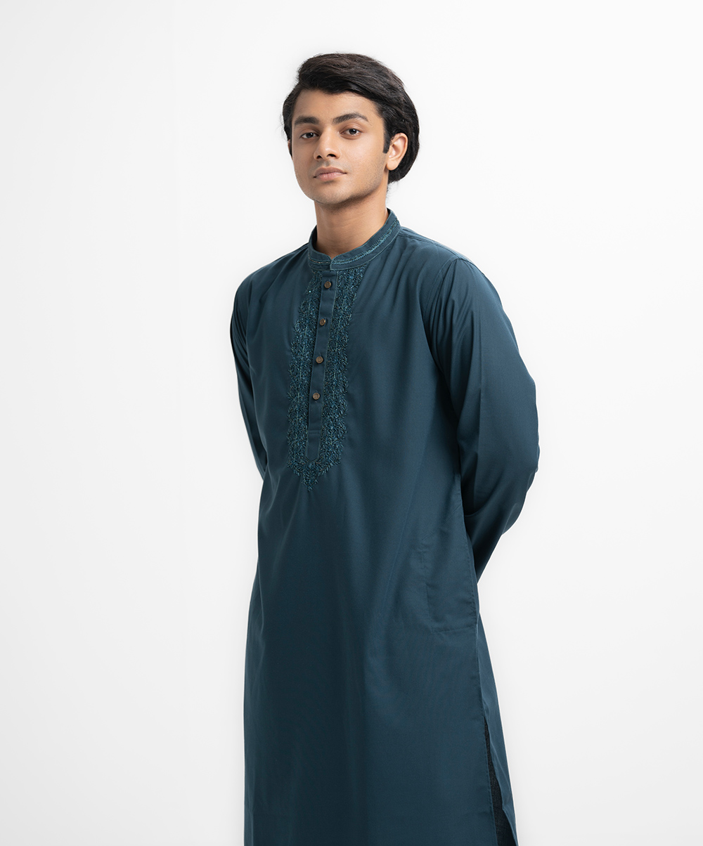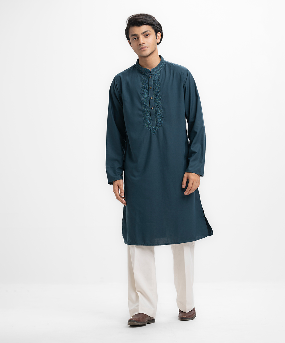Men’s premium panjabi in blended fabric. Karchupi at mandarin collar and metal buttons placket side. Full sleeves & inseam pockets.