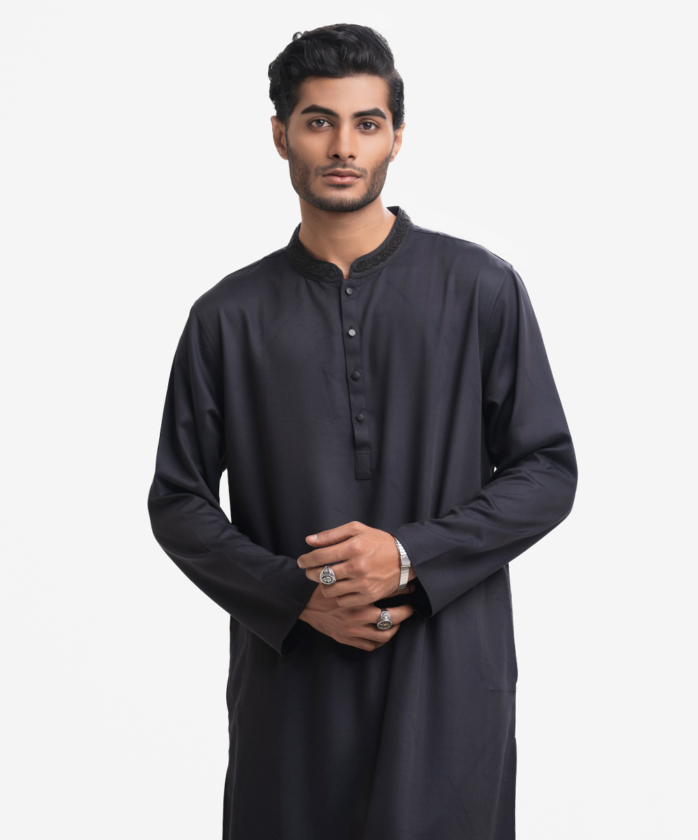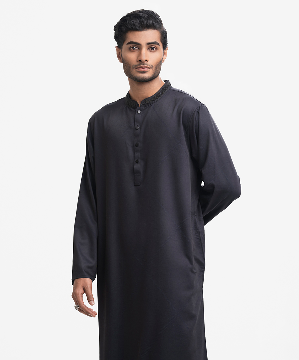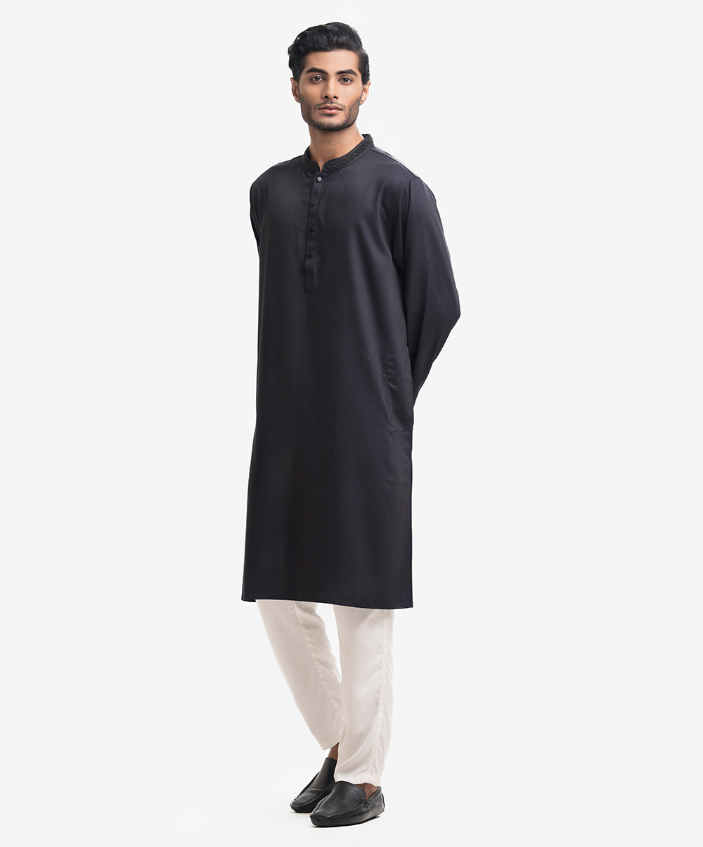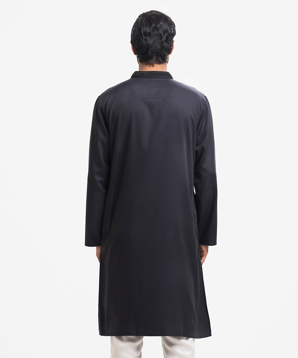 Men’s premium panjabi in jacquard fabric. Long sleeves, inseam side pockets. Karchupi on the collar.
