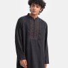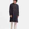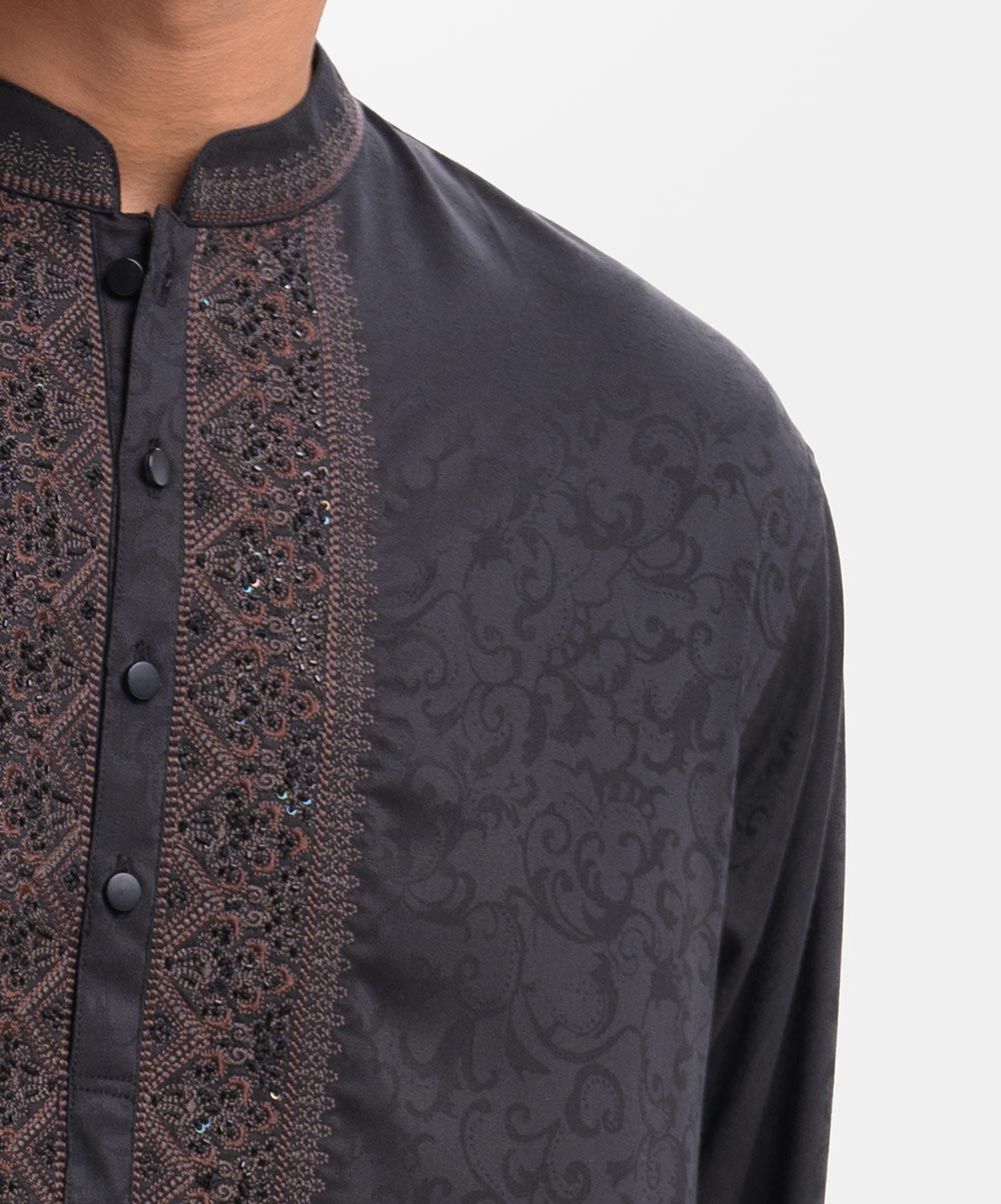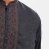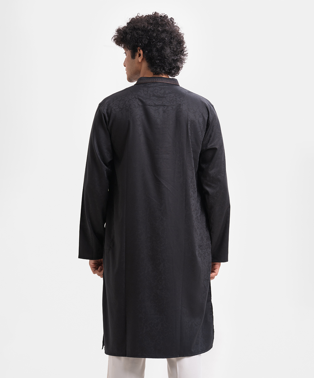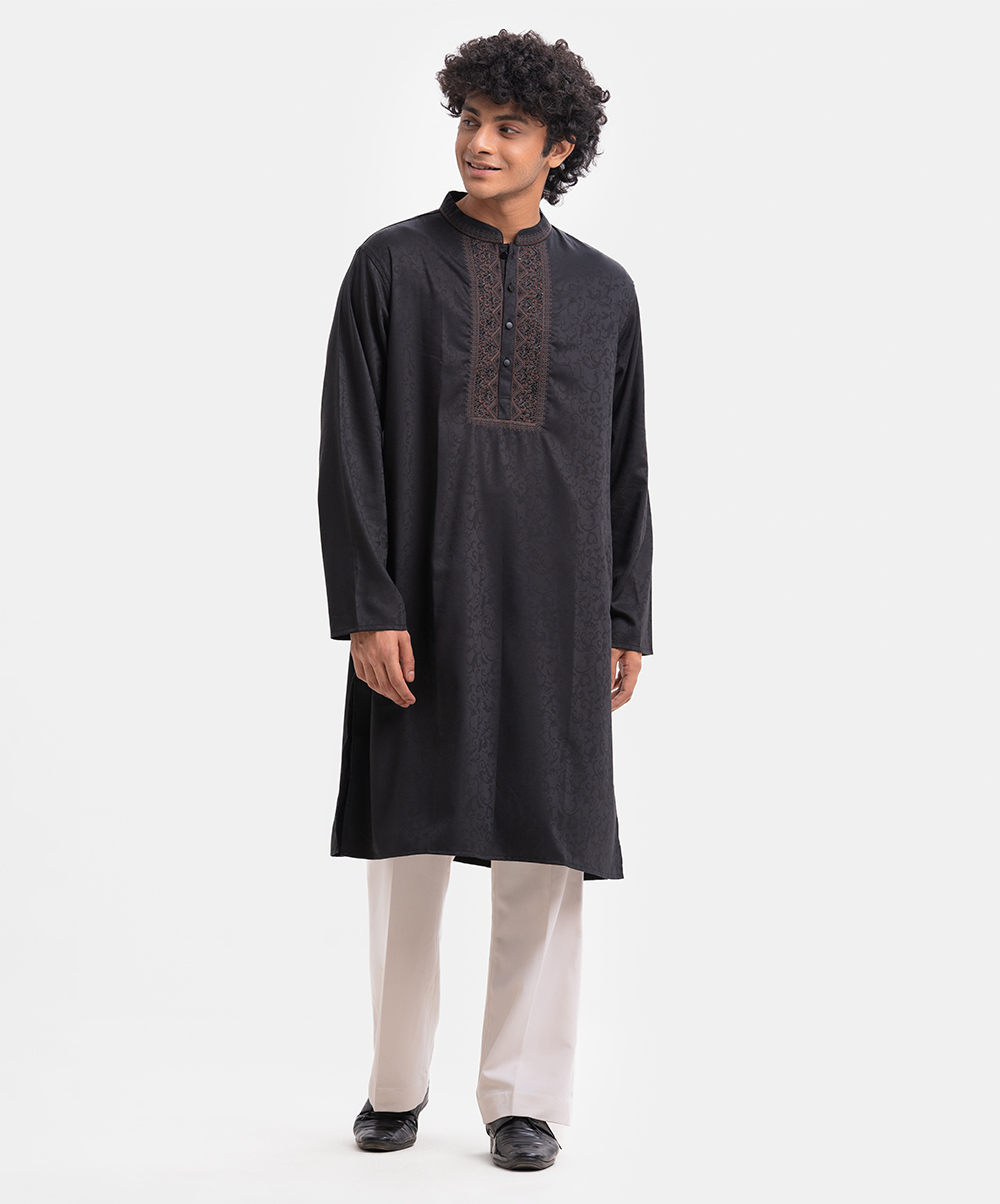 Men’s premium panjabi in jacquard fabric. Mandarin collar with metal buttons placket, full sleeves. Karchupi & embroidery at front.