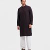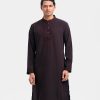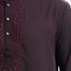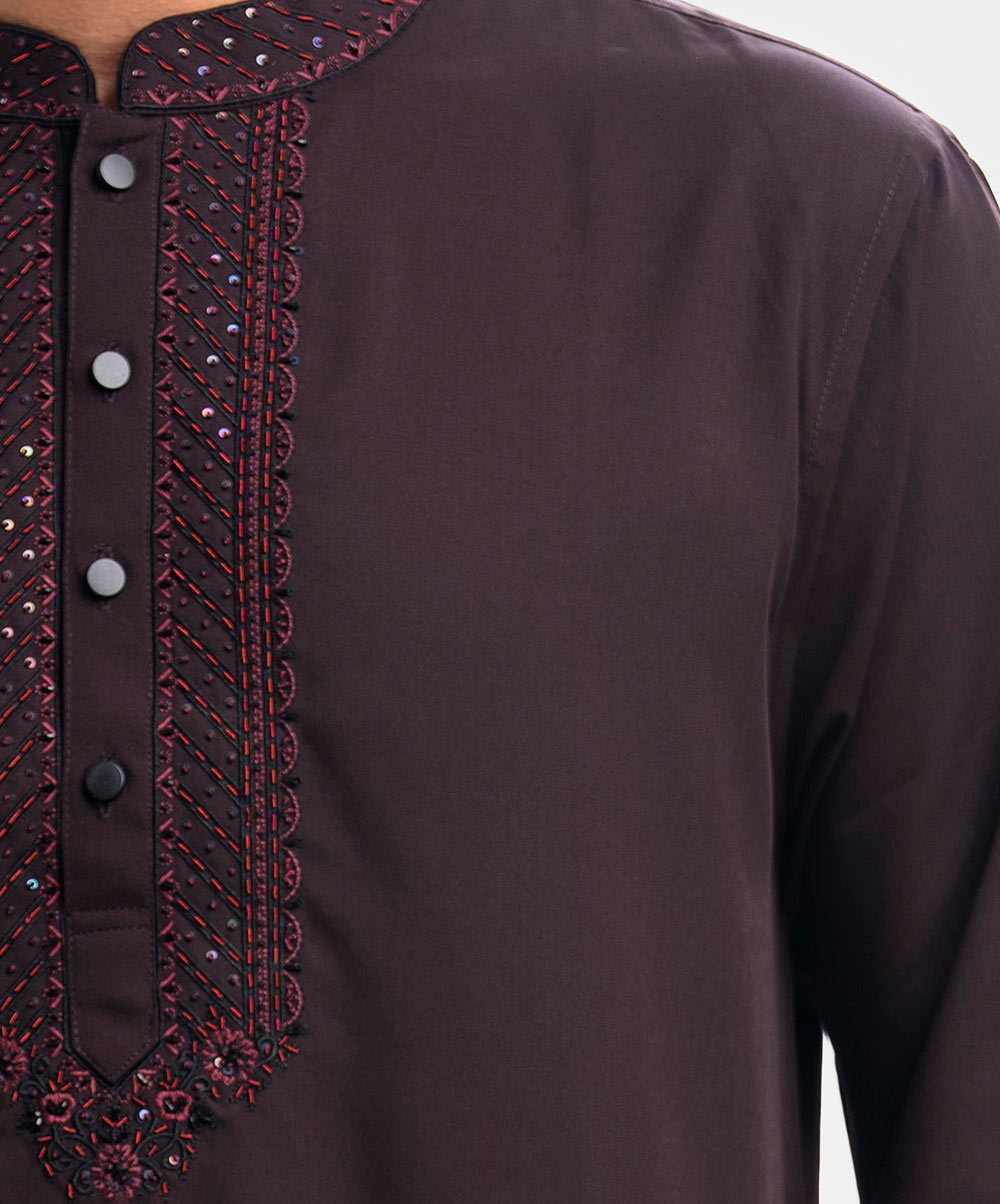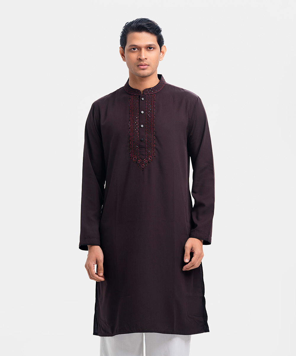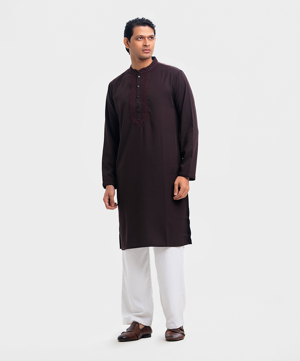 Chocolate brown premium panjabi in blended fabric. Karchupi and embroidery work on the collar and placket.