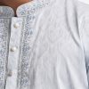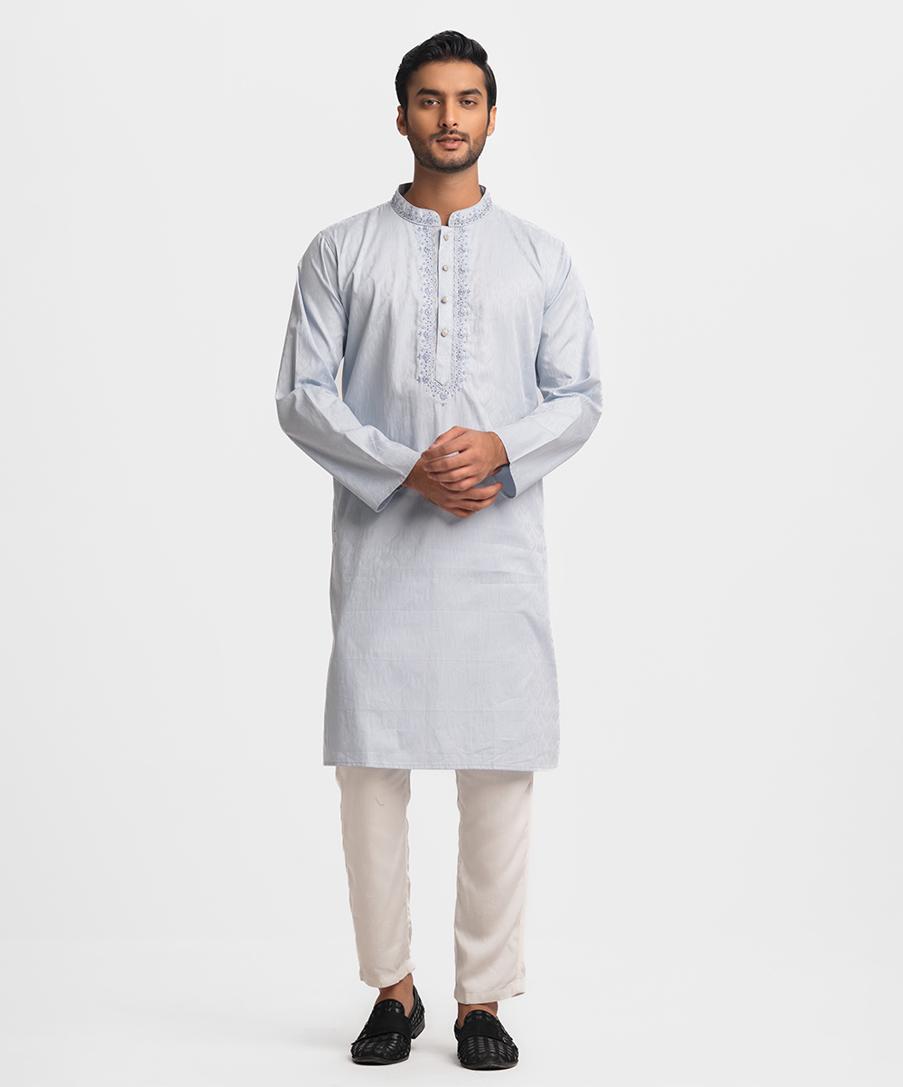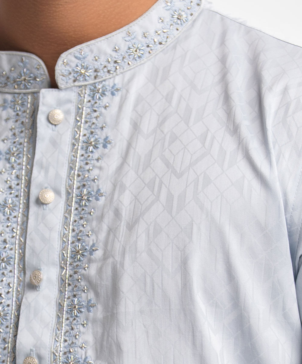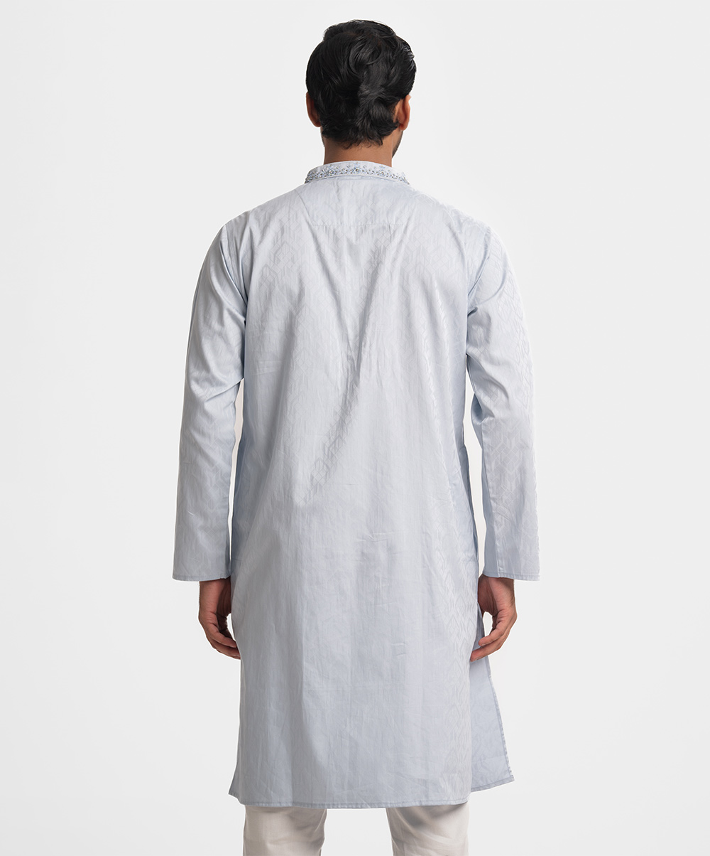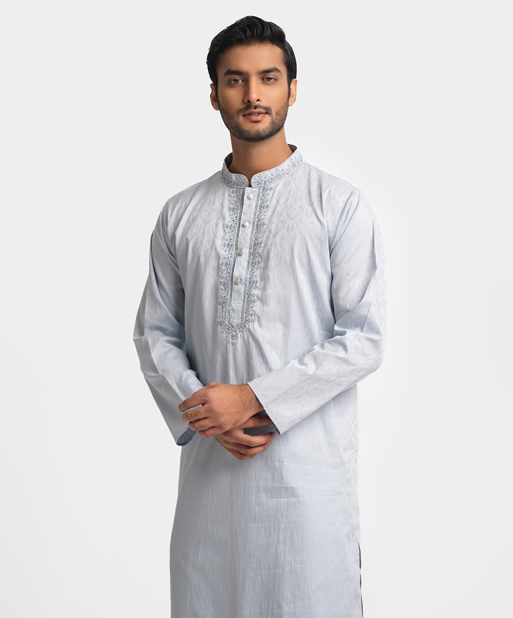 Men’s premium panjabi in jacquard fabric. Mandarin collar with metal buttons placket, full sleeves. Karchupi & embroidery at front.