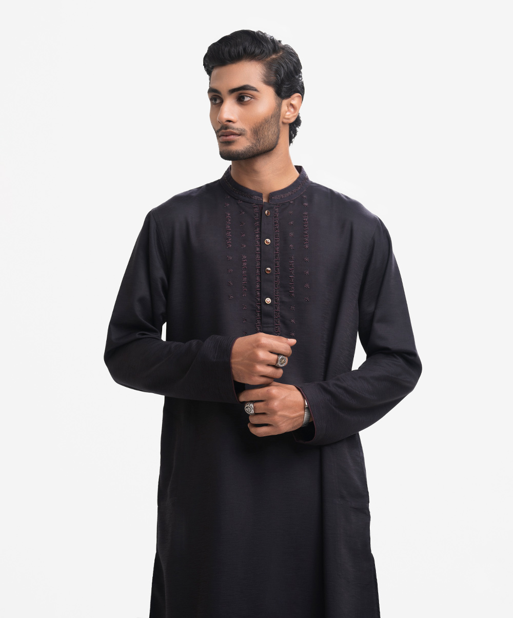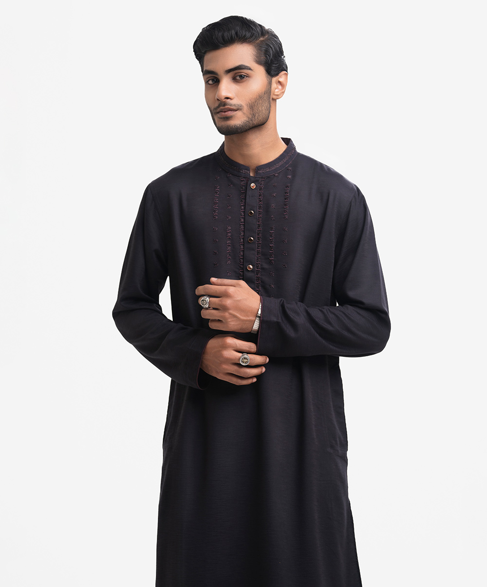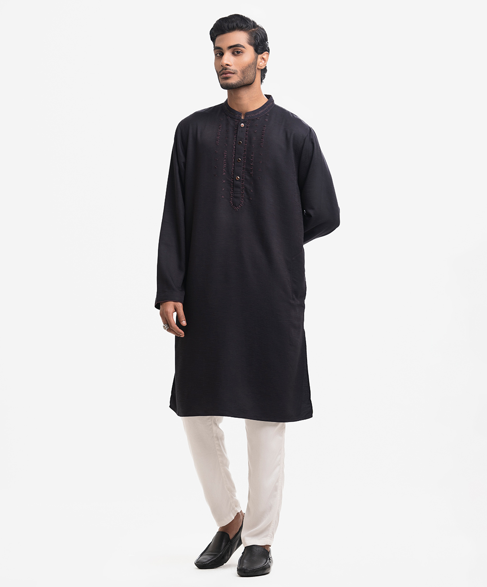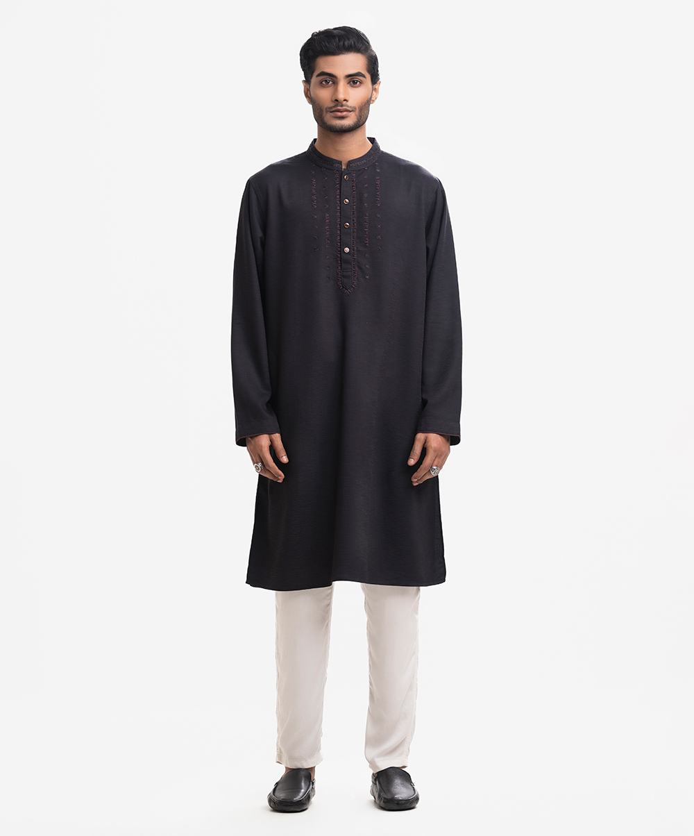 Premium panjabi in artificial silk fabric with karchupi on the collar and chest. Long sleeves, inseam side pockets.