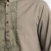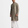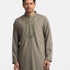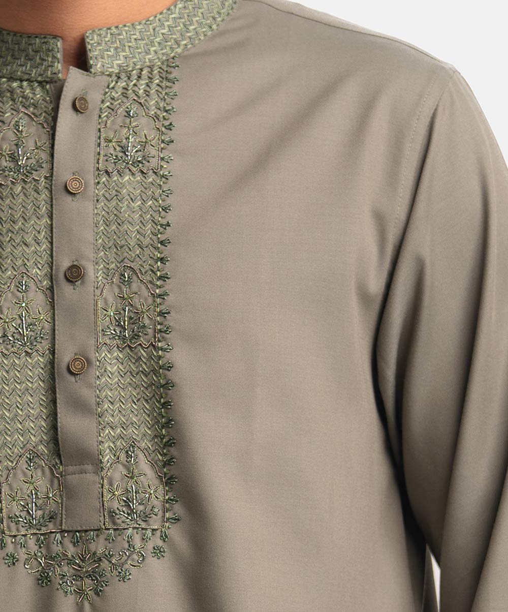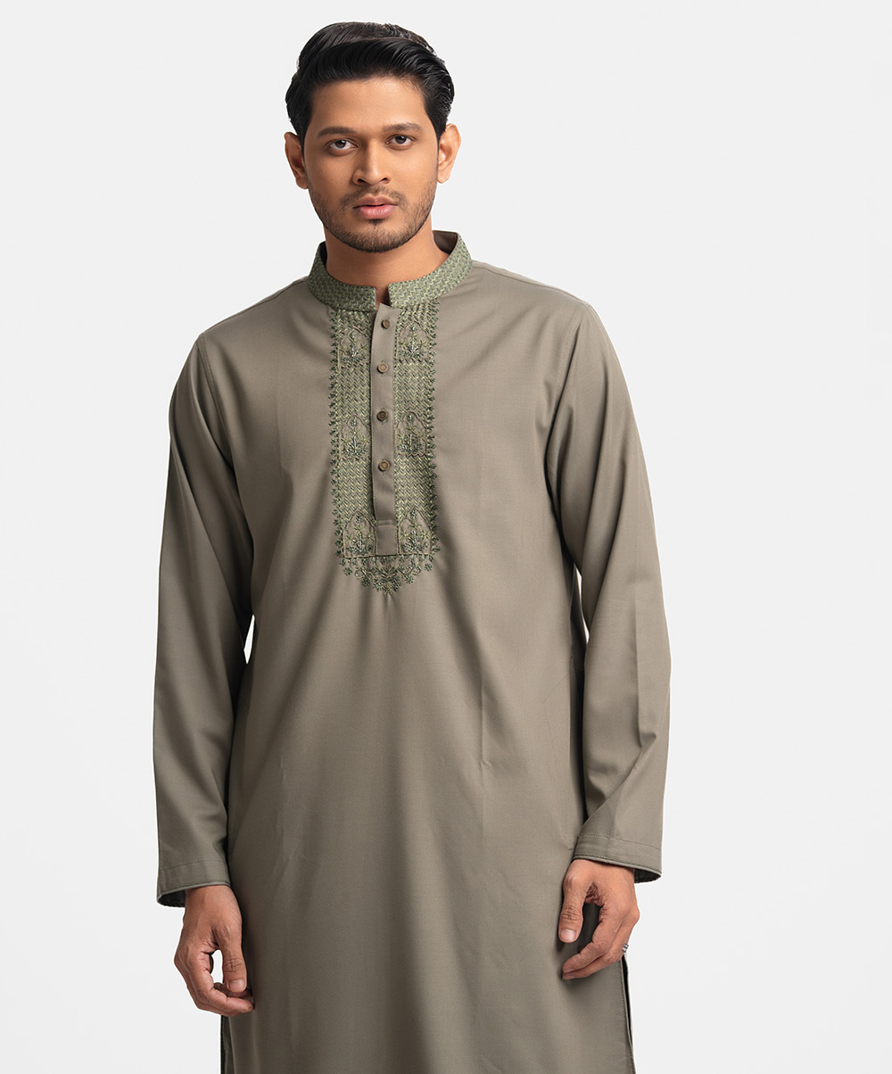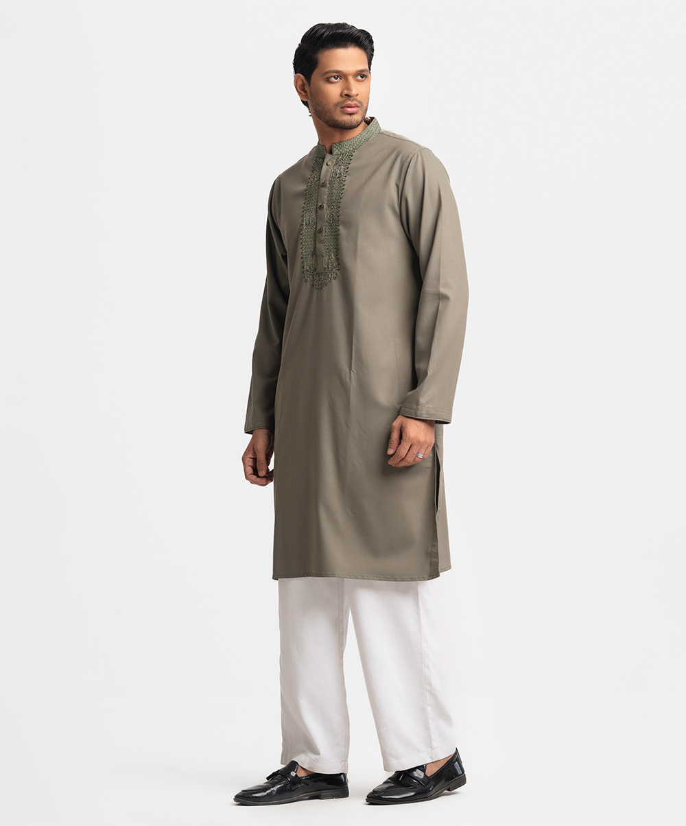 Men’s premium panjabi in blended fabric. Karchupi at mandarin collar and metal buttons placket side. Full sleeves & inseam pockets.