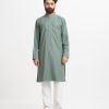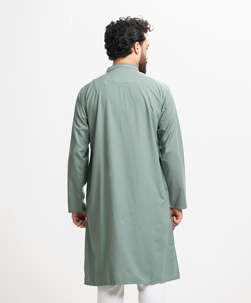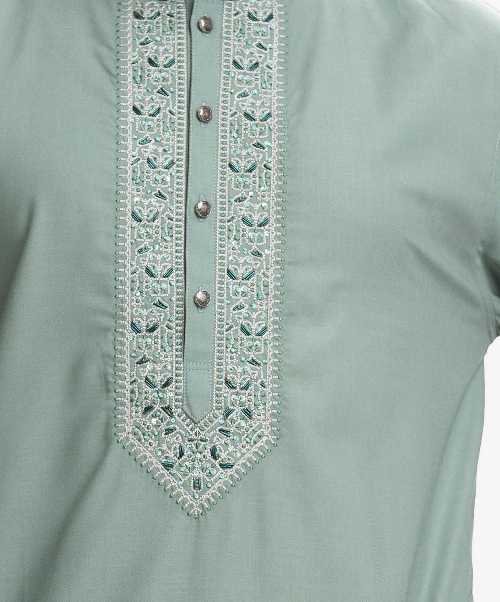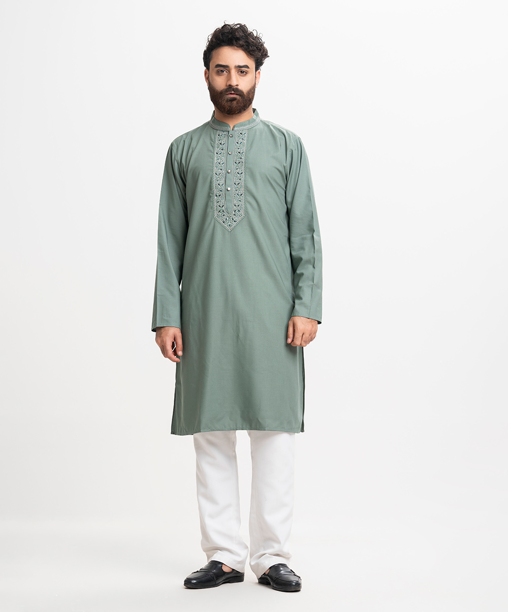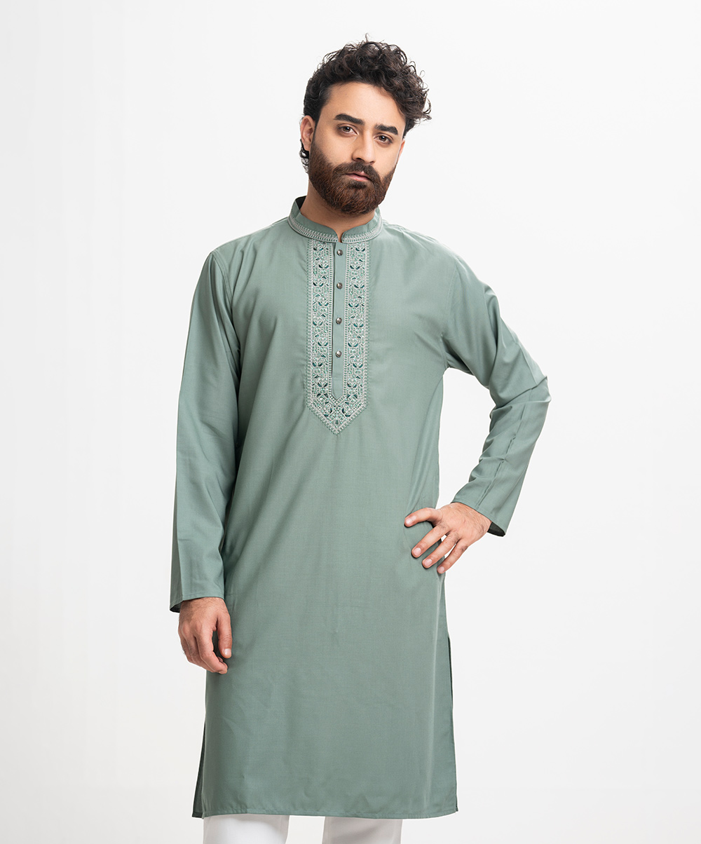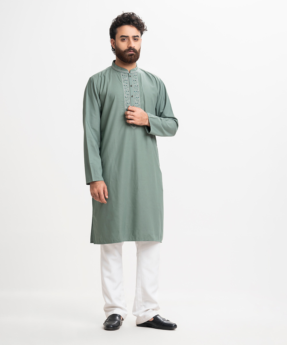 Premium panjabi in viscose fabric with karchupi and embroidery on collar and yoke.