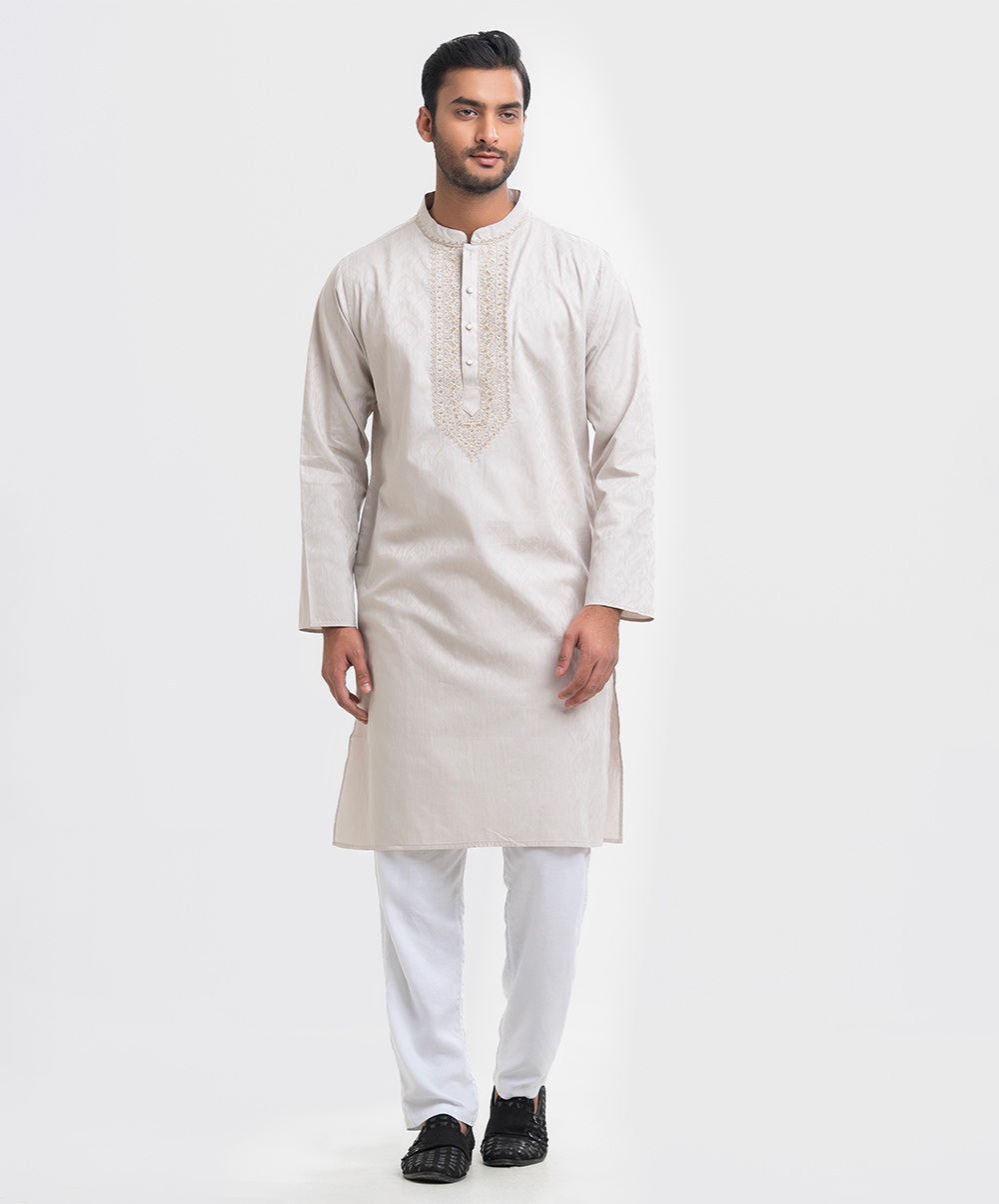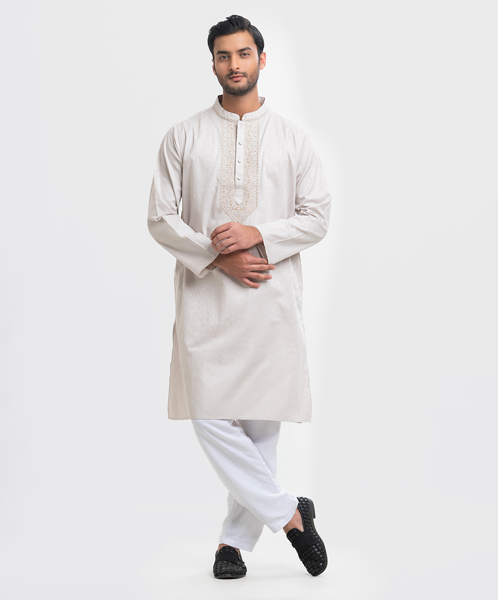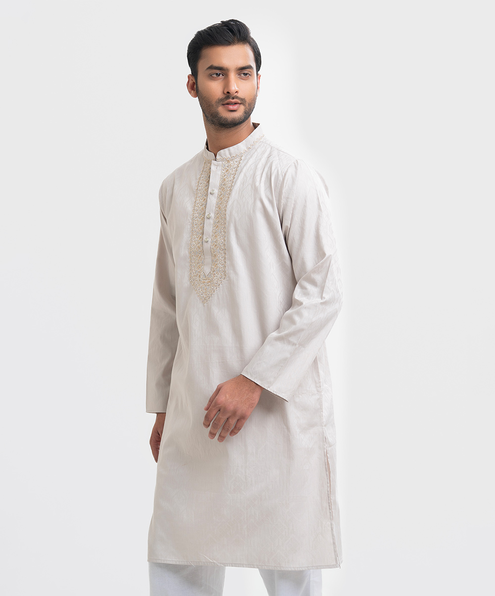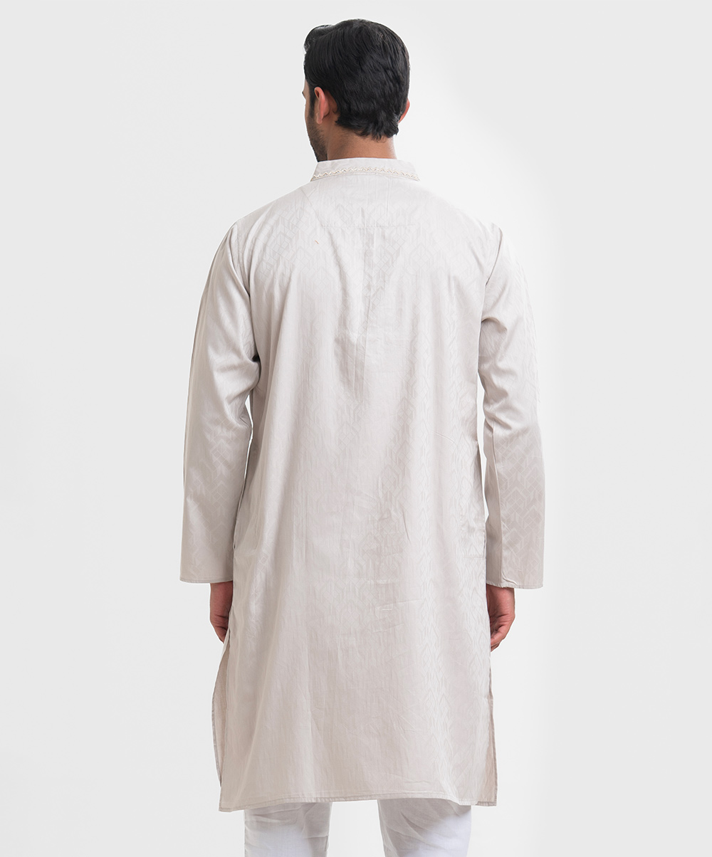 Men’s premium panjabi in jacquard fabric. Long sleeves, inseam side pockets. Karchupi on the collar and placket.