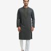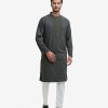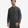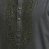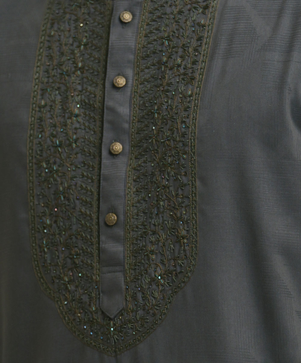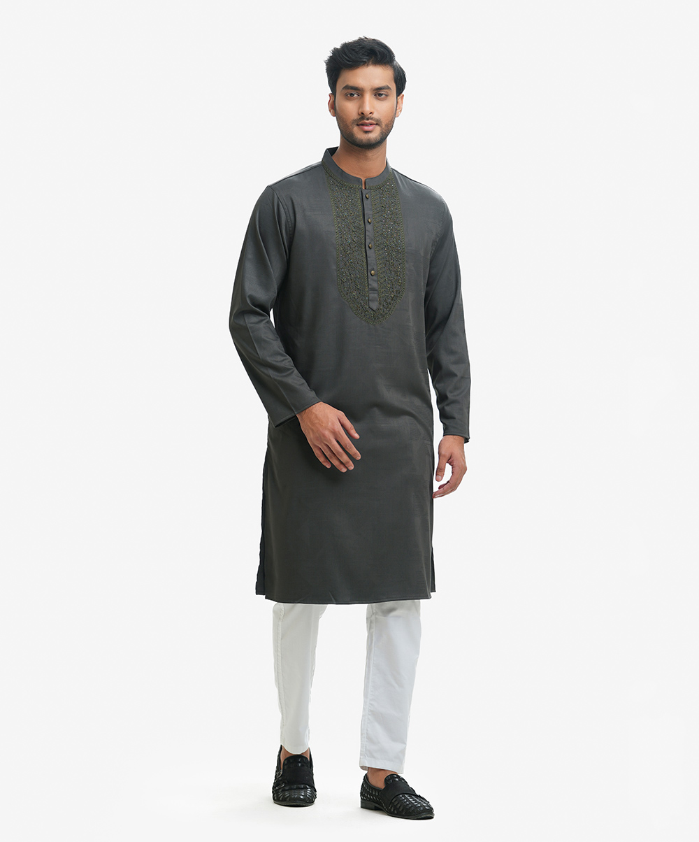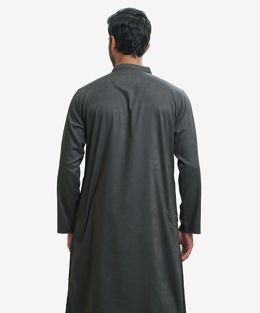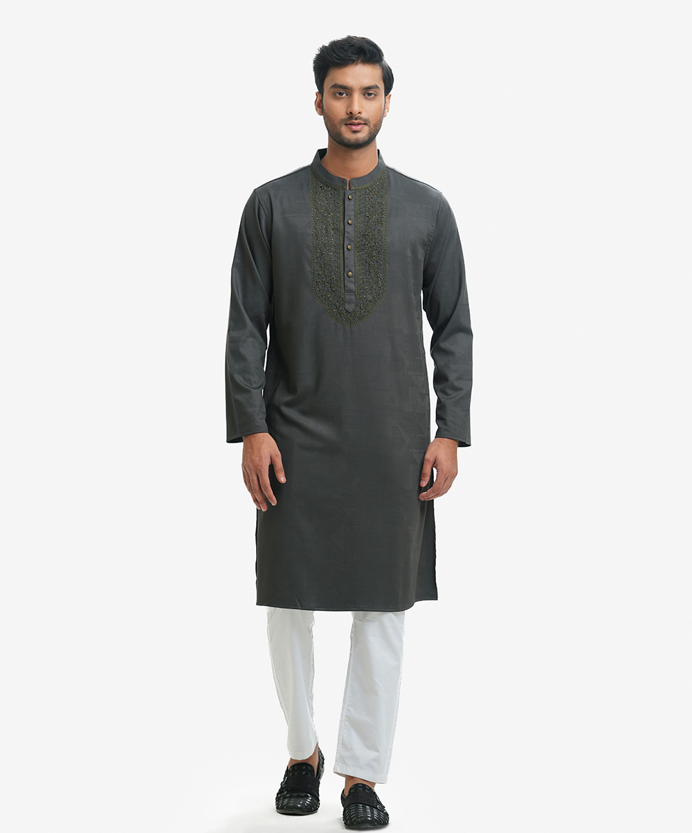 Premium semi-fitted panjabi in cotton bamboo jacquard fabric. Karchupi and handstitch details at the collar and yoke. Long sleeves, inseam side pockets.