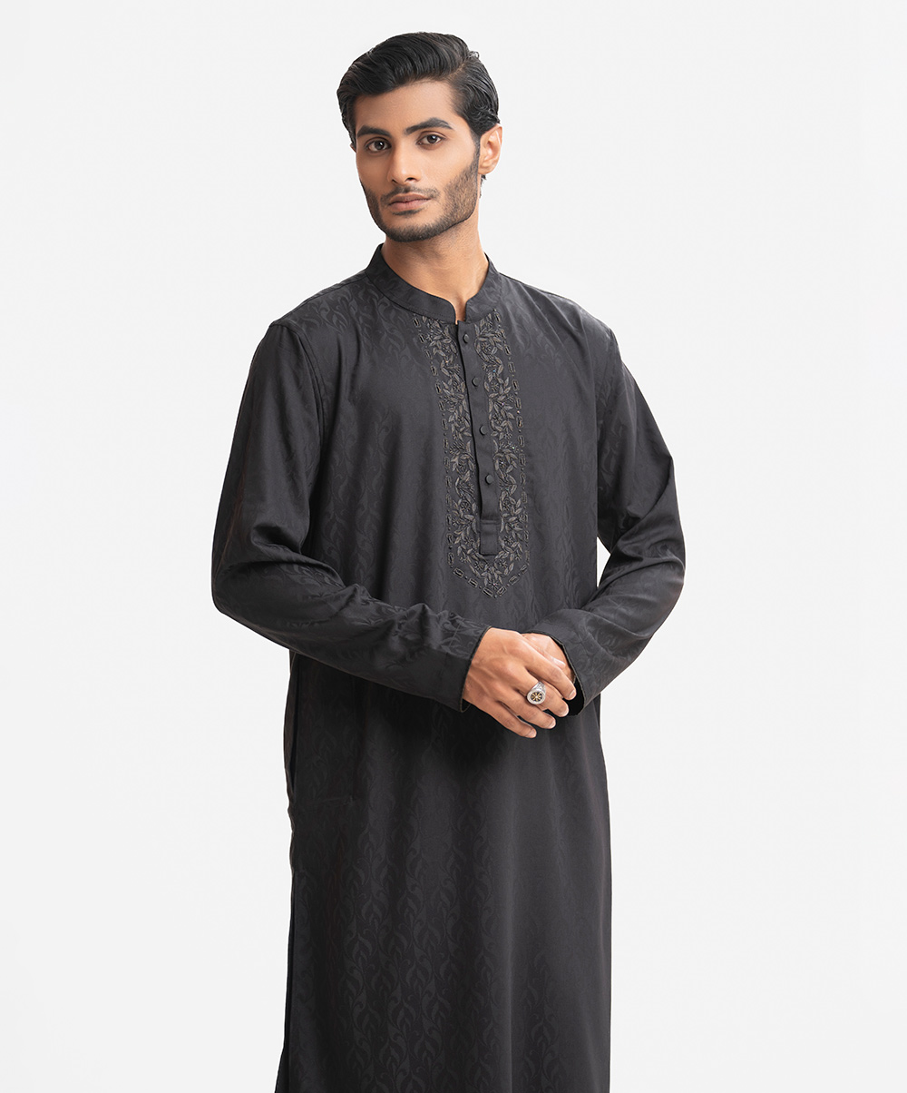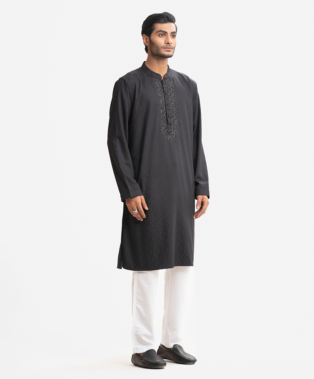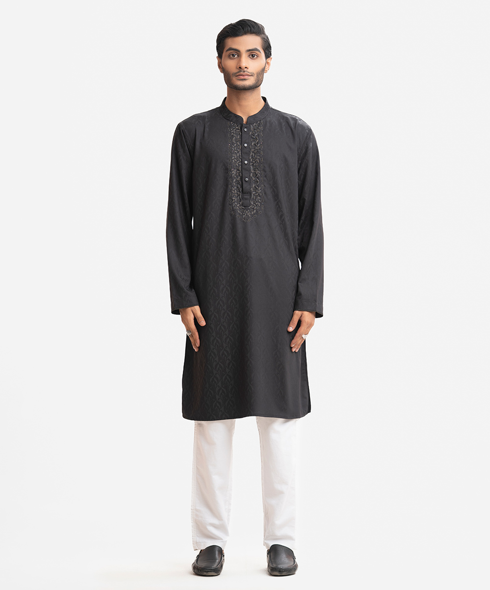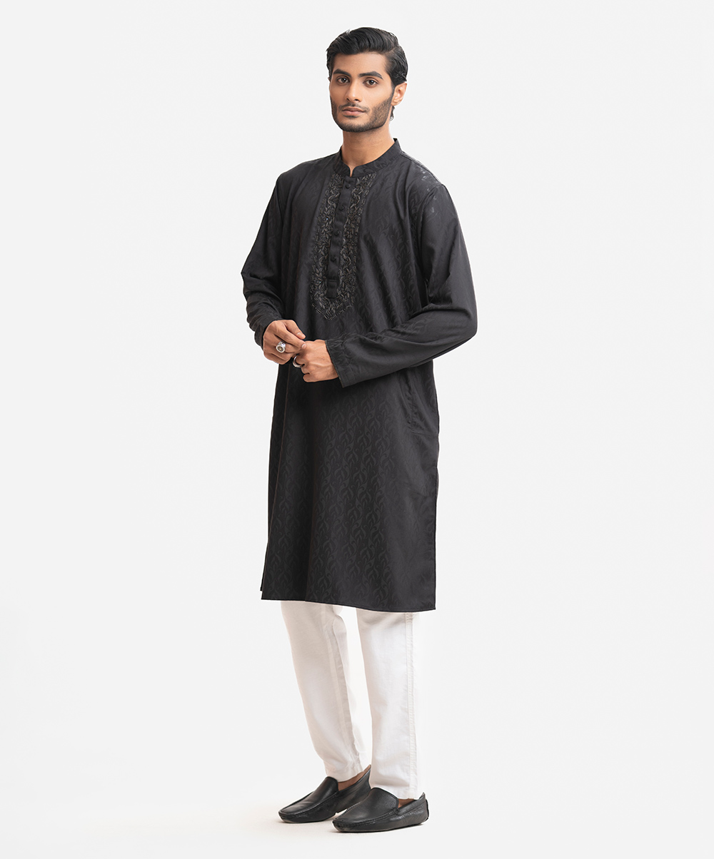 Men’s premium panjabi in bamboo jacquard fabric. Mandarin collar with metal buttons placket, full sleeves. Karchupi at front.