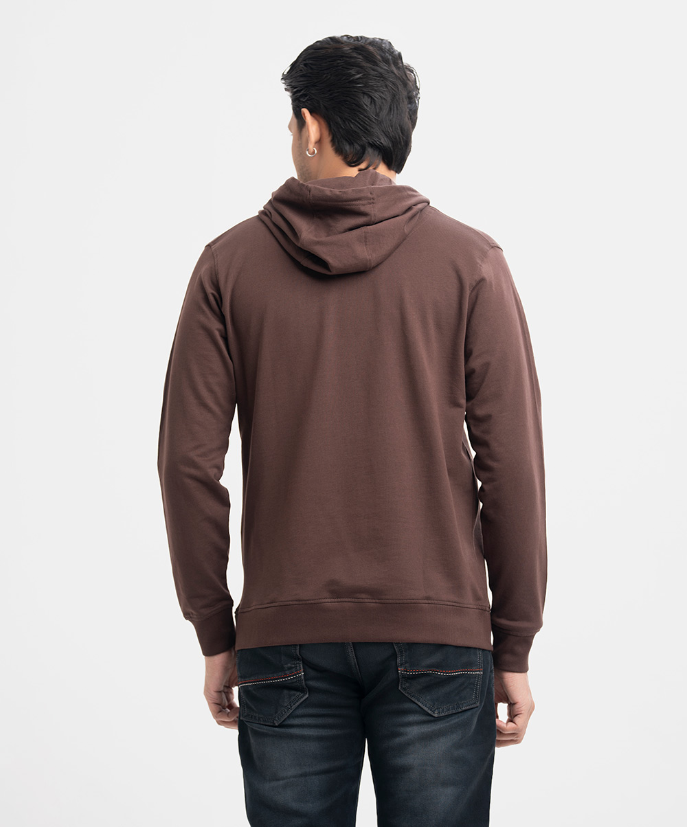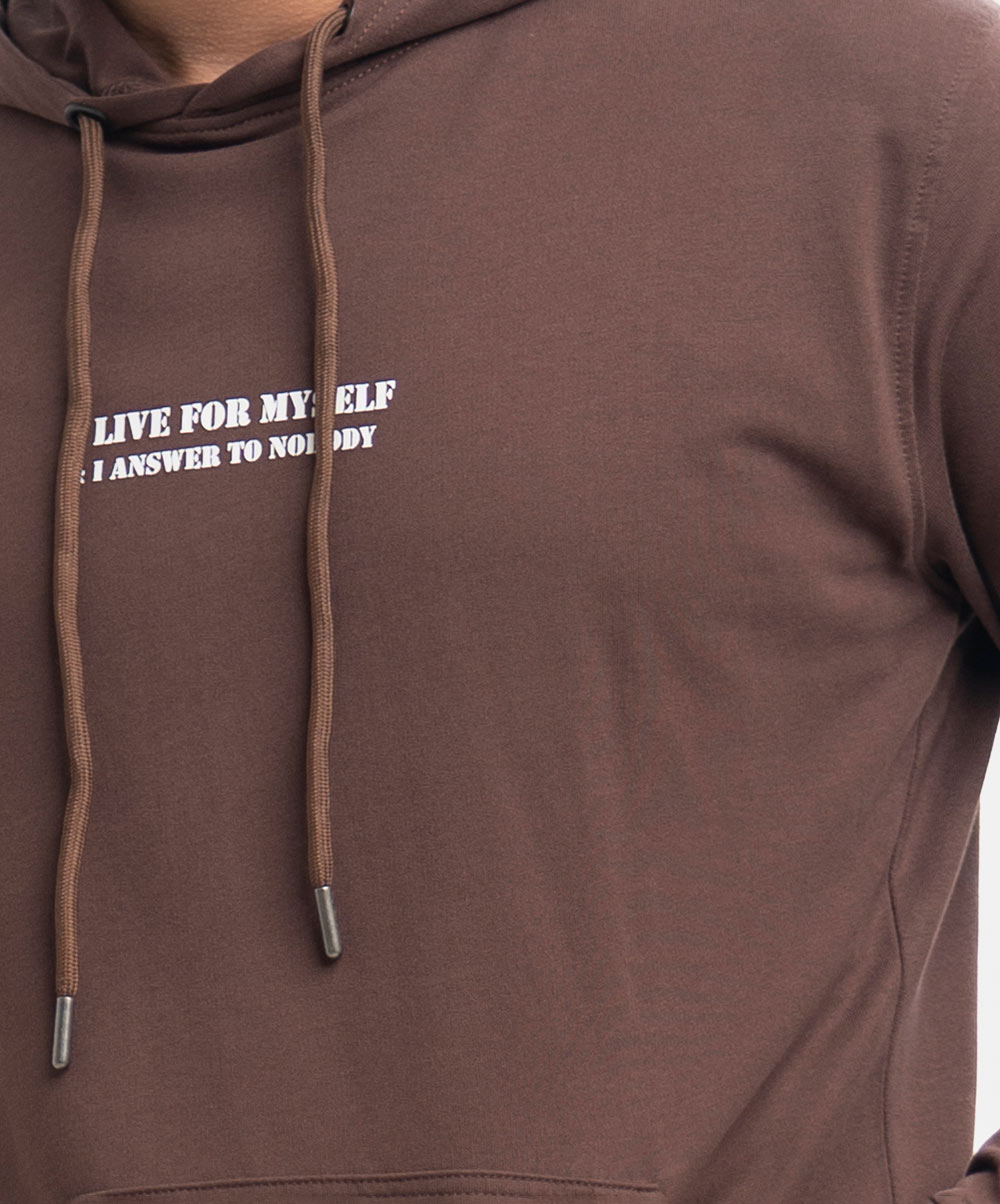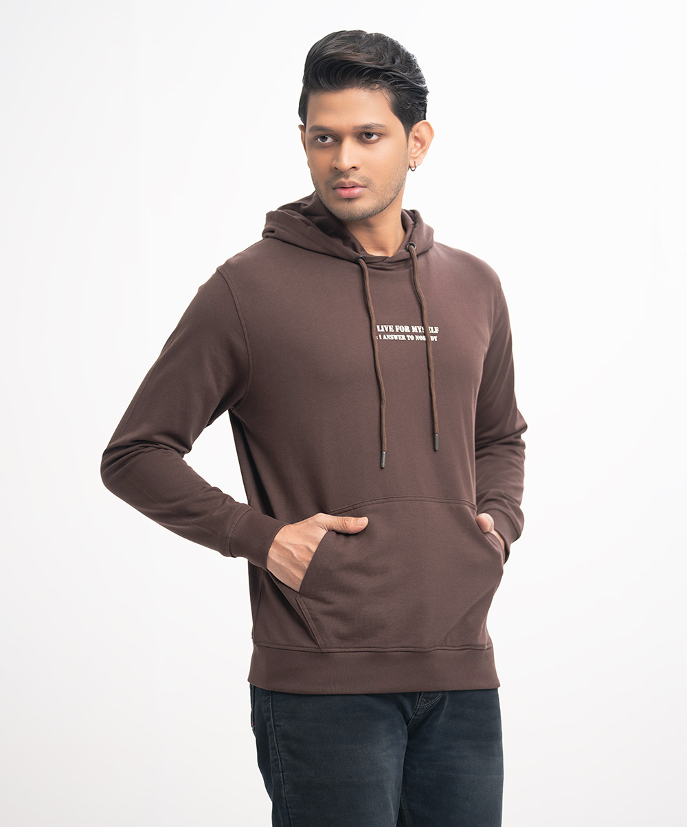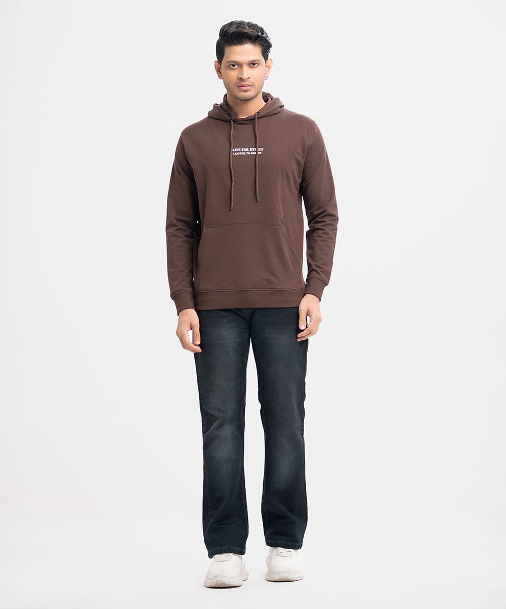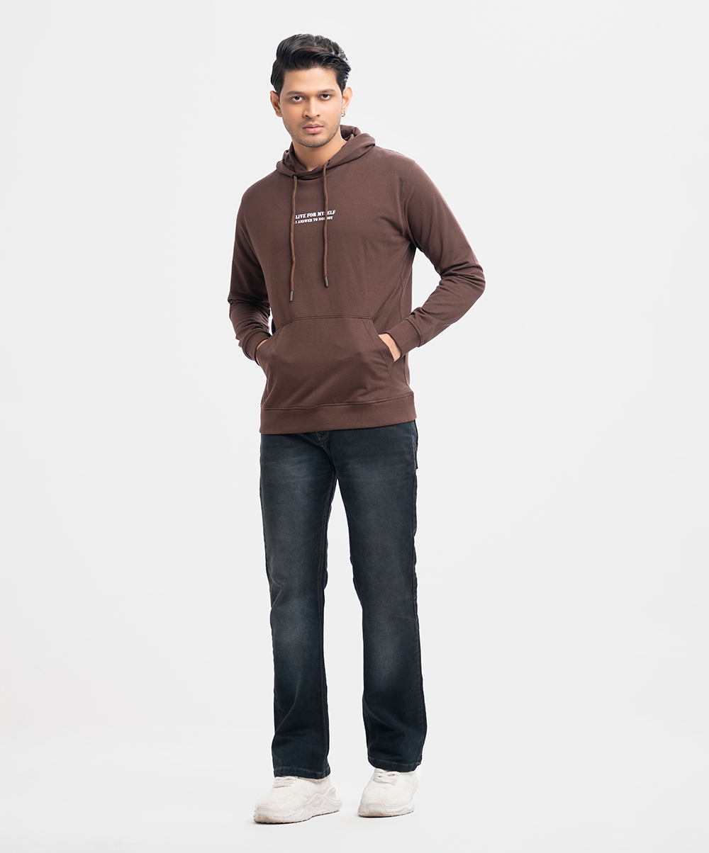 Men’s winter hoodie sweat shirt in cotton terry fabric. Adjustable drawstring at hood, full sleeves. Typography print at front with kangaroo pockets.