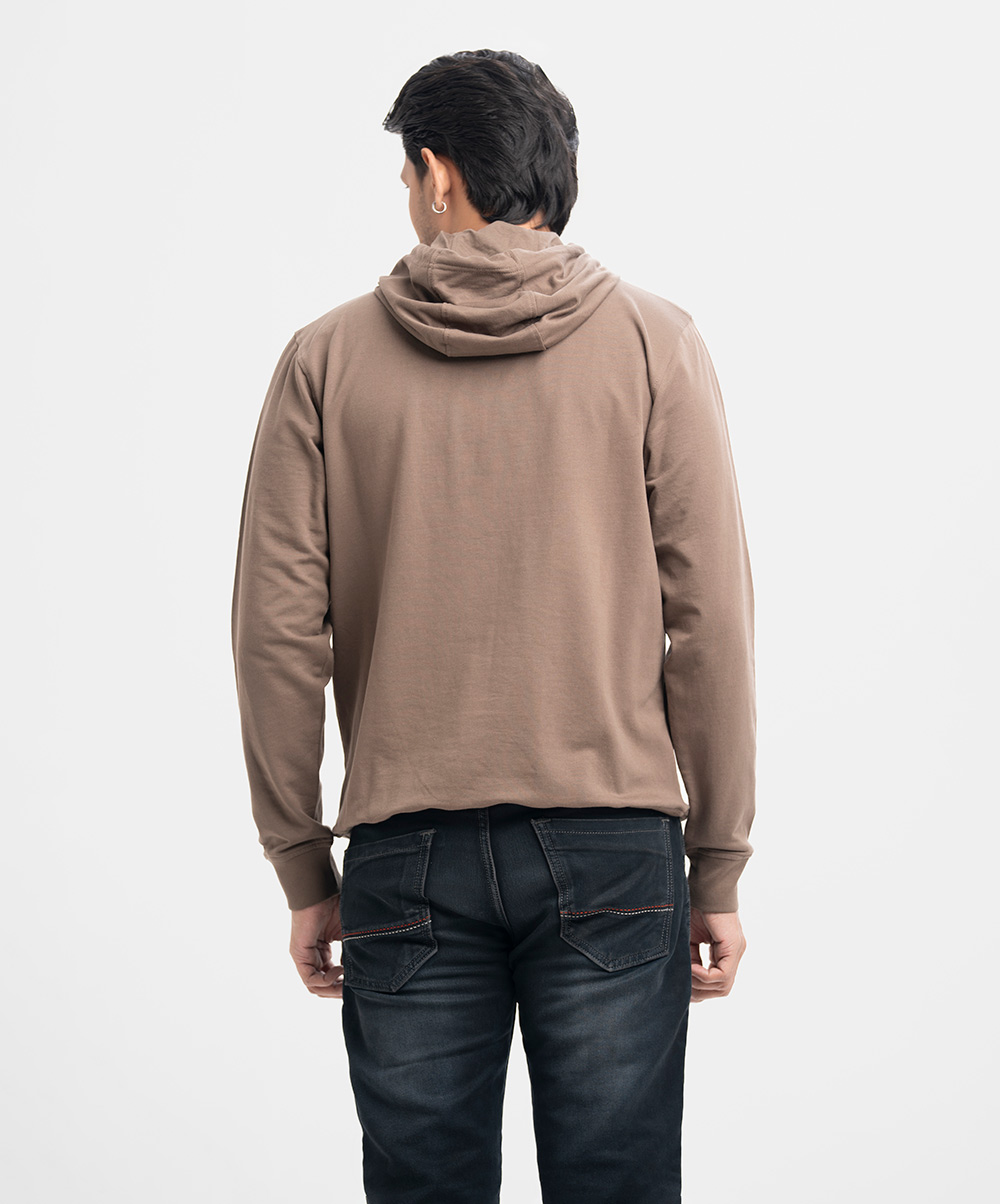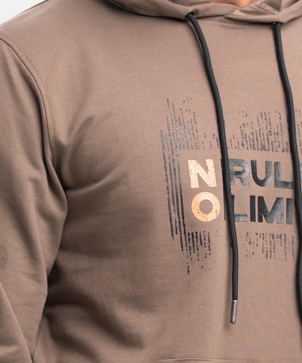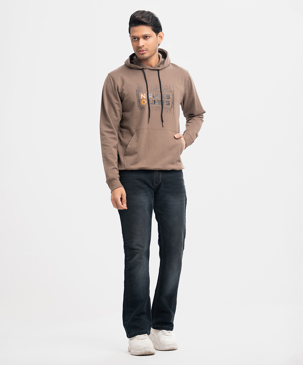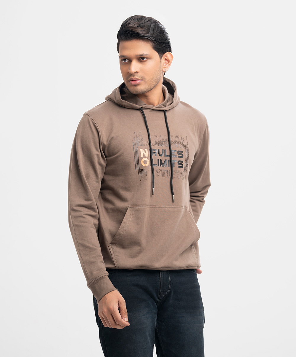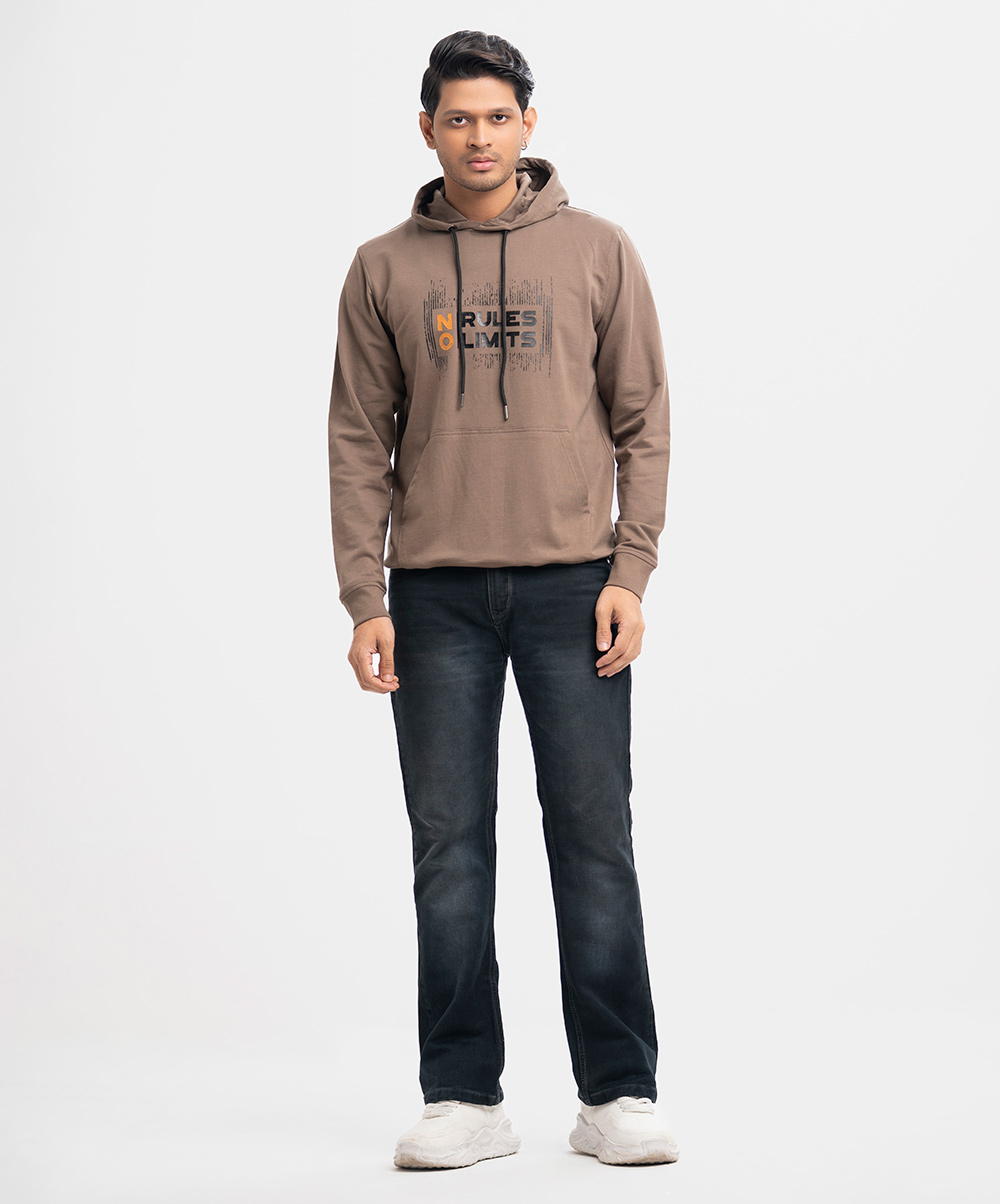 Men’s winter hoodie sweat shirt in cotton single jersey fabric. Adjustable drawstring at hood, full sleeves. Typography print at front with kangaroo pockets.