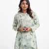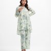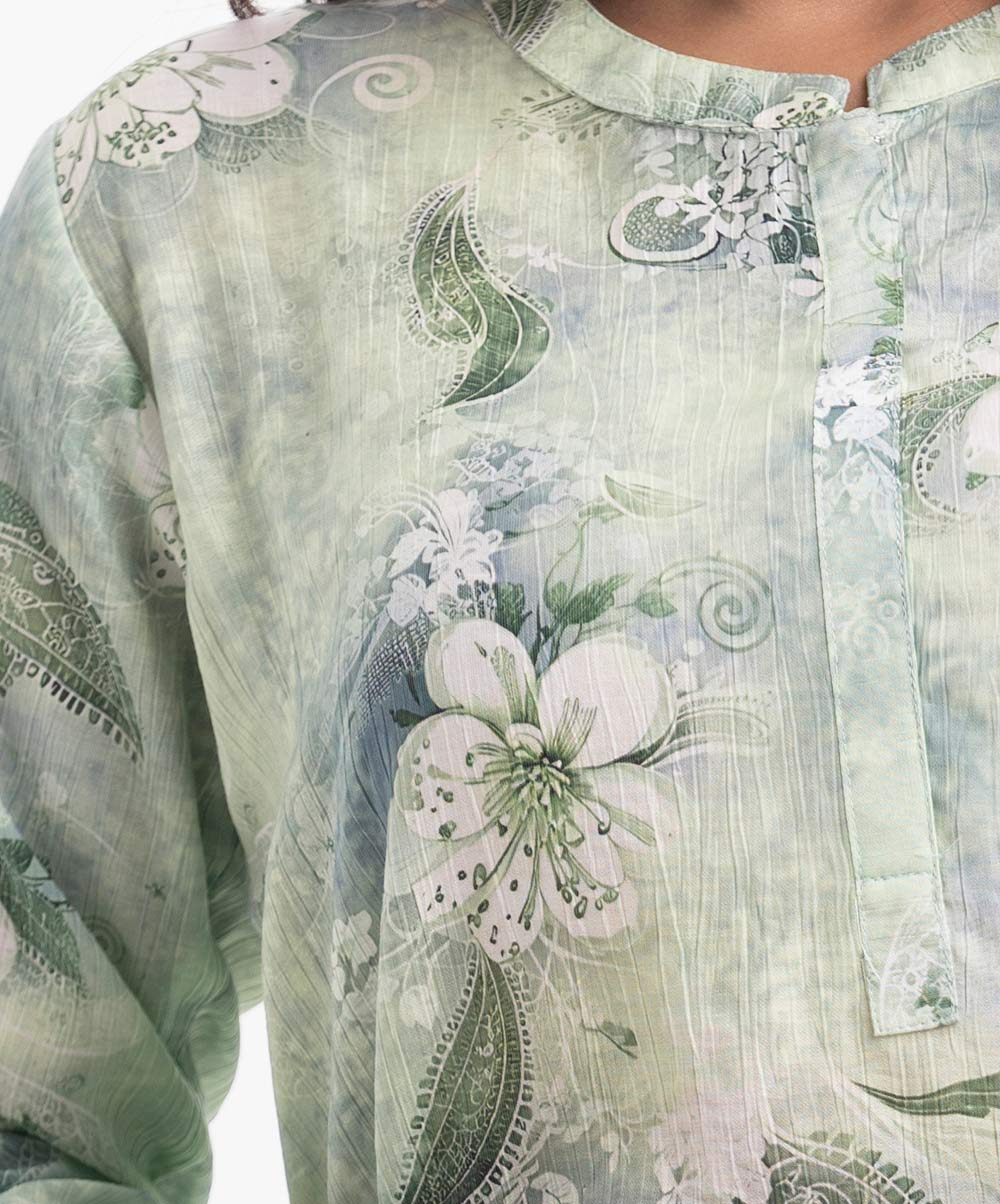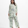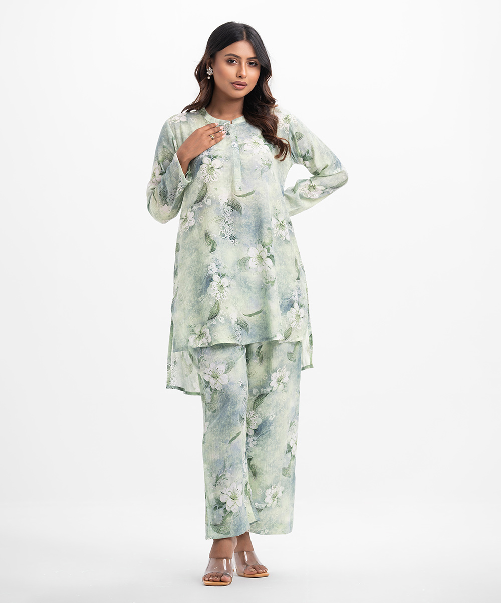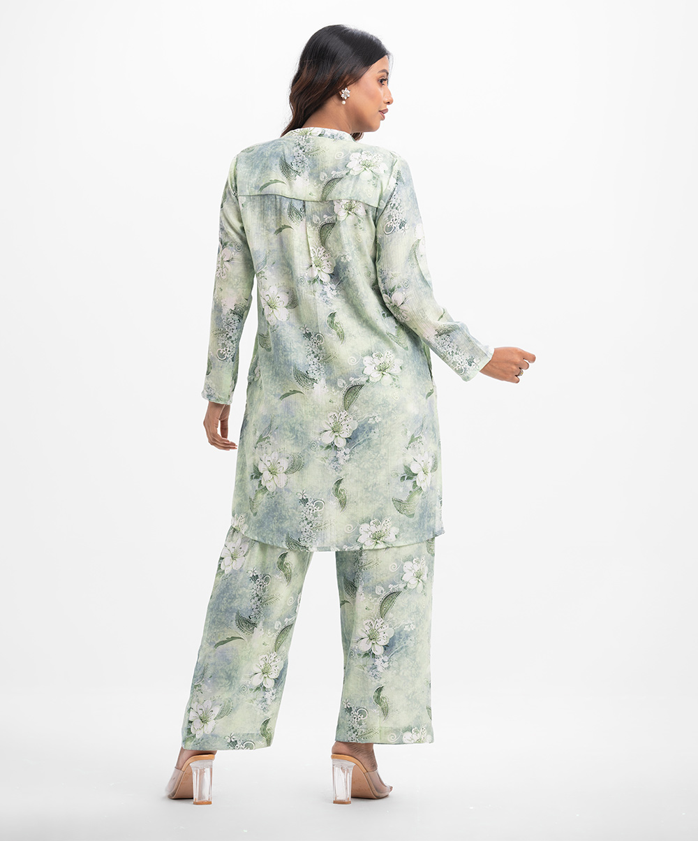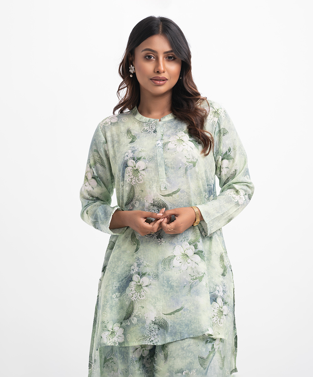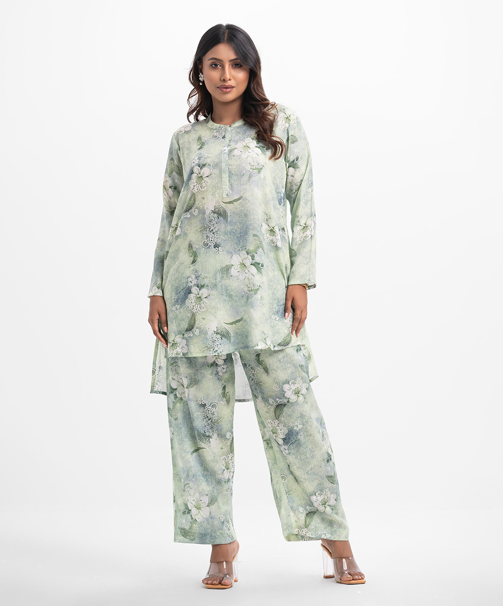 Women’s top bottom set in printed blended cotton fabric. Stand collar, full sleeves and high-low hem top. Palazzo pants as the bottom.