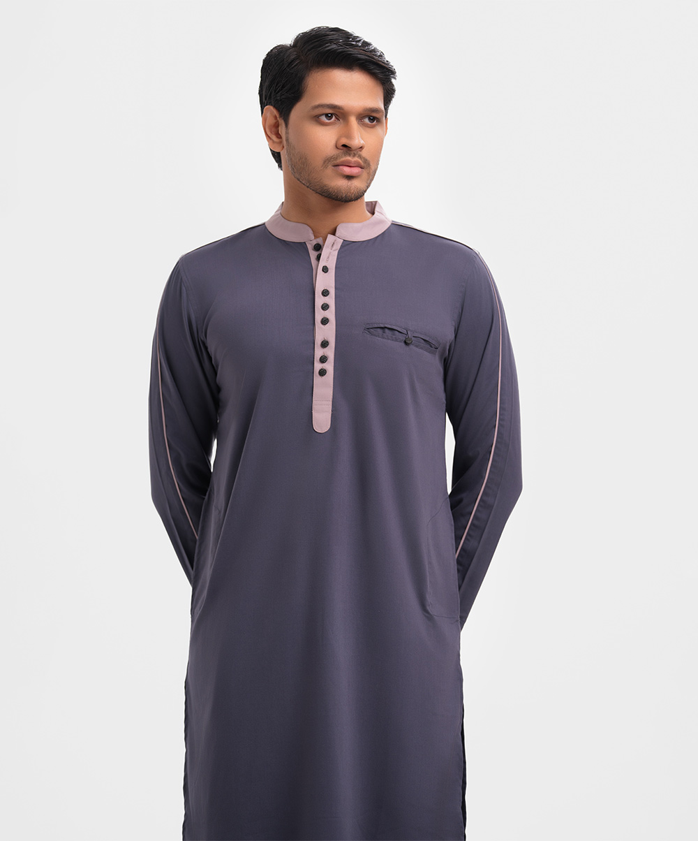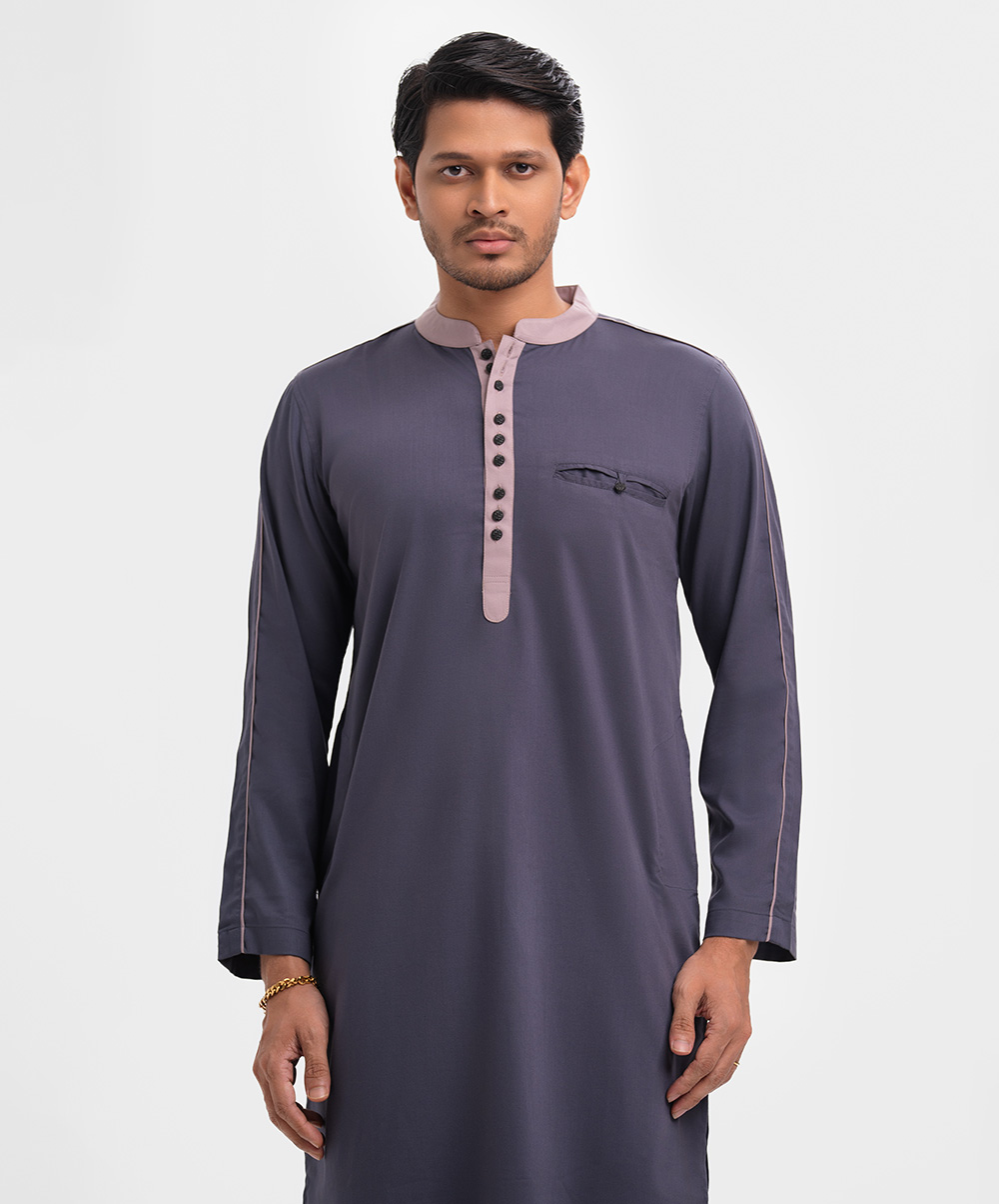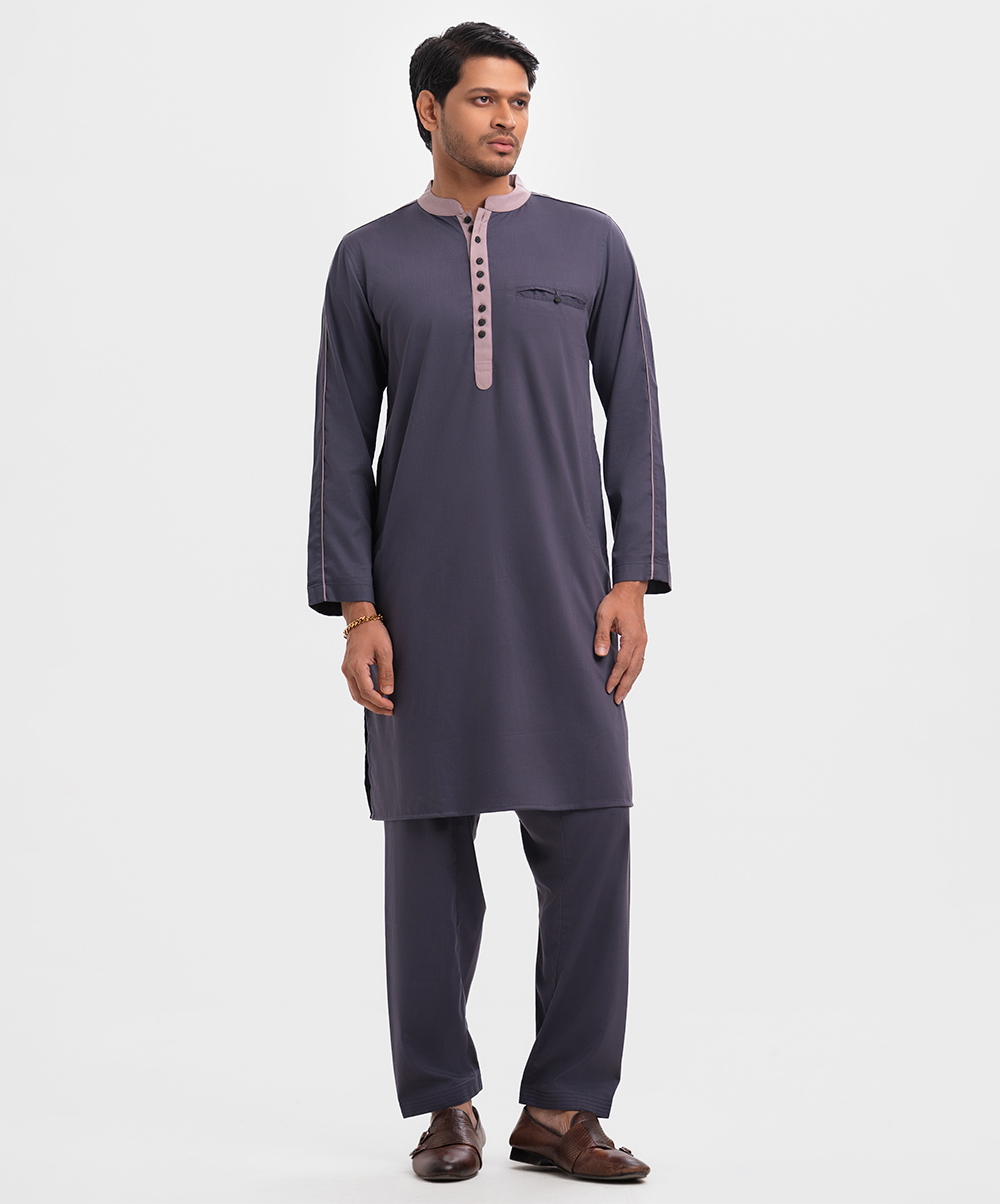 Comfortable and trendy kabli panjabi and pajama set. Matching patch attached on the collar and placket. Single button pocket on the chest.