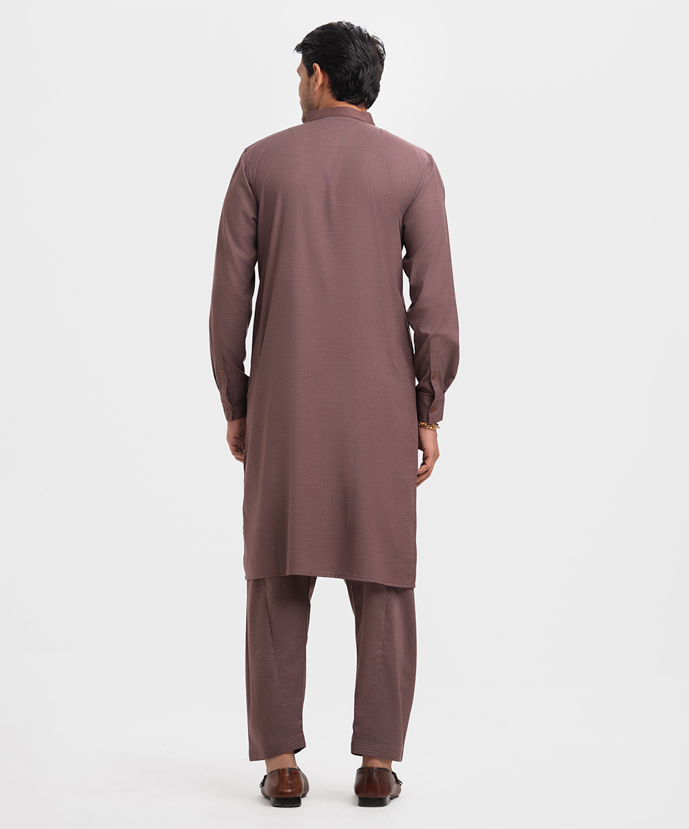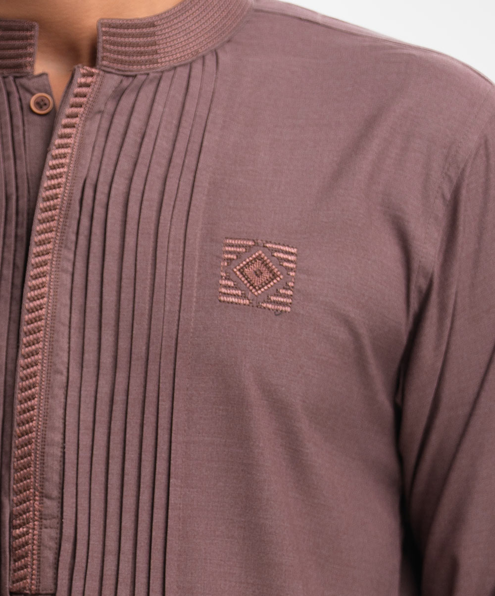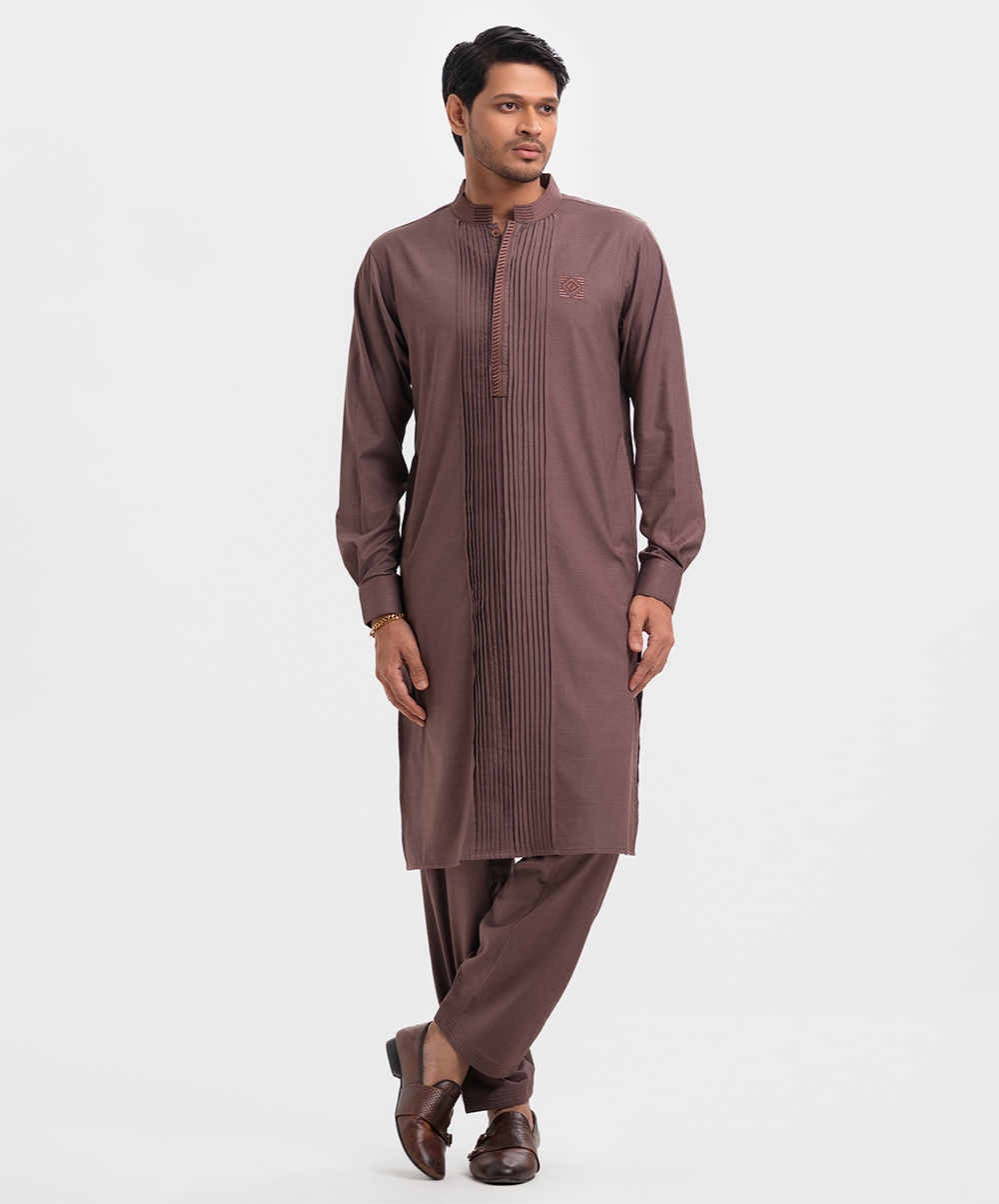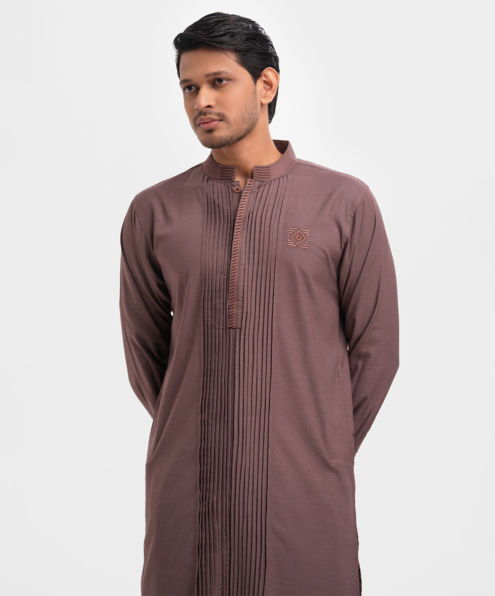 Comfortable and trendy kabli panjabi and pajama set. Embroidery on the band collar, placket and chest. Pintuck details at the front.