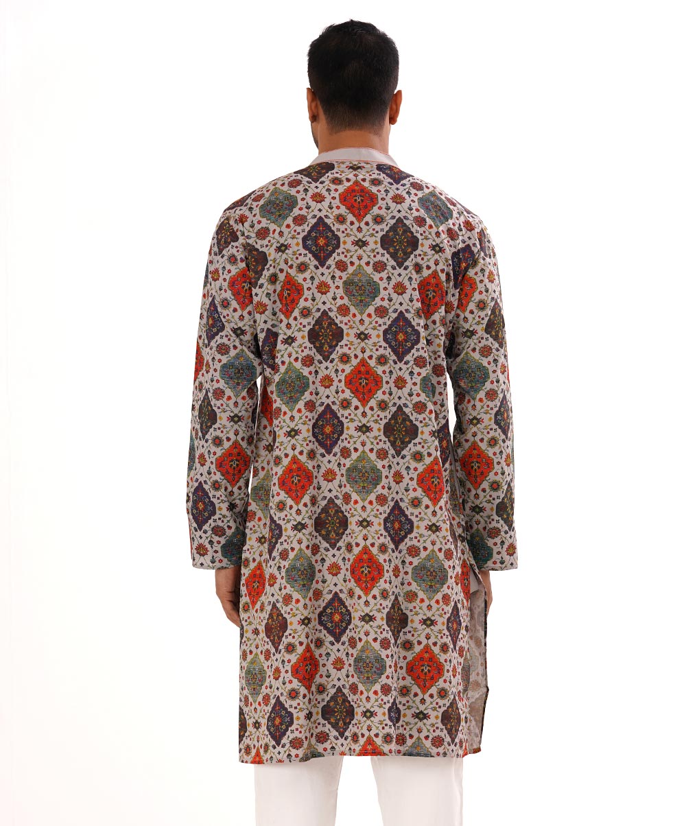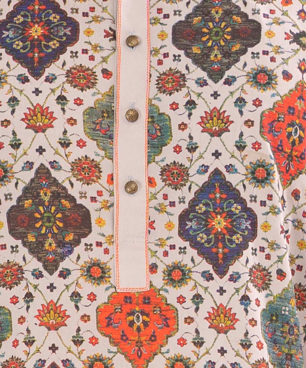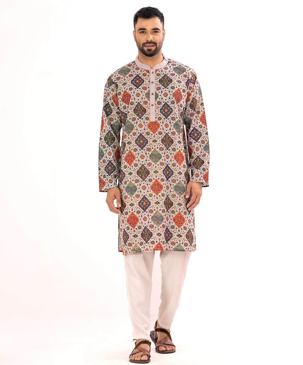 Semi fitted viscose panjabi with allover ethnic print.