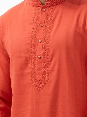 Orange semi- fitted Panjabi in Jacquard Cotton fabric. Designed with embroidery on the collar and button placket