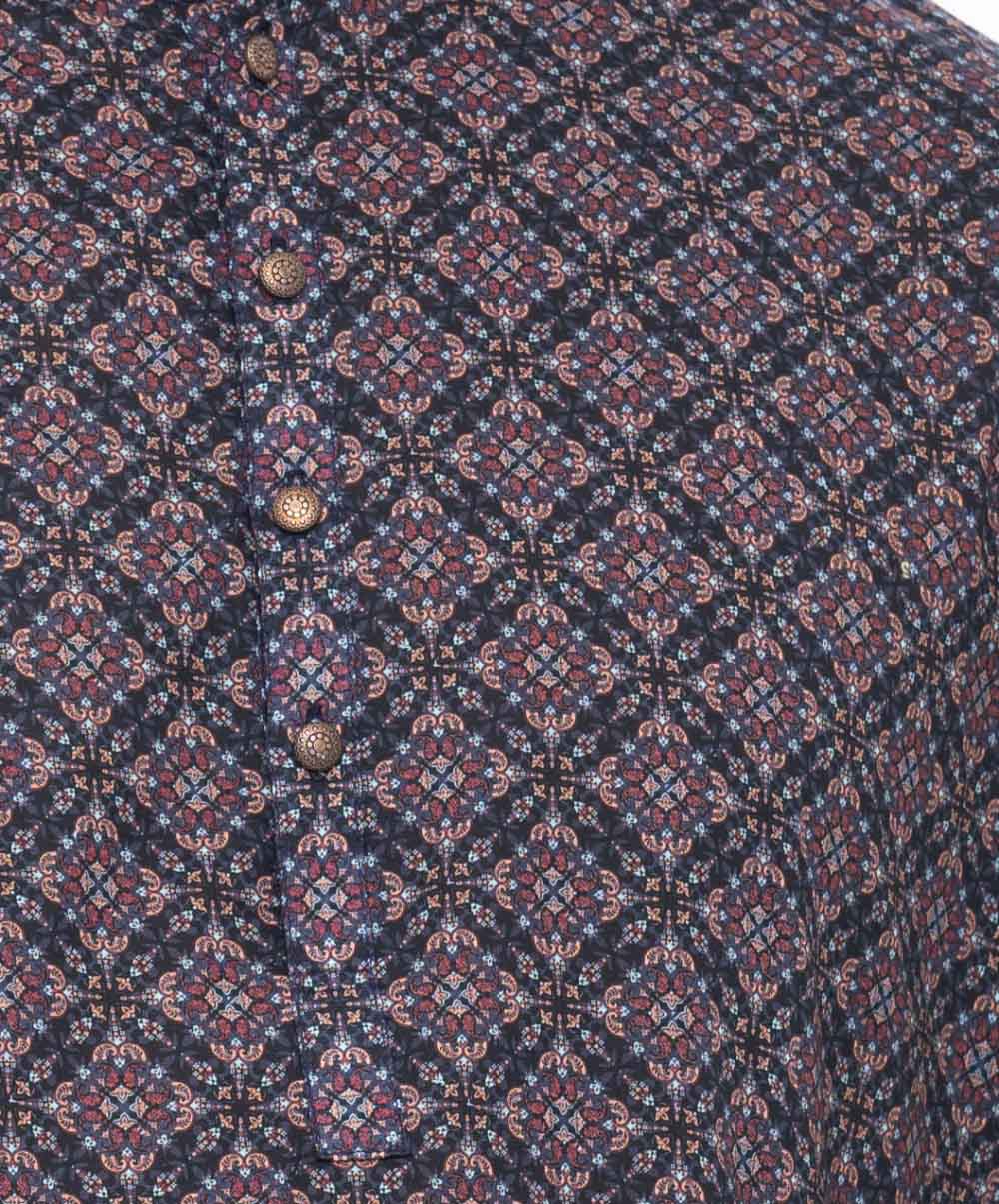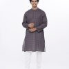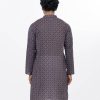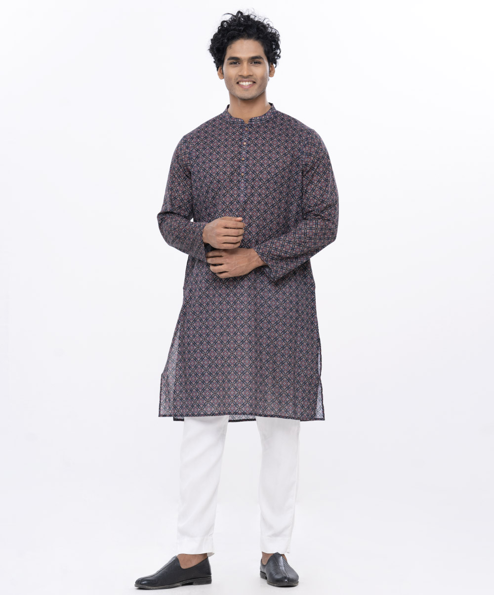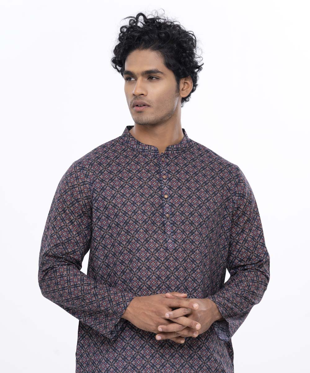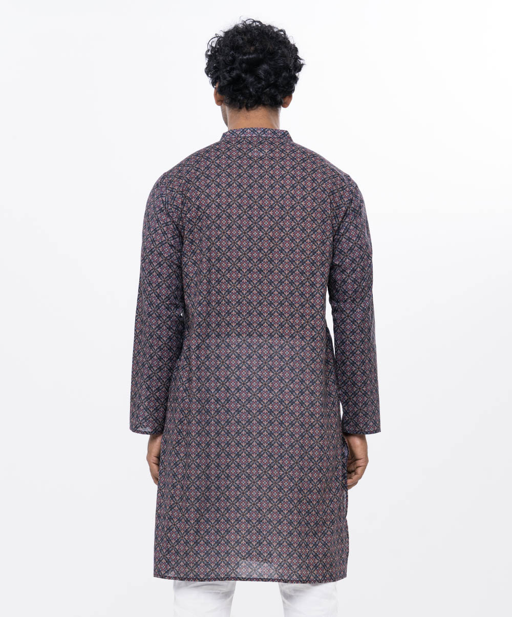 Black Panjabi in printed Cotton fabric. Matching metal button opening on the chest.