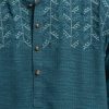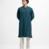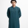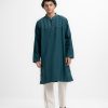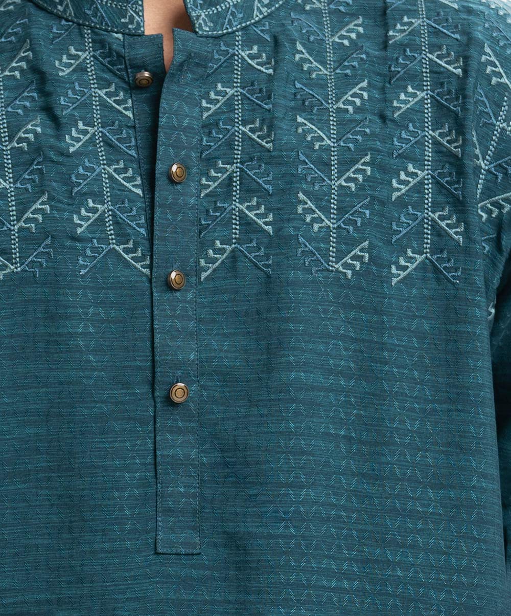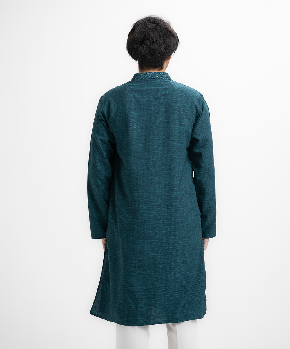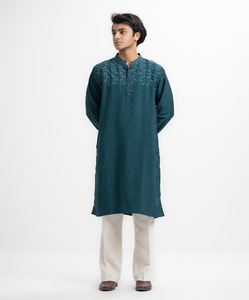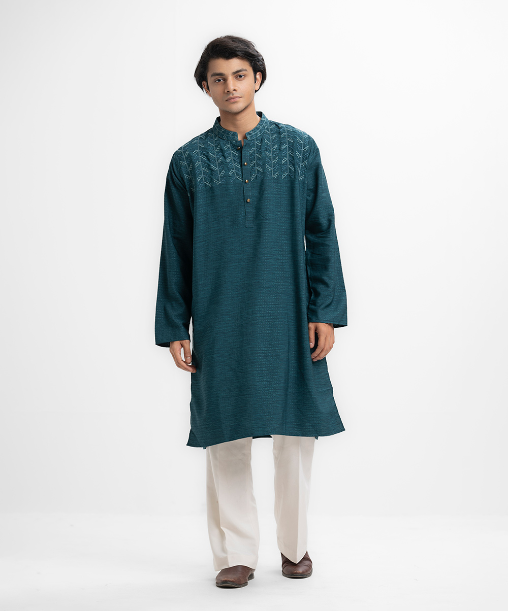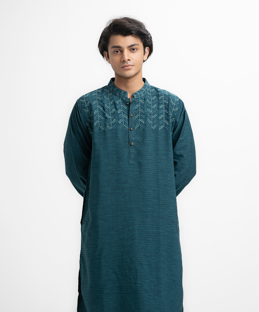 Men’s semi fit panjabi in jacquard blended fabric. Mandarin collar with metal buttons placket & full sleeves. Embroidery at front.