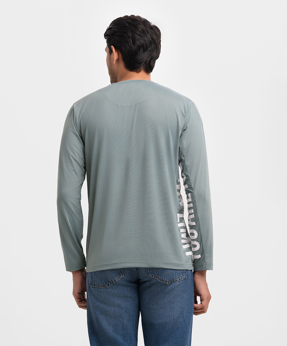 Men’s winter t-shirt in stretchable cotton knit fabric. Round neck, long sleeves and typographic print at side.