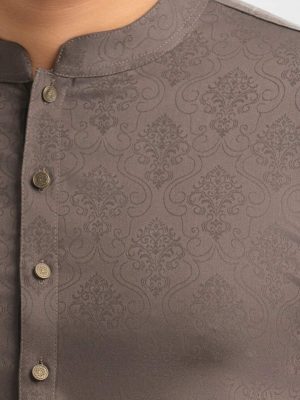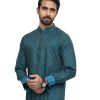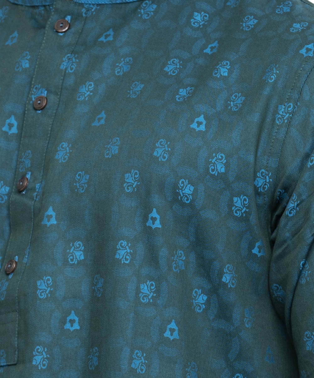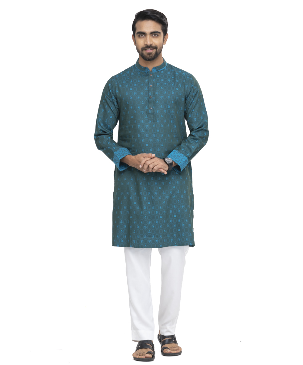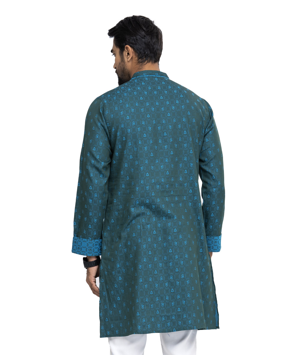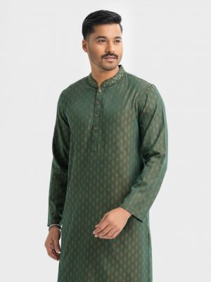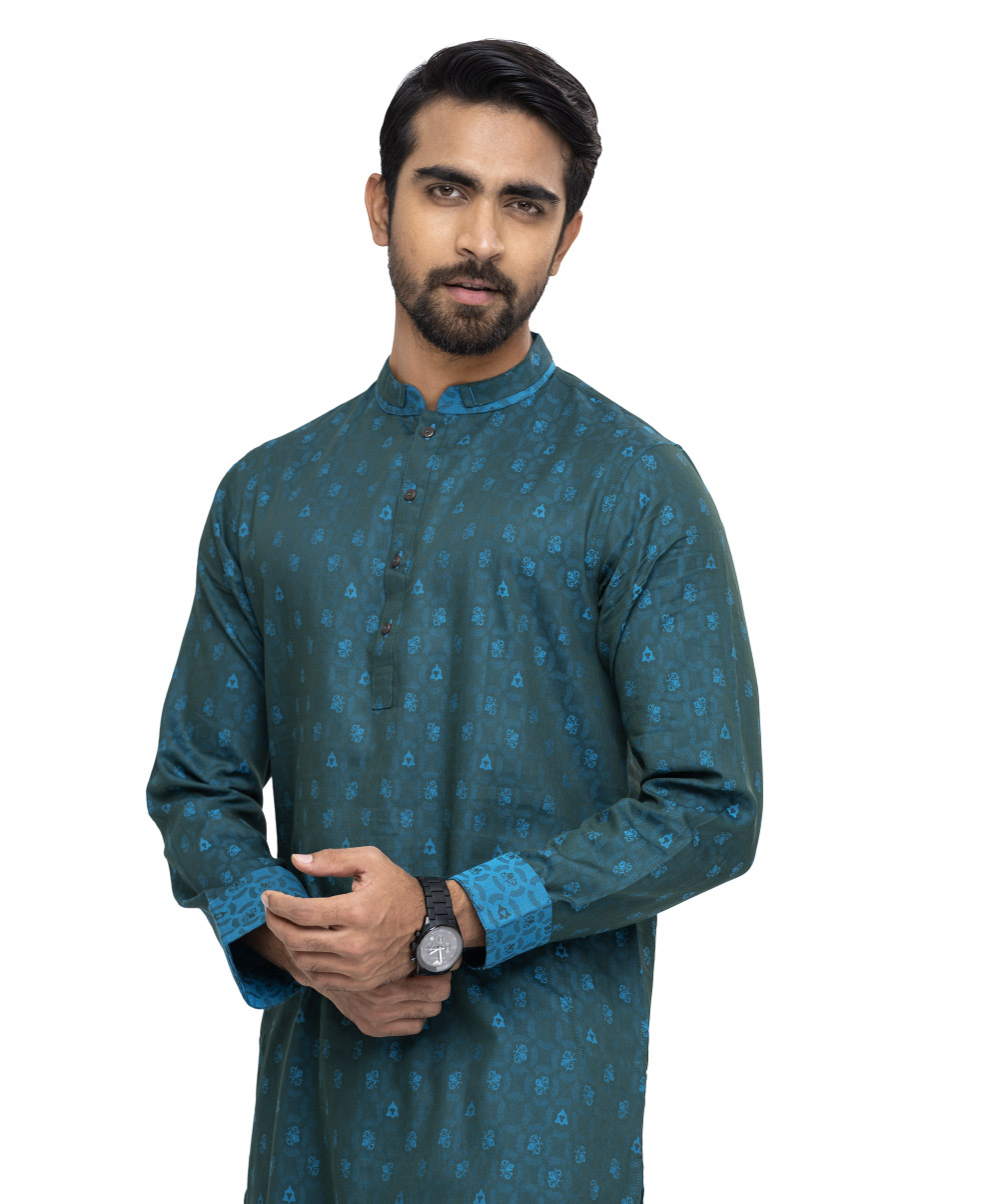 Green all-over printed Panjabi in Jacquard Fabric with contrast color fabric used on the neck & cuffs.