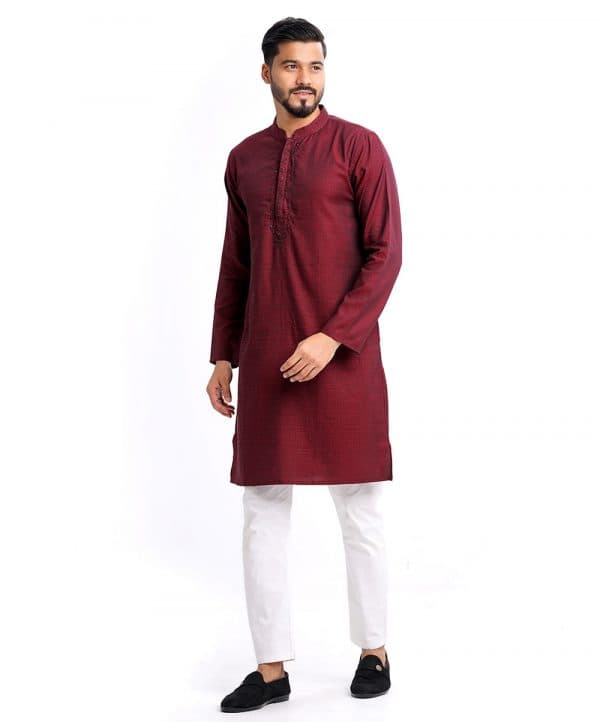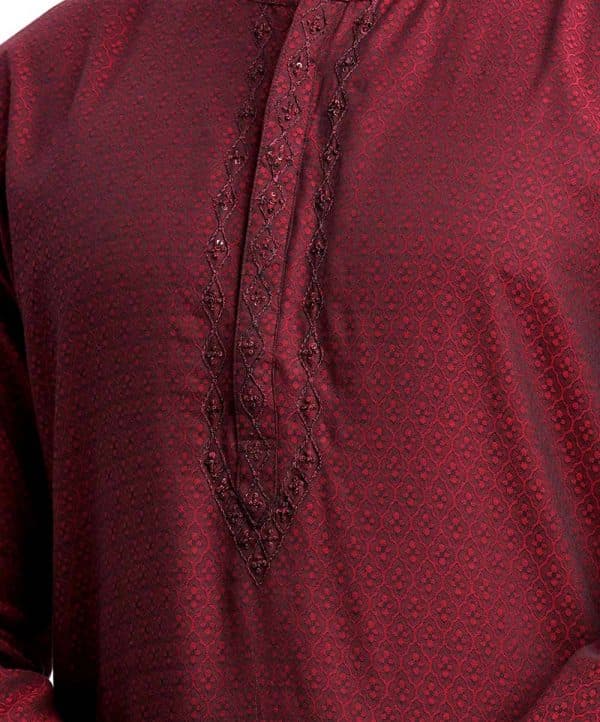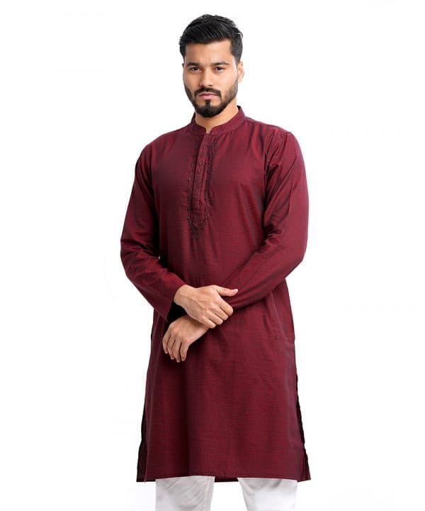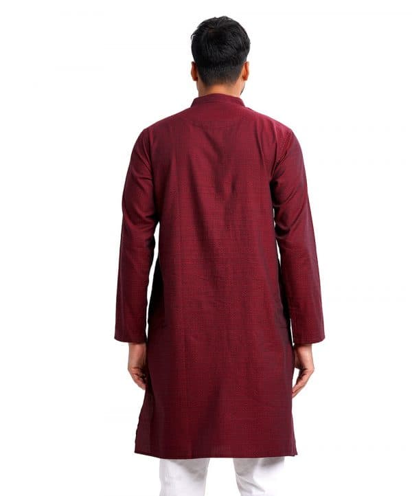 Maroon fitted Panjabi in Jacquard Cotton fabric. Designed with minimal karchupi on the collar and placket.