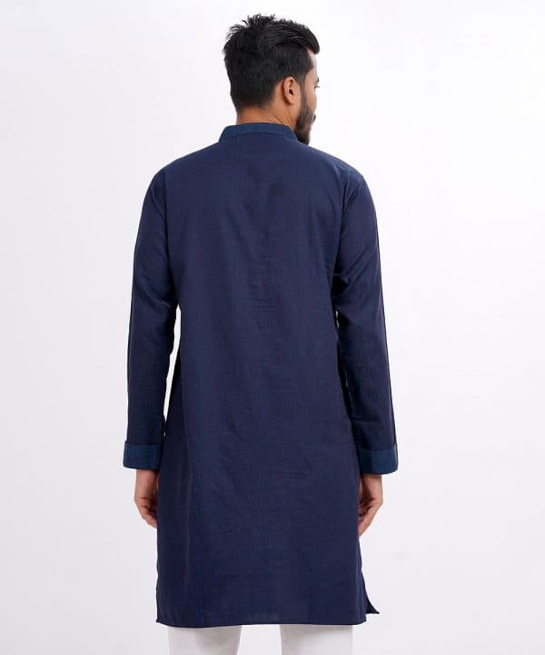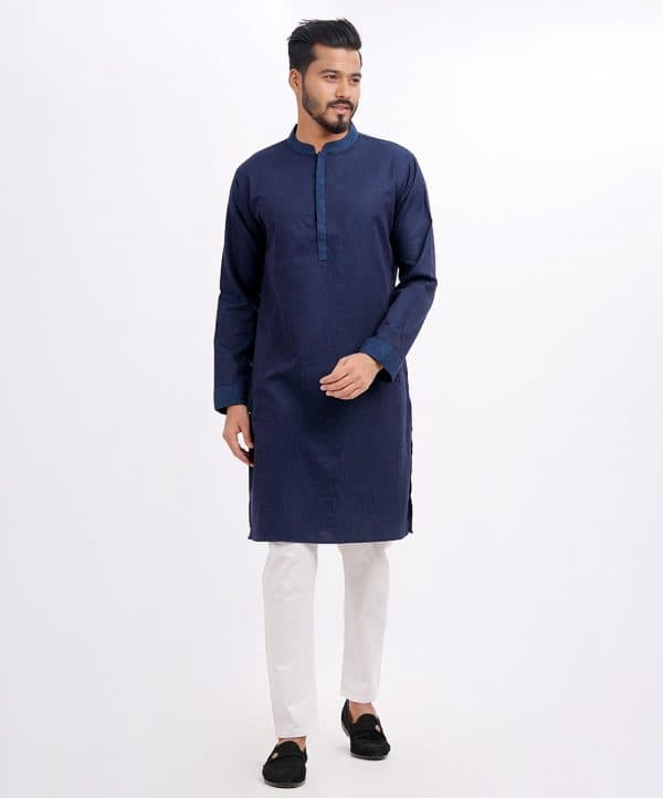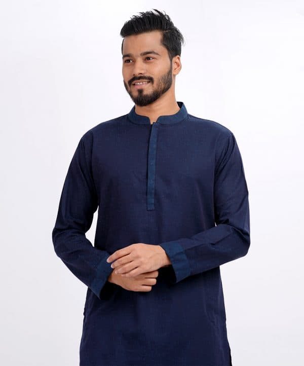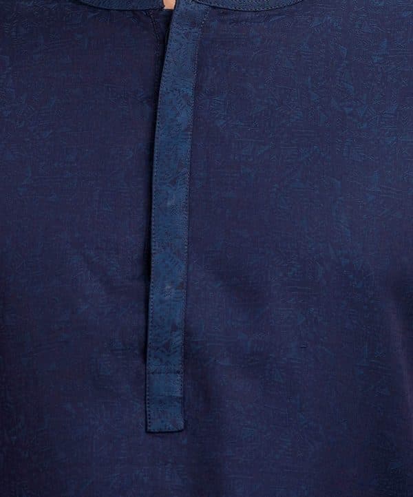 Blue fitted Panjabi in Jacquard Cotton fabric. Designed with a mandarin collar and hidden button placket.