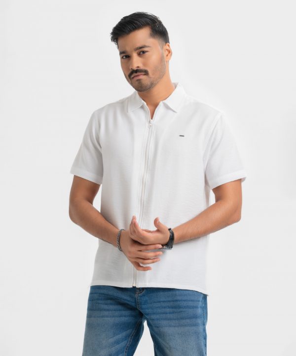 Men’s short-sleeved casual shirt in stretchable cotton blend fabric. Classic collar, zip opening at the front.