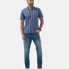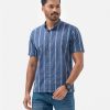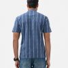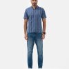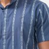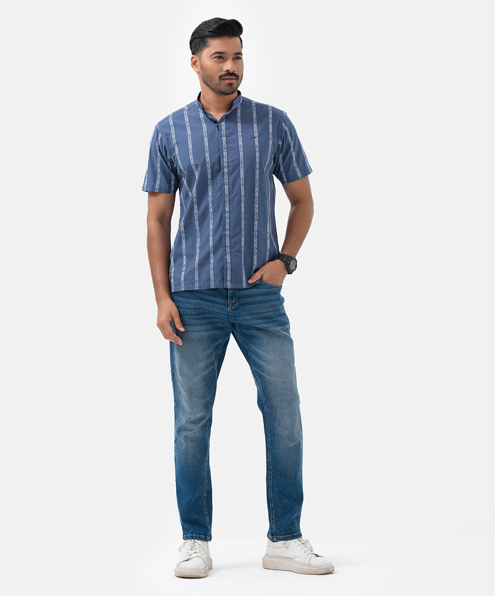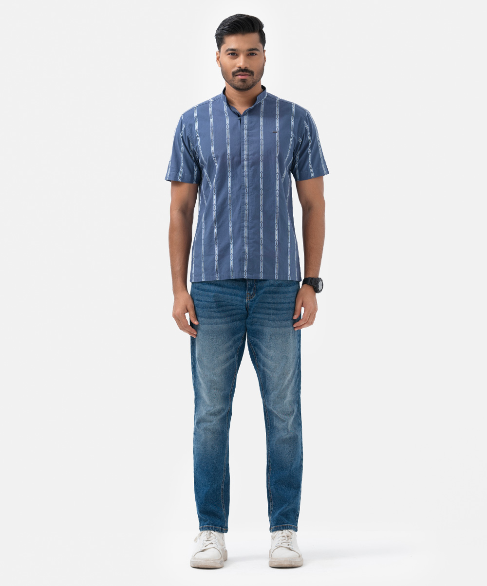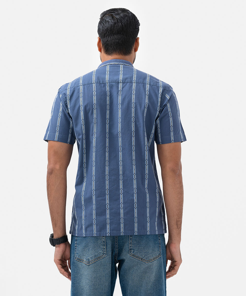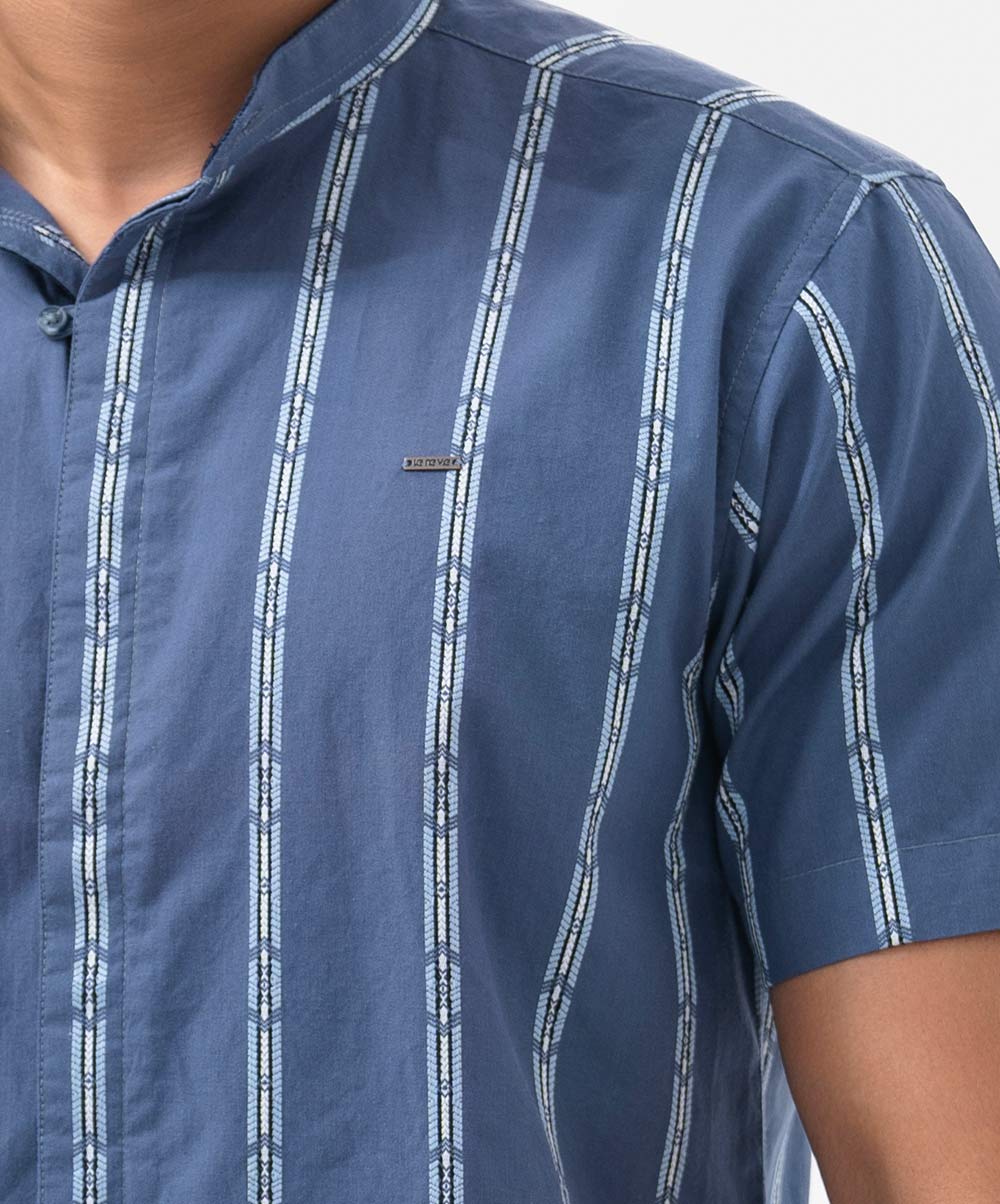 Men’s striped casual shirt in textured cotton fabric. Mandarin collar with two show buttons and short sleeves.