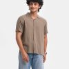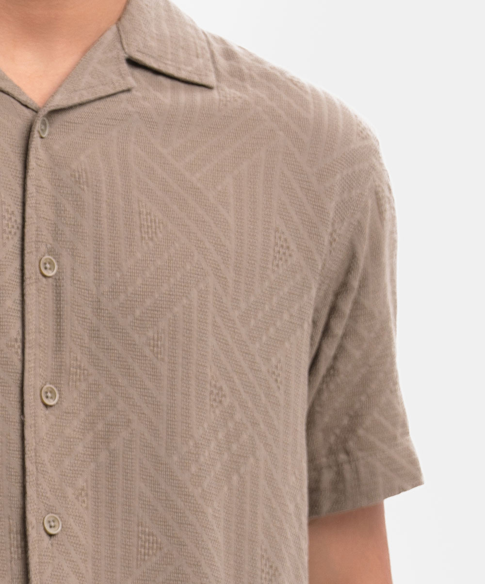 Men’s single color casual shirt in Jacquard cotton fabric. Cuban collar, short sleeves.
