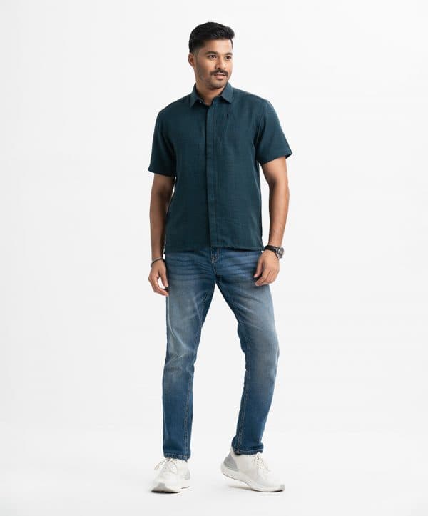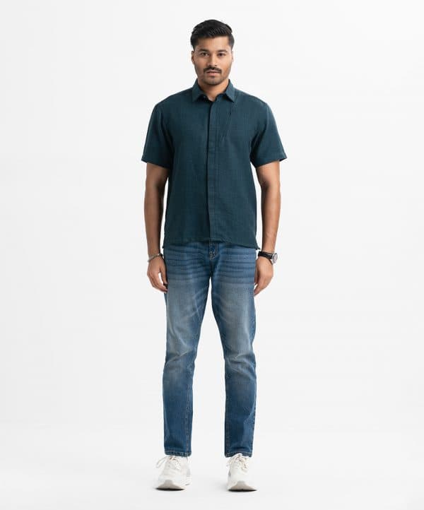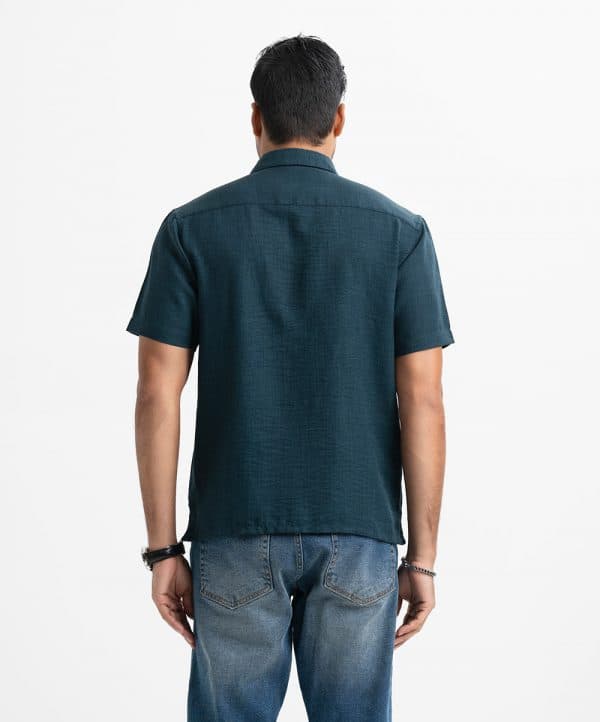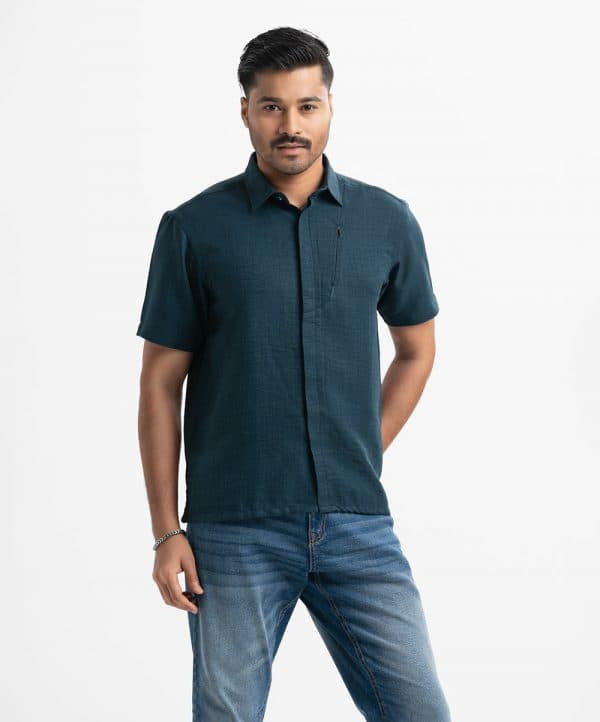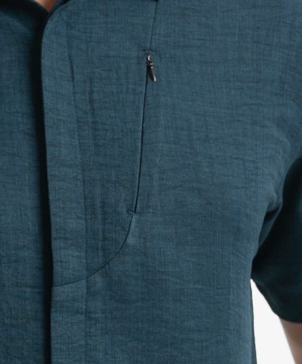 Men’s casual shirt in blended fabric. Classic collar, short sleeves. Zipper design at front.
