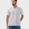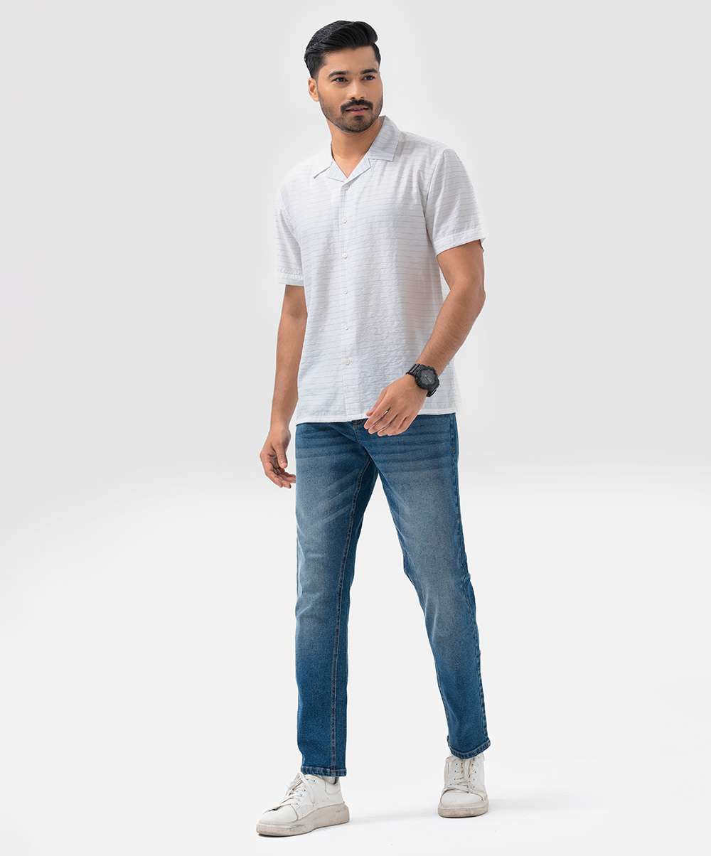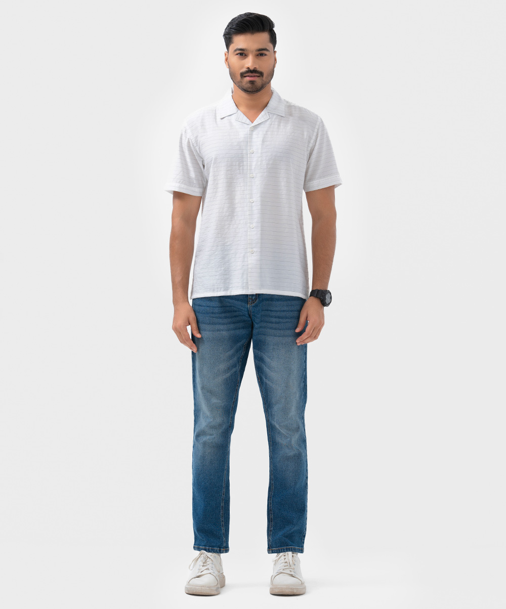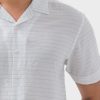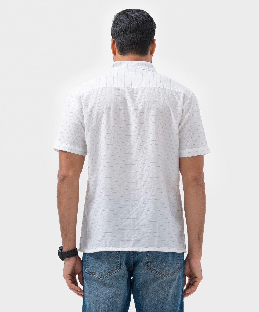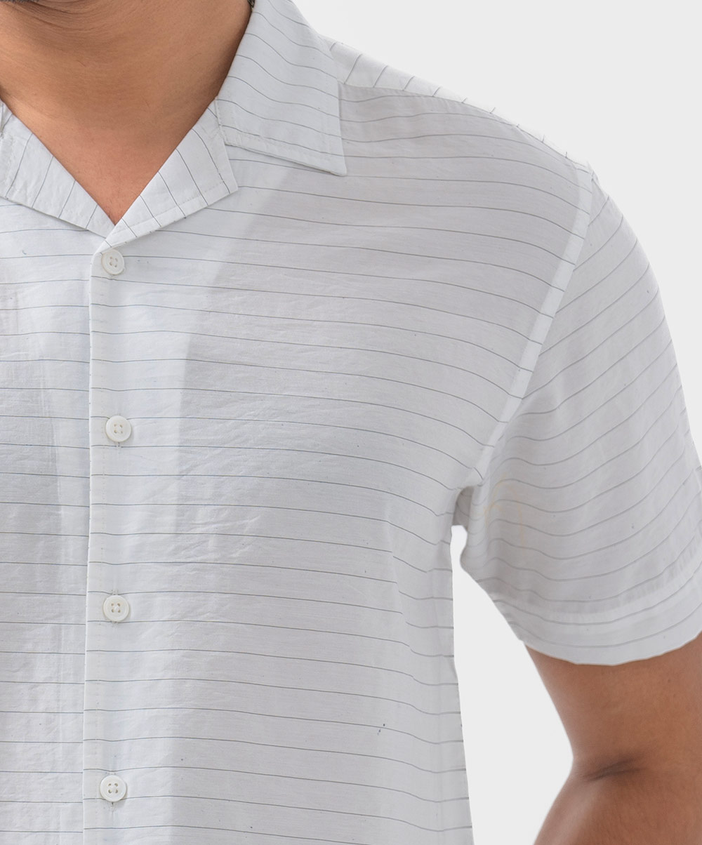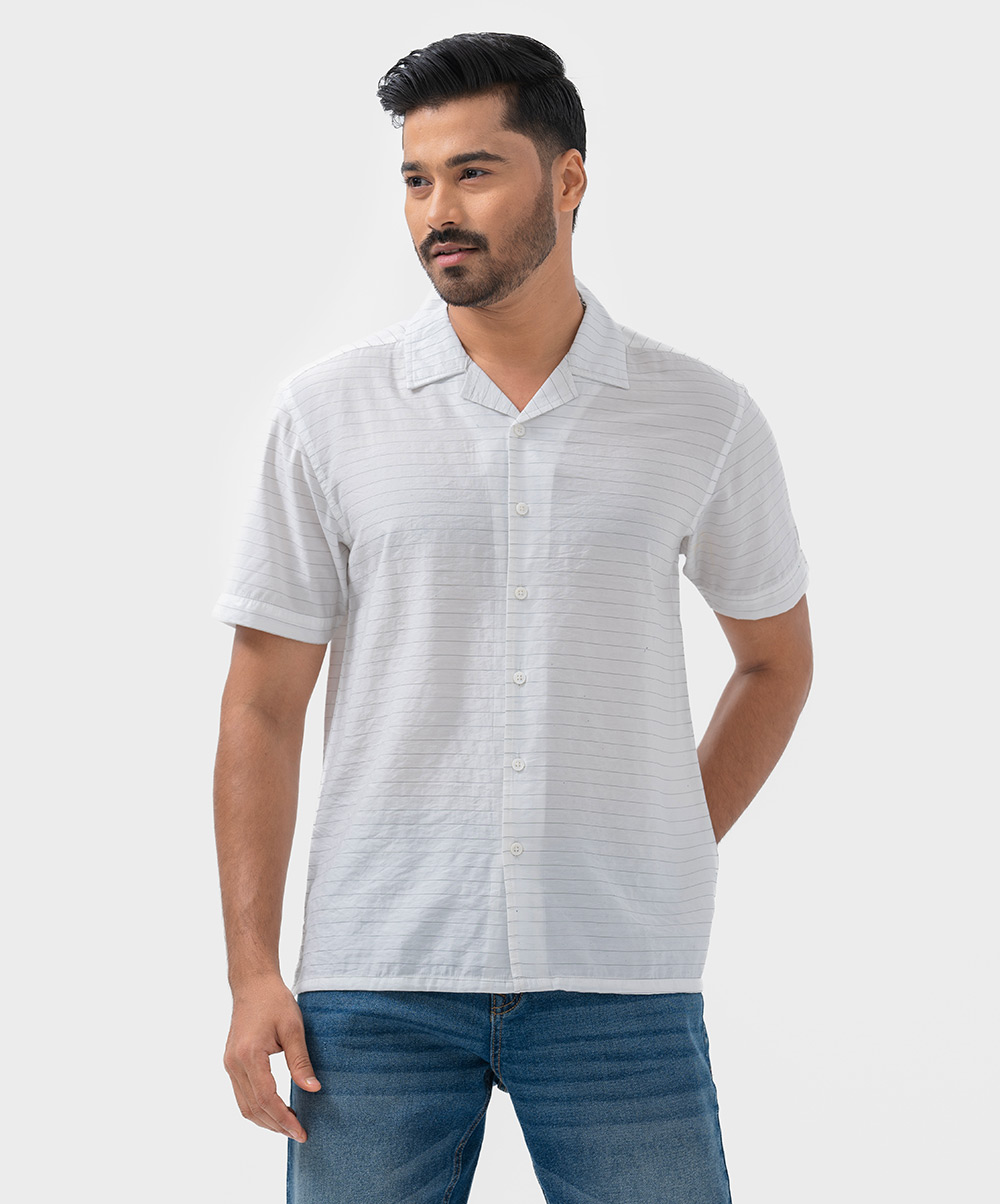 Men’s short-sleeve casual shirt in cotton stripe fabric. Cuban collar and button fastening at the front.