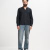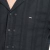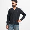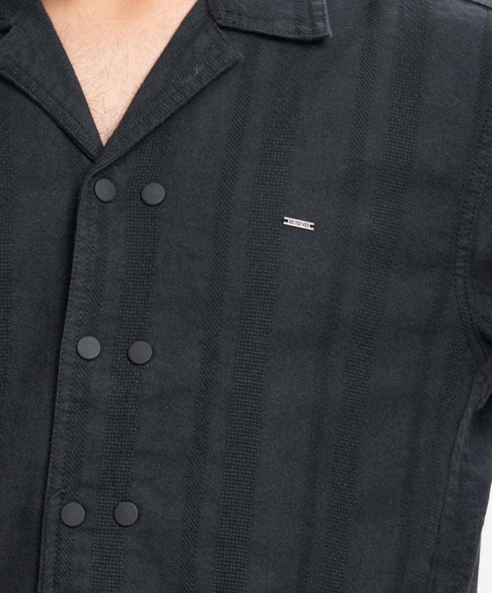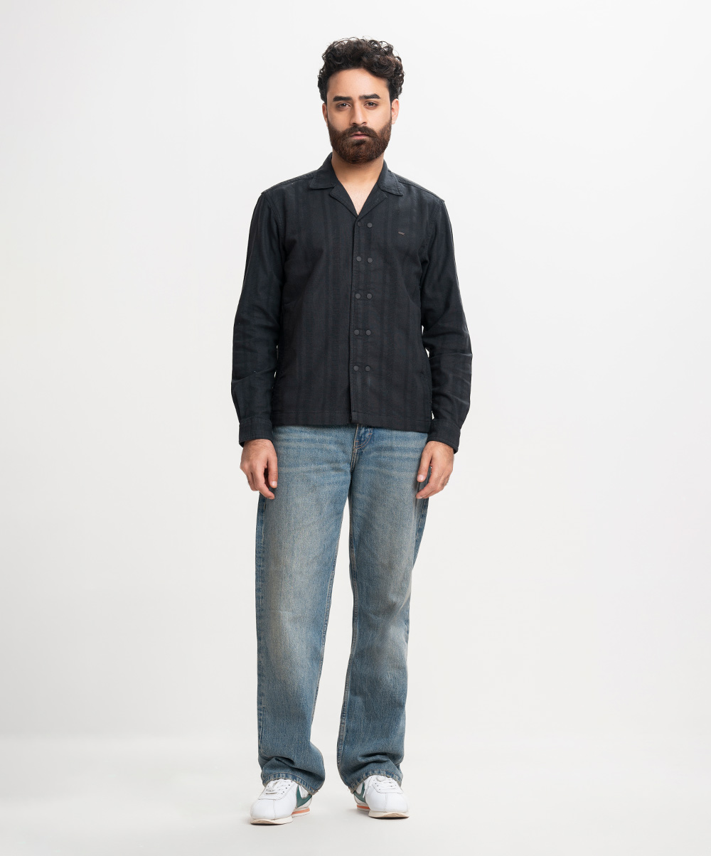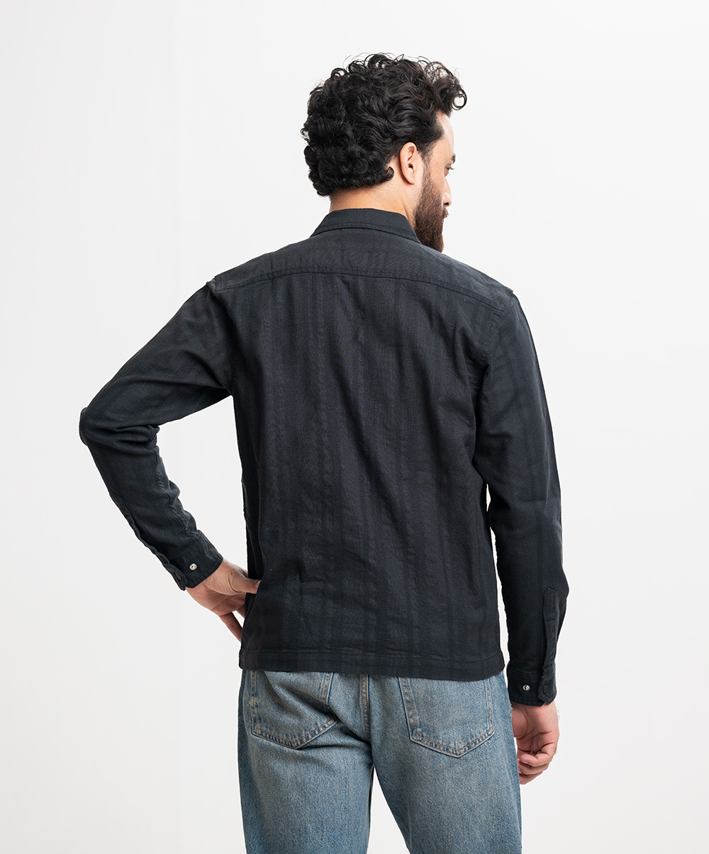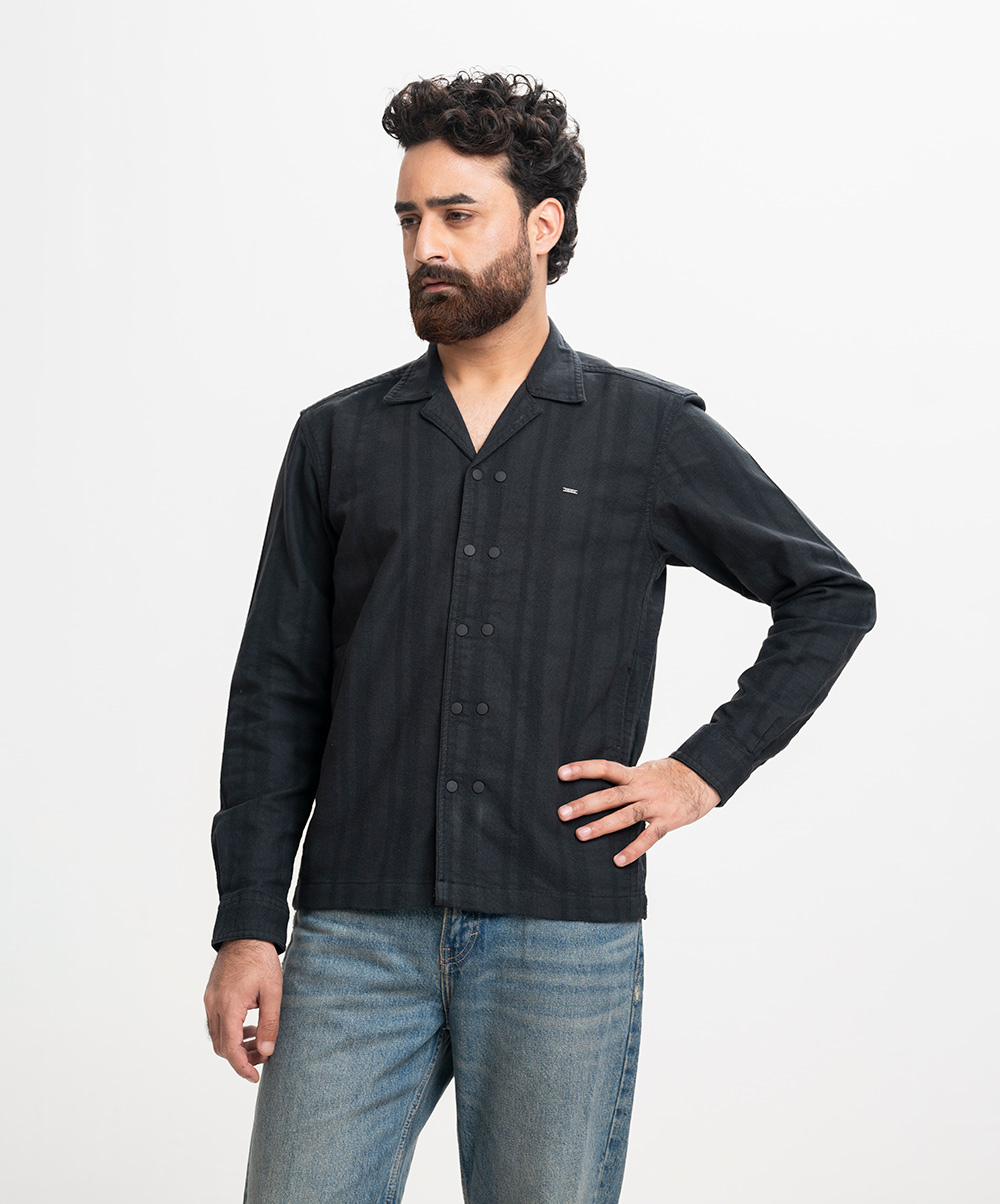 Men’s boxy fit overshirt shacket jacket in cotton jacquard fabric. Cuban collar, long sleeves with button cuff. Front double buttons fastening and side pockets.