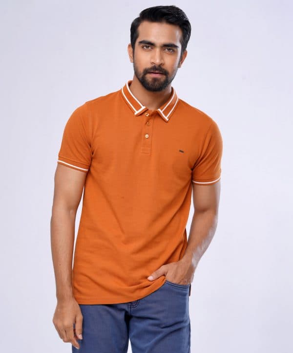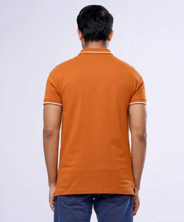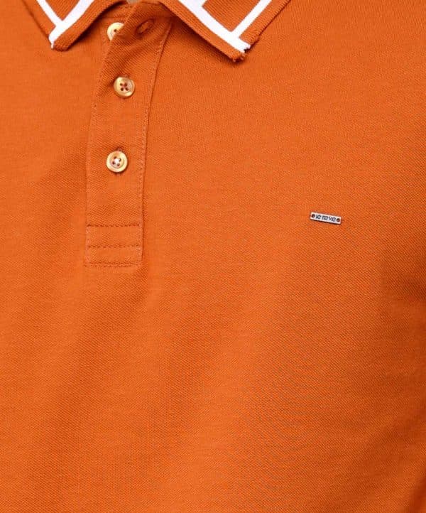 Orange Polo Shirt in Cotton pique fabric. Designed with a classic collar, short sleeves, and a metal logo attachment at the chest. Contrast tipping at collar and cuffs.