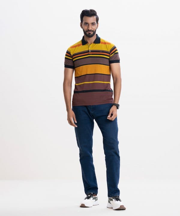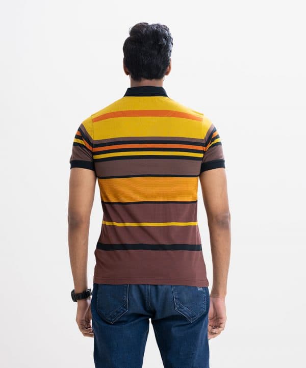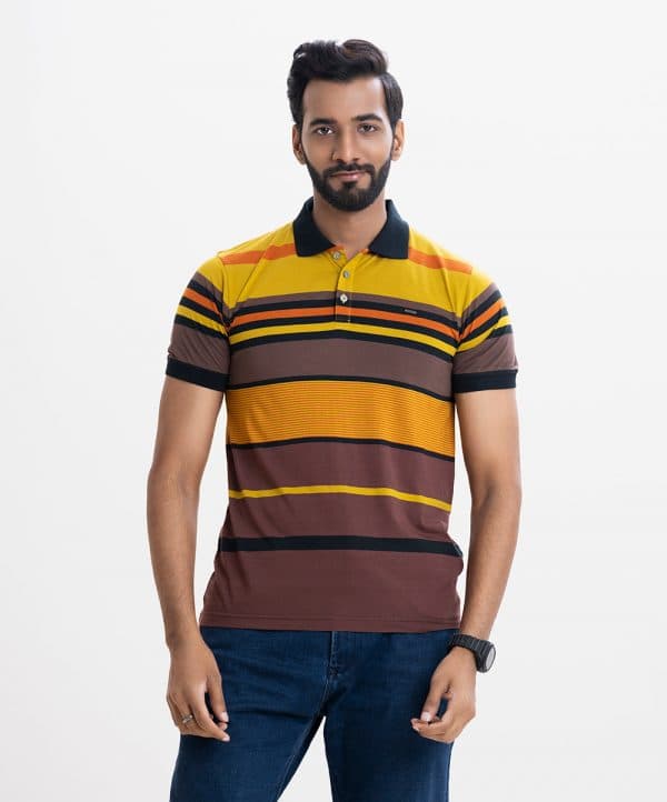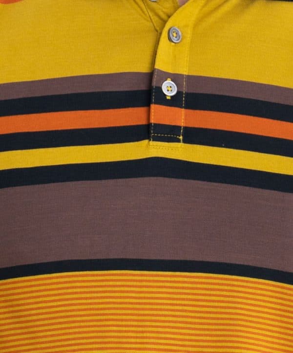Mercerized stripea polo shirt in cotton knit fabric. rib collar & cuff with button up front.