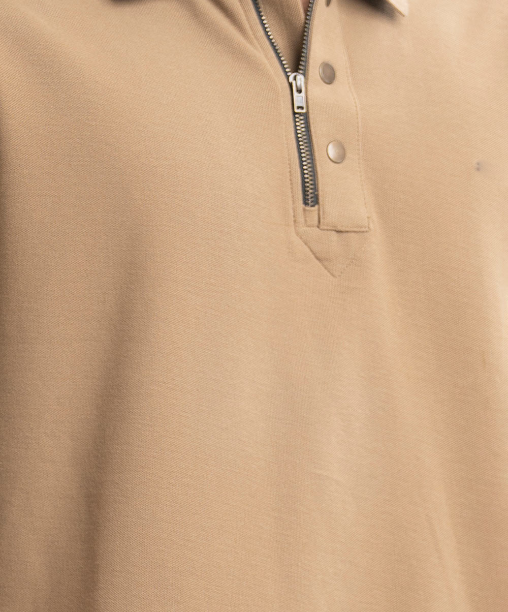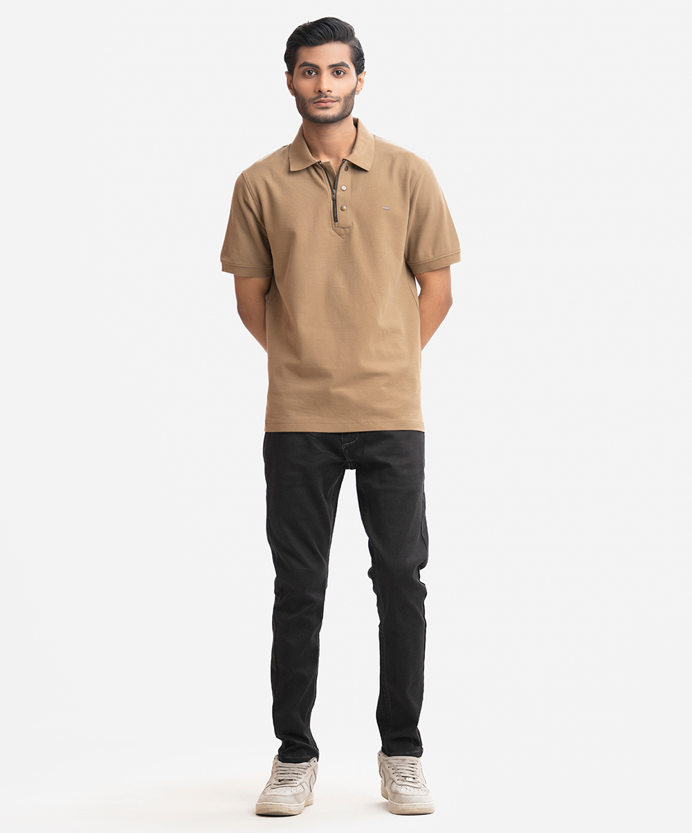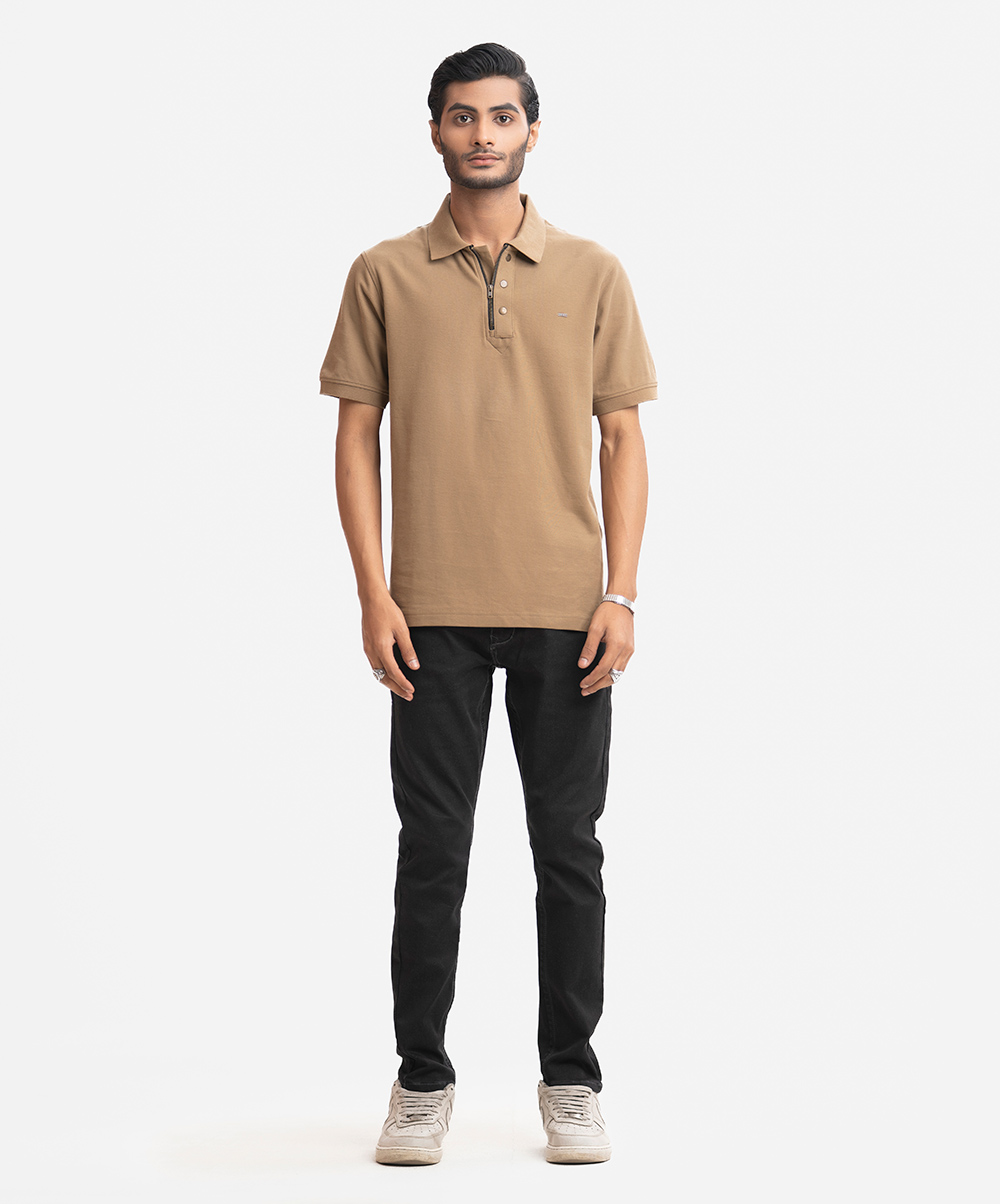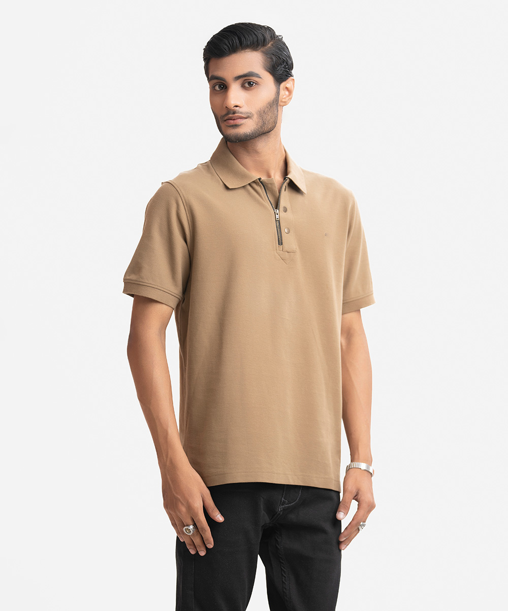 Men’s polo in stretchable cotton pique fabric. Classic collar with zipper & buttons design placket, short sleeves with straight hem.