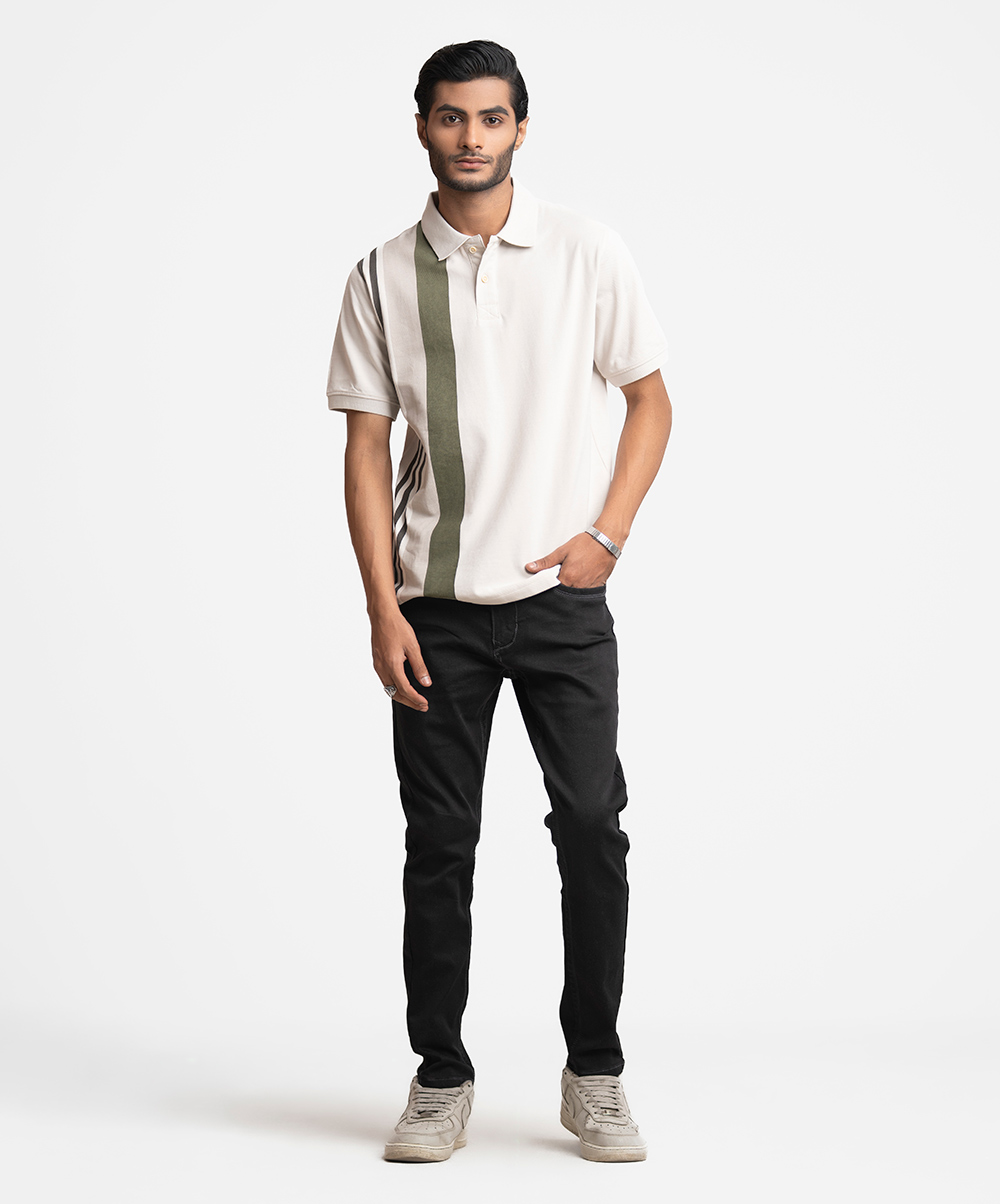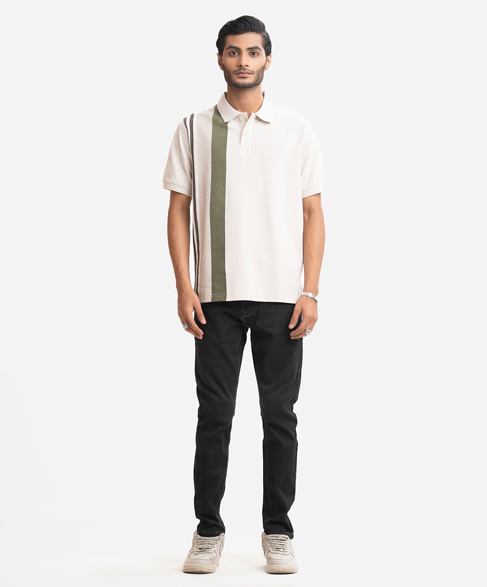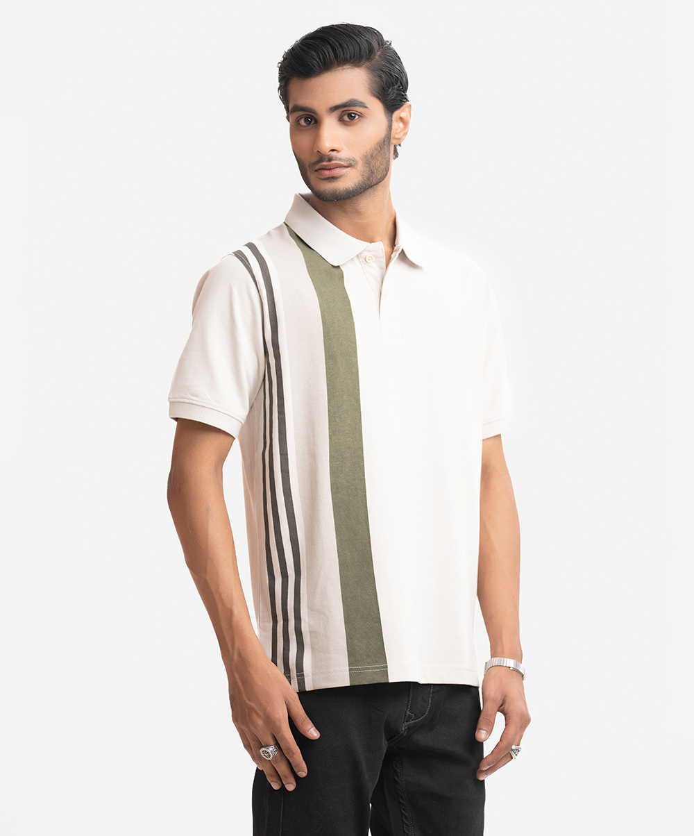 Men’s stripe polo in stretchable cotton pique fabric. Classic rib collar, short sleeves with straight hem.