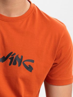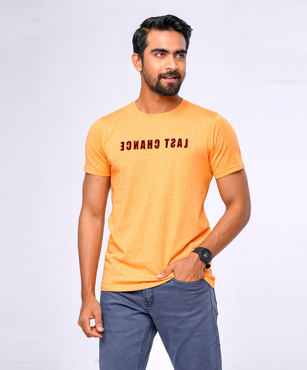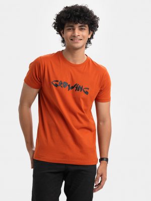 Orange T-Shirt in Siro single jersey Cotton blend fabric. Designed with a crew neck, short sleeves, and print on the chest.