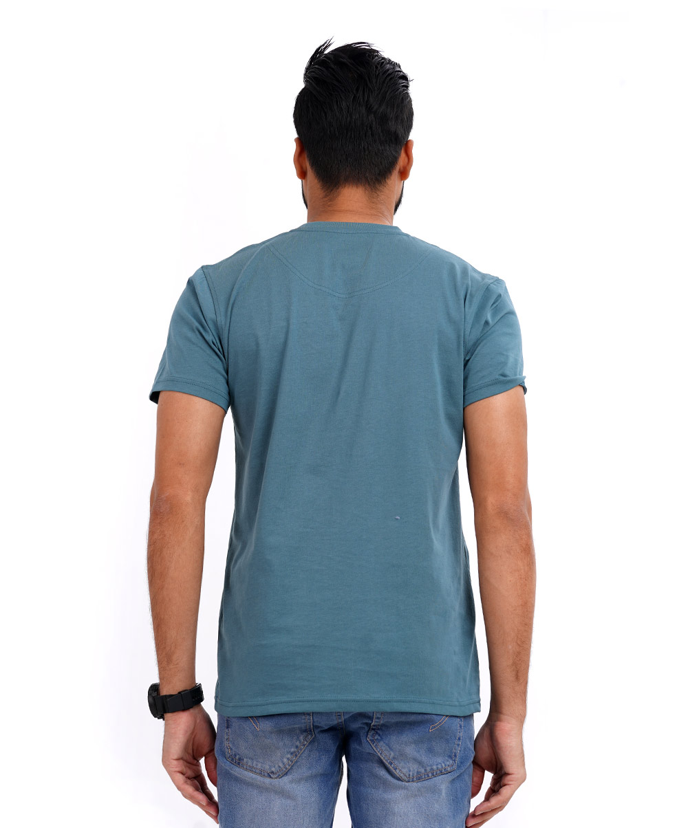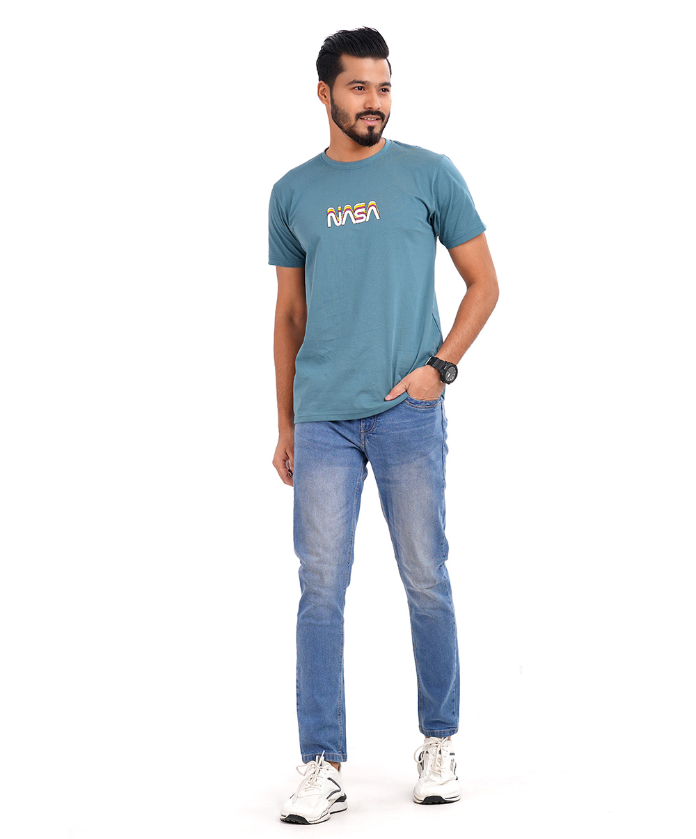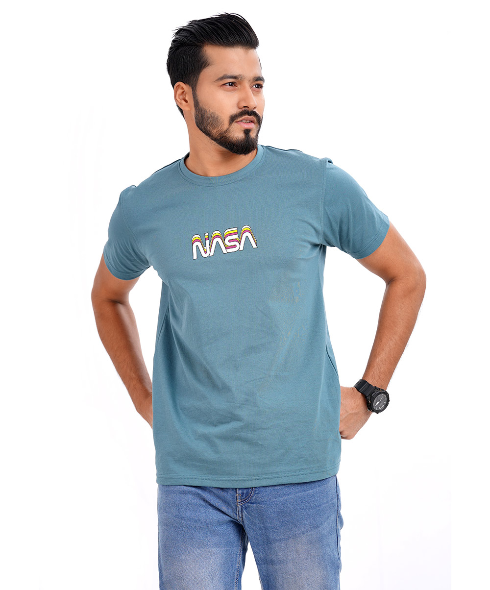 Round Neck T Shirt in cotton knit S/J fabrics with chest printed and rib neck.