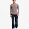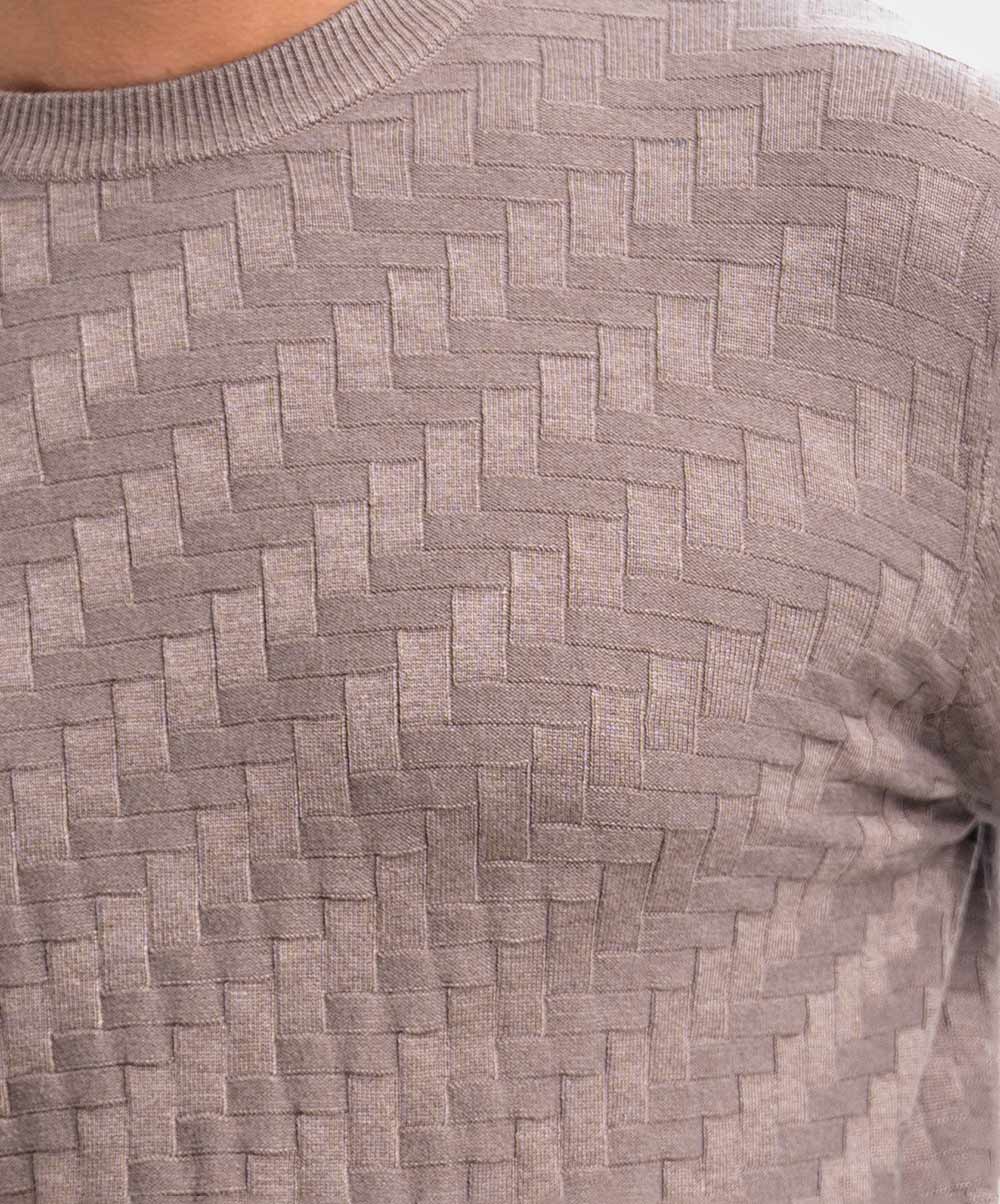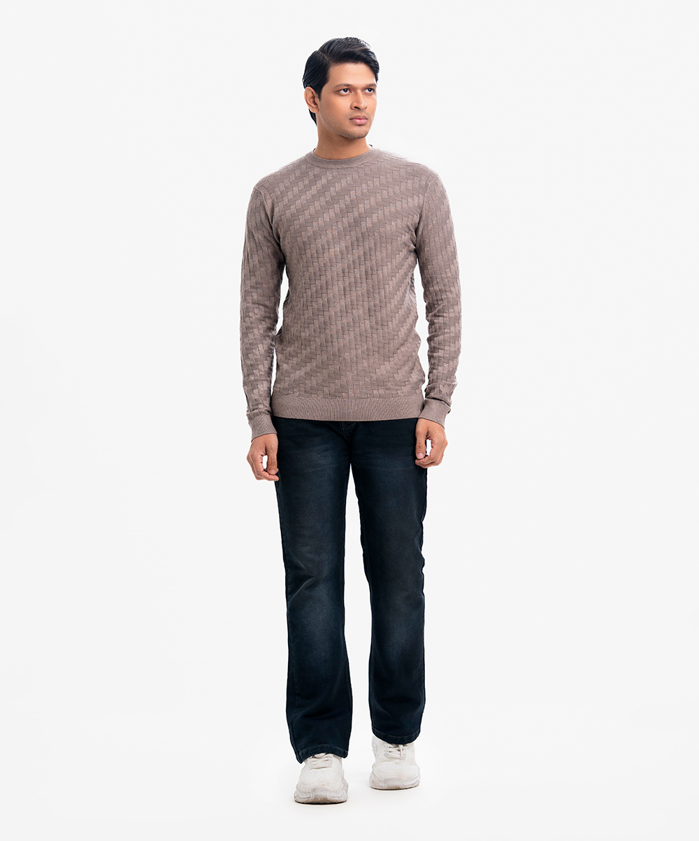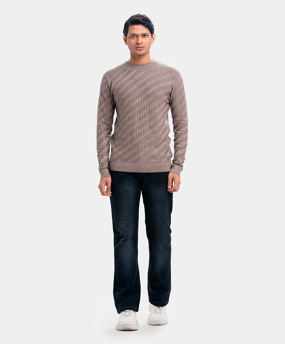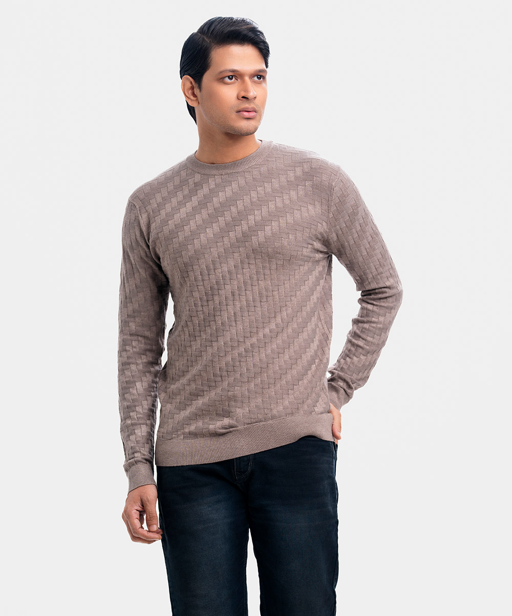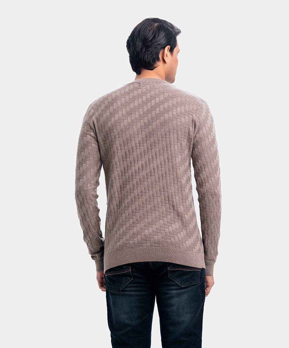 Men’s winter geometric pattern woven sweater in blended viscose knit fabric. Round collar, full sleeves, and a straight hem. Featuring narrow ribbing at the cuffs and hem.