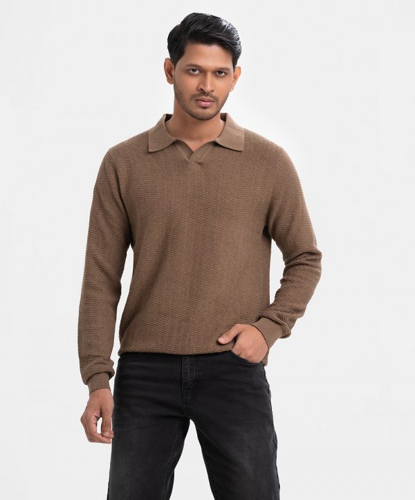 Men’s long-sleeve sweater in cotton-blended knit fabric. Classic collar and rib hem.