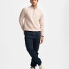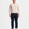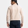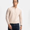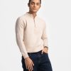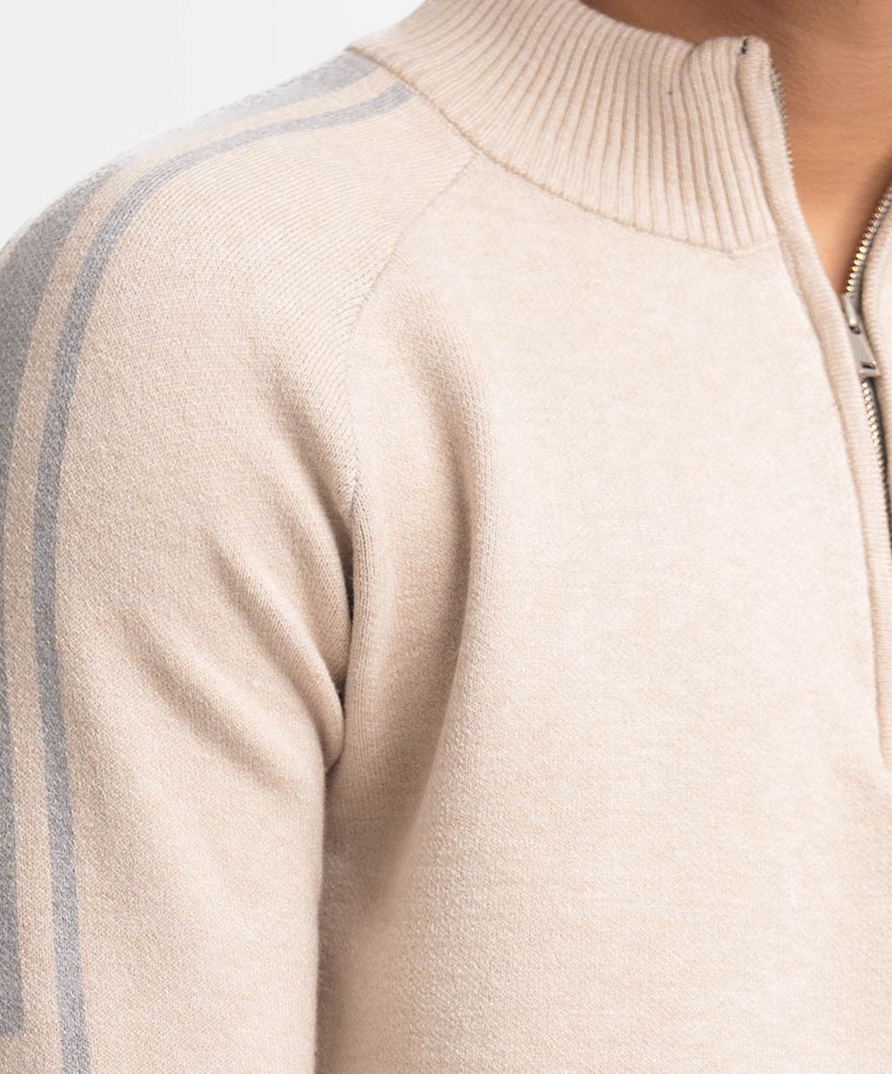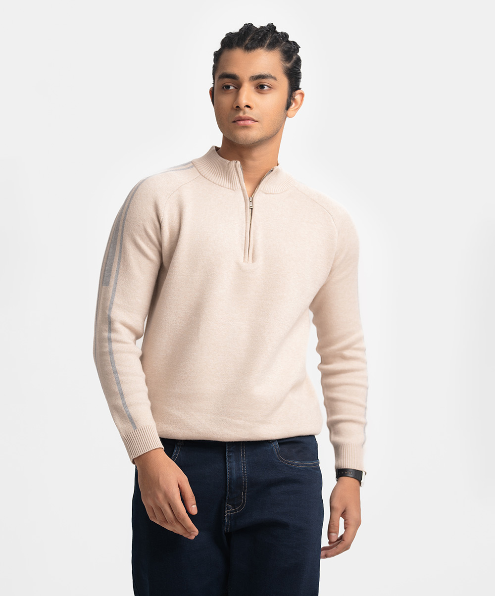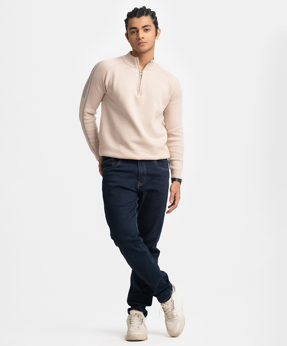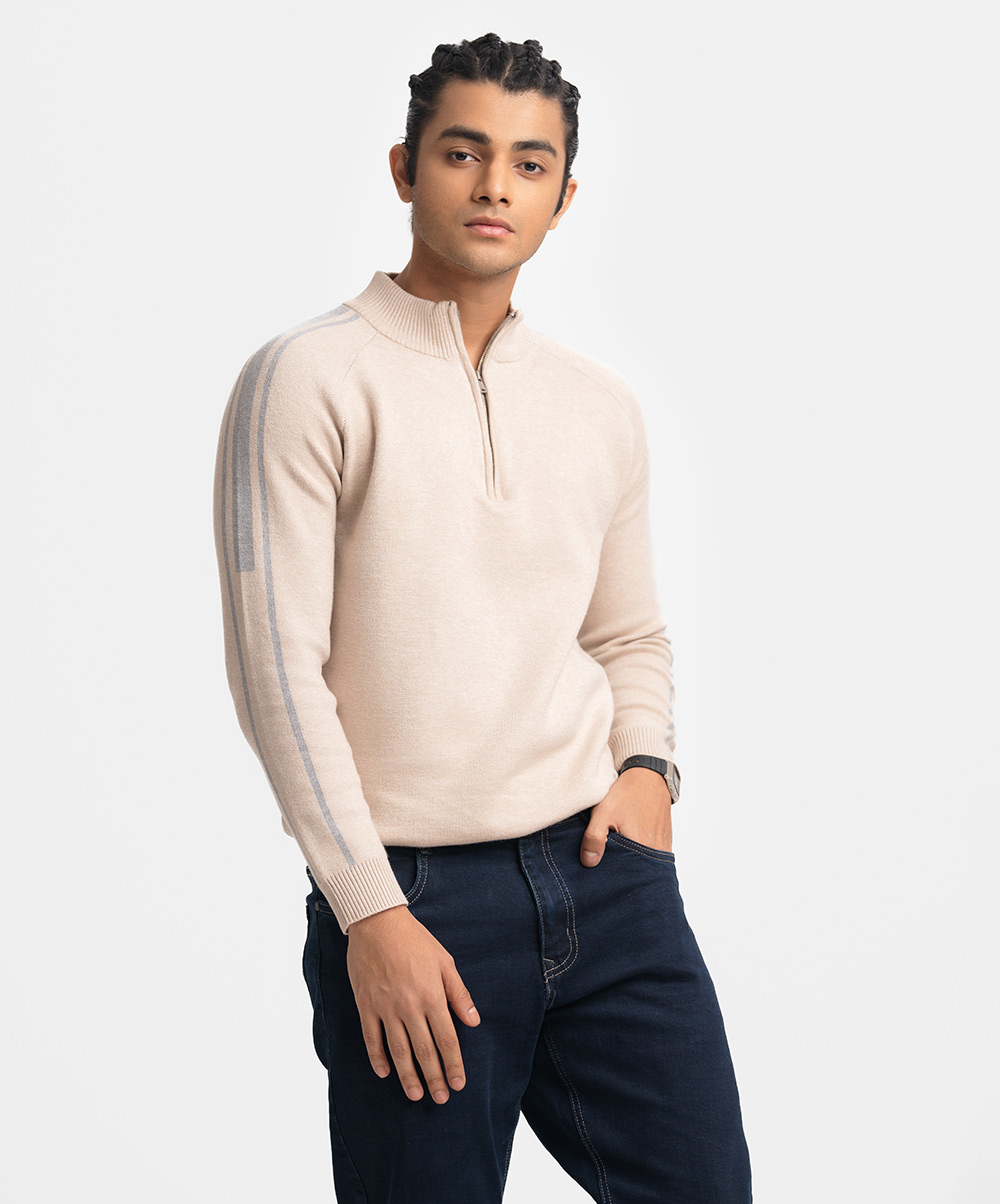 Men’s winter woven sweater in blended viscose knit fabric. High collar, full sleeves, and half-zip placket. Featuring narrow ribbing at the collar, cuffs and hem.