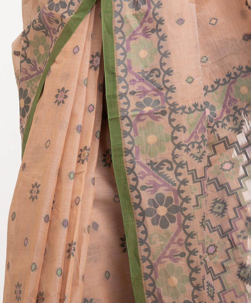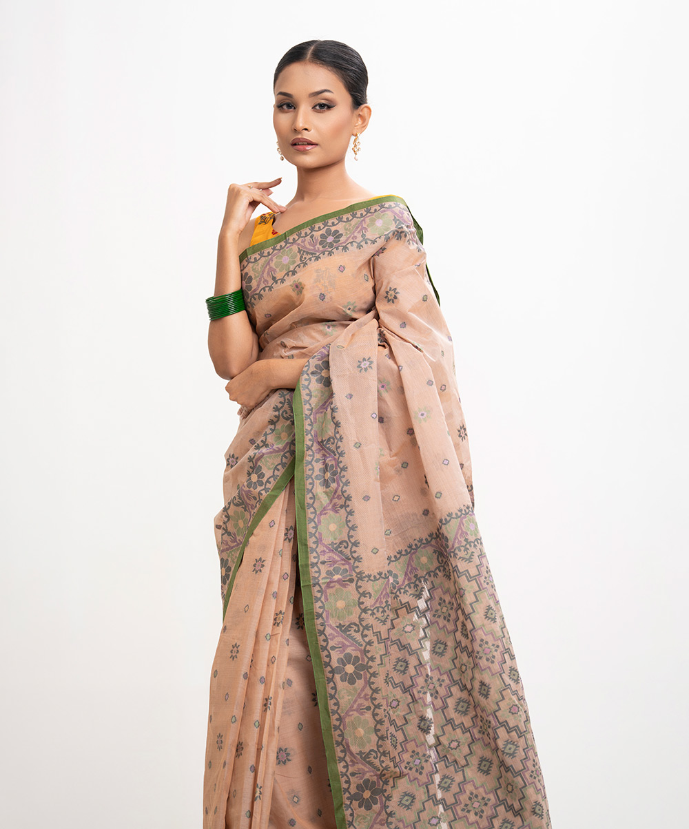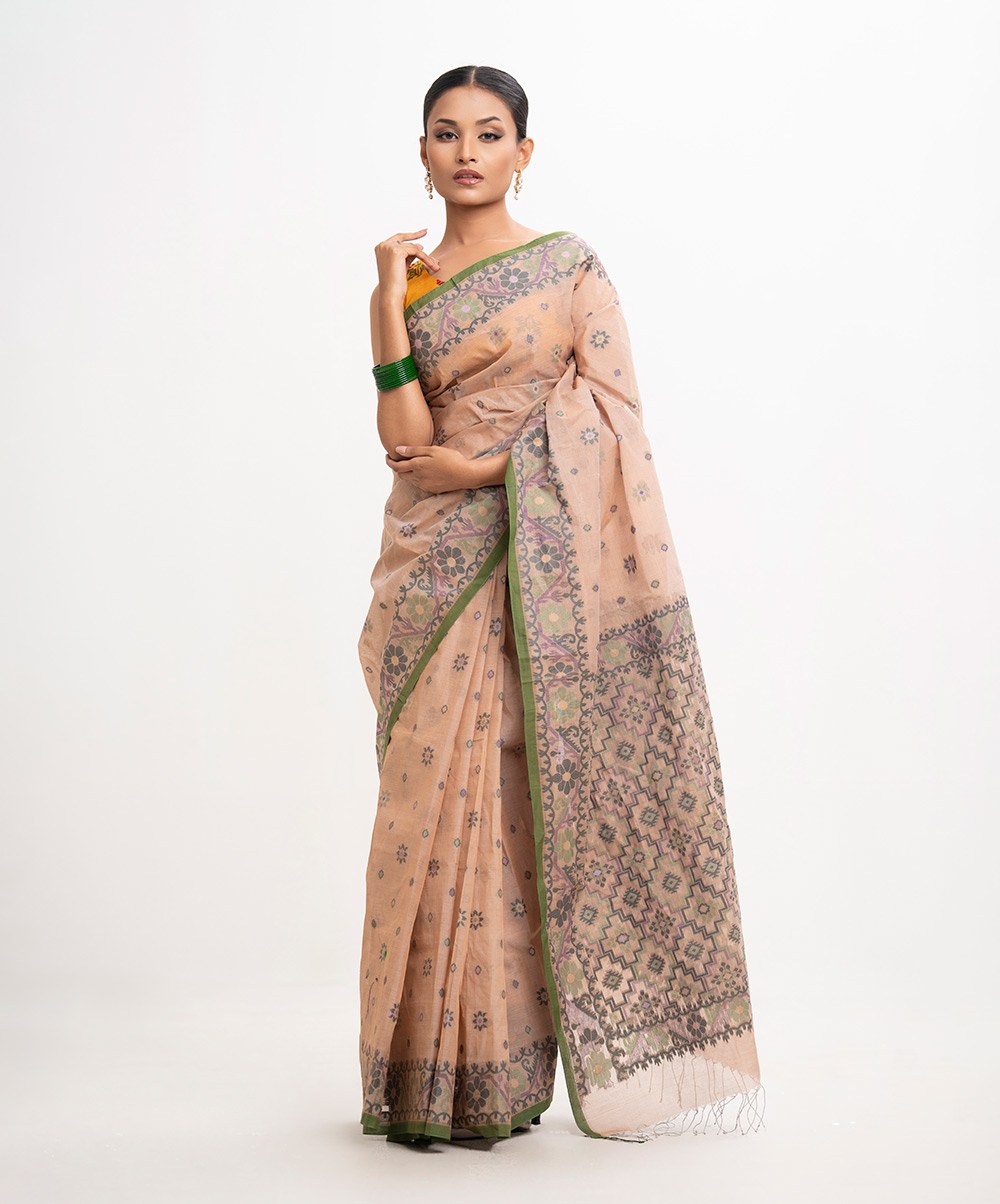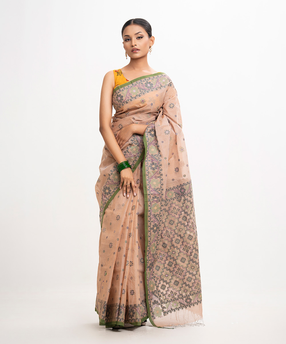 All-over jamdani pattern weaving details saree in cotton fabric. Fringe trim at the Aanchal.