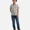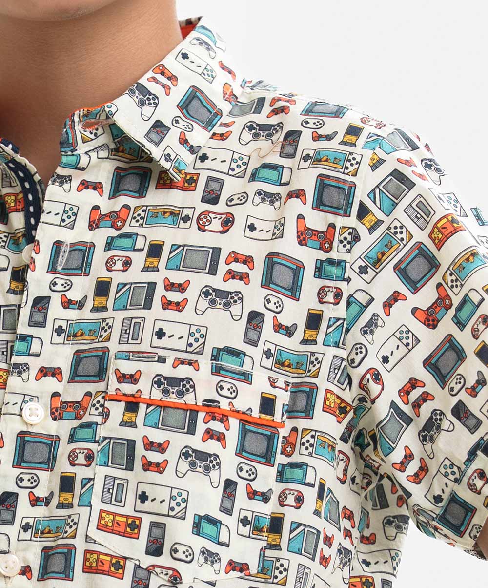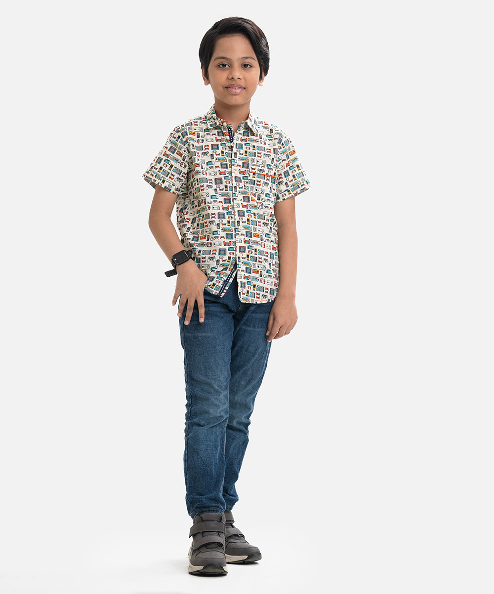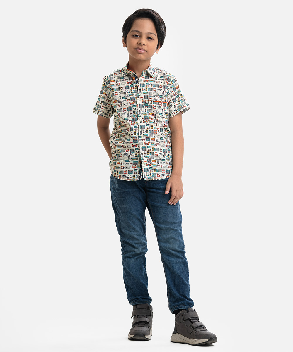 Short-sleeved cotton casual shirt with a classic collar and a single chest pocket.