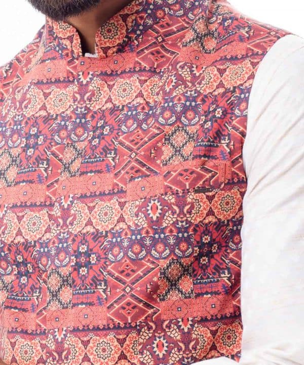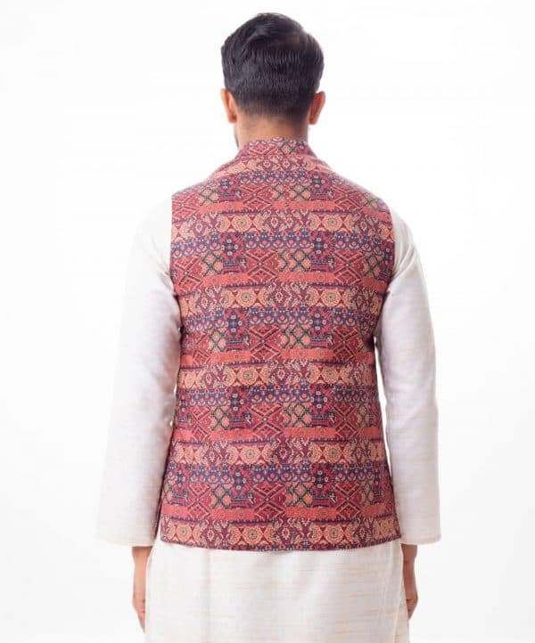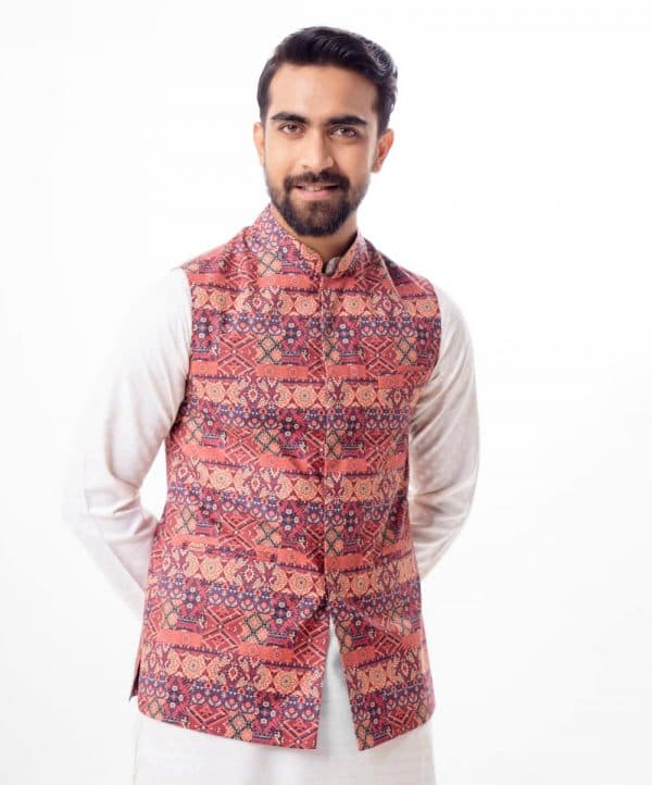 Maroon Waistcoat in printed Cotton fabric. Features a mandarin collar with a hidden button placket and Chest pocket. Taffeta lining in full body.