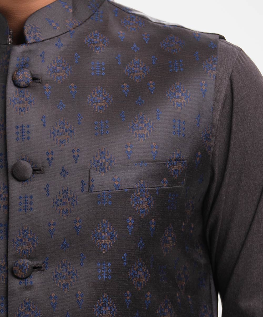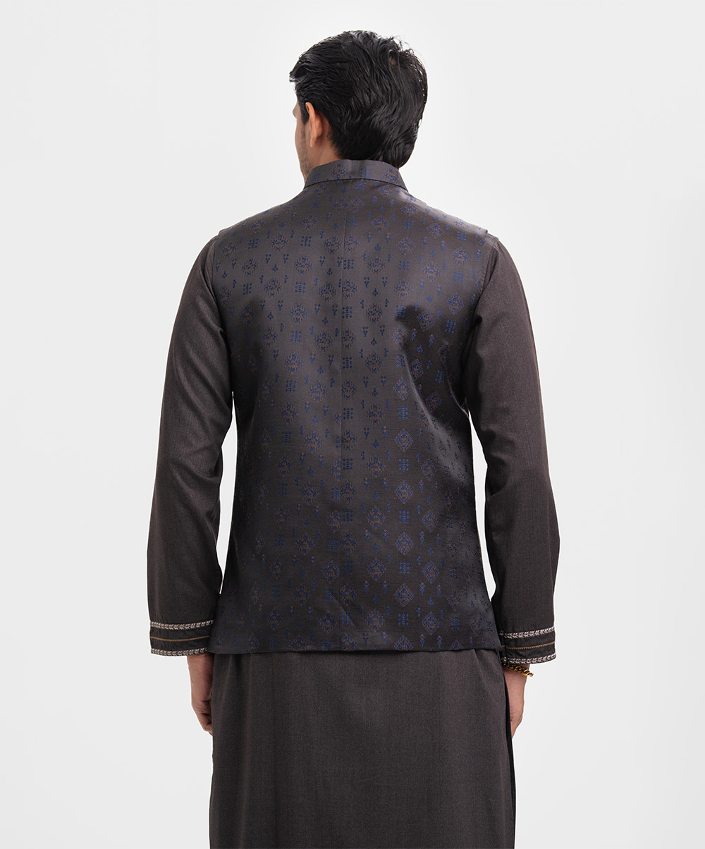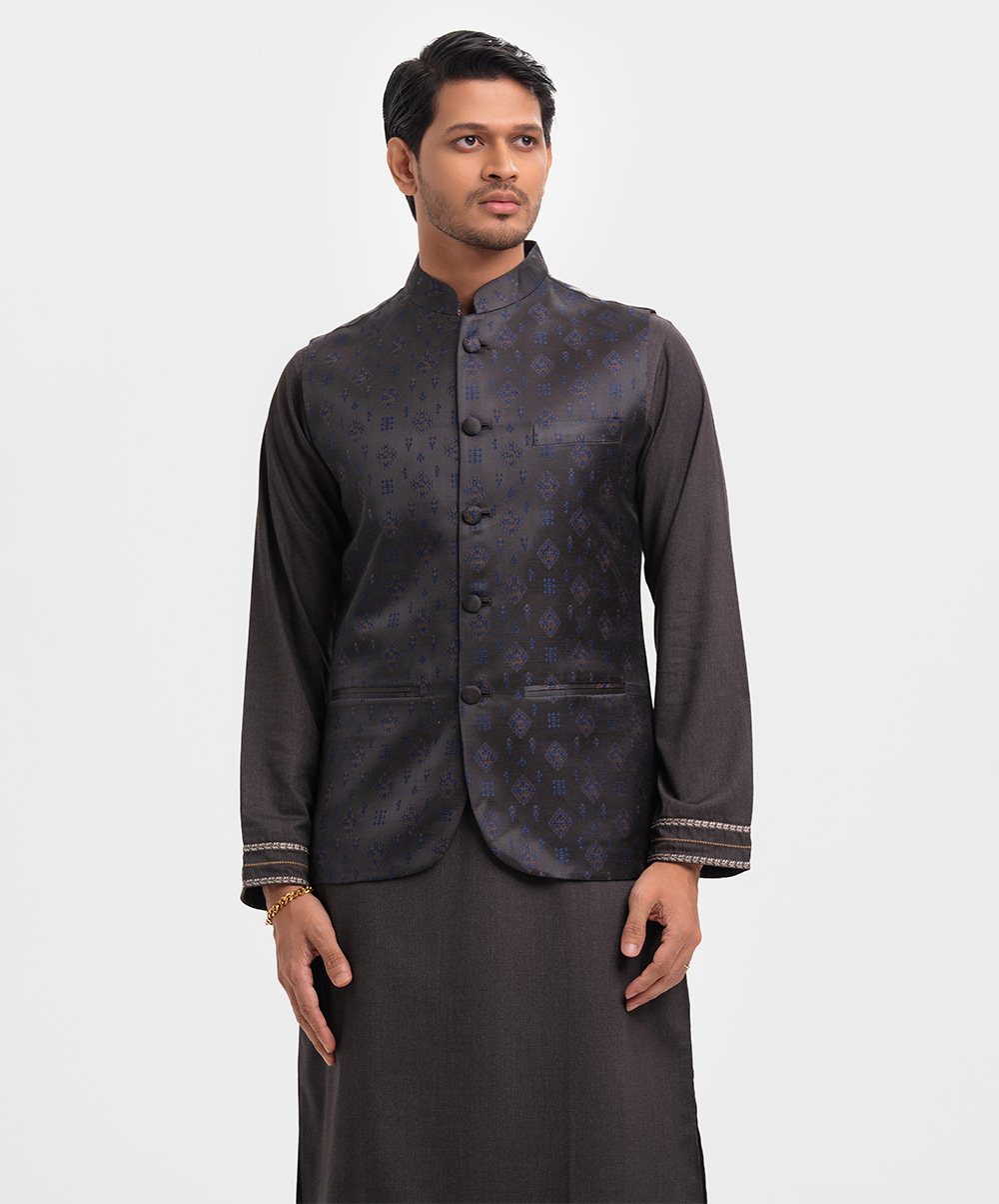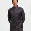 Men’s waistcoat in Jacquard fabric. Mandarin collar, sleeveless, straight hem with buttons closure and three pockets at front.