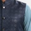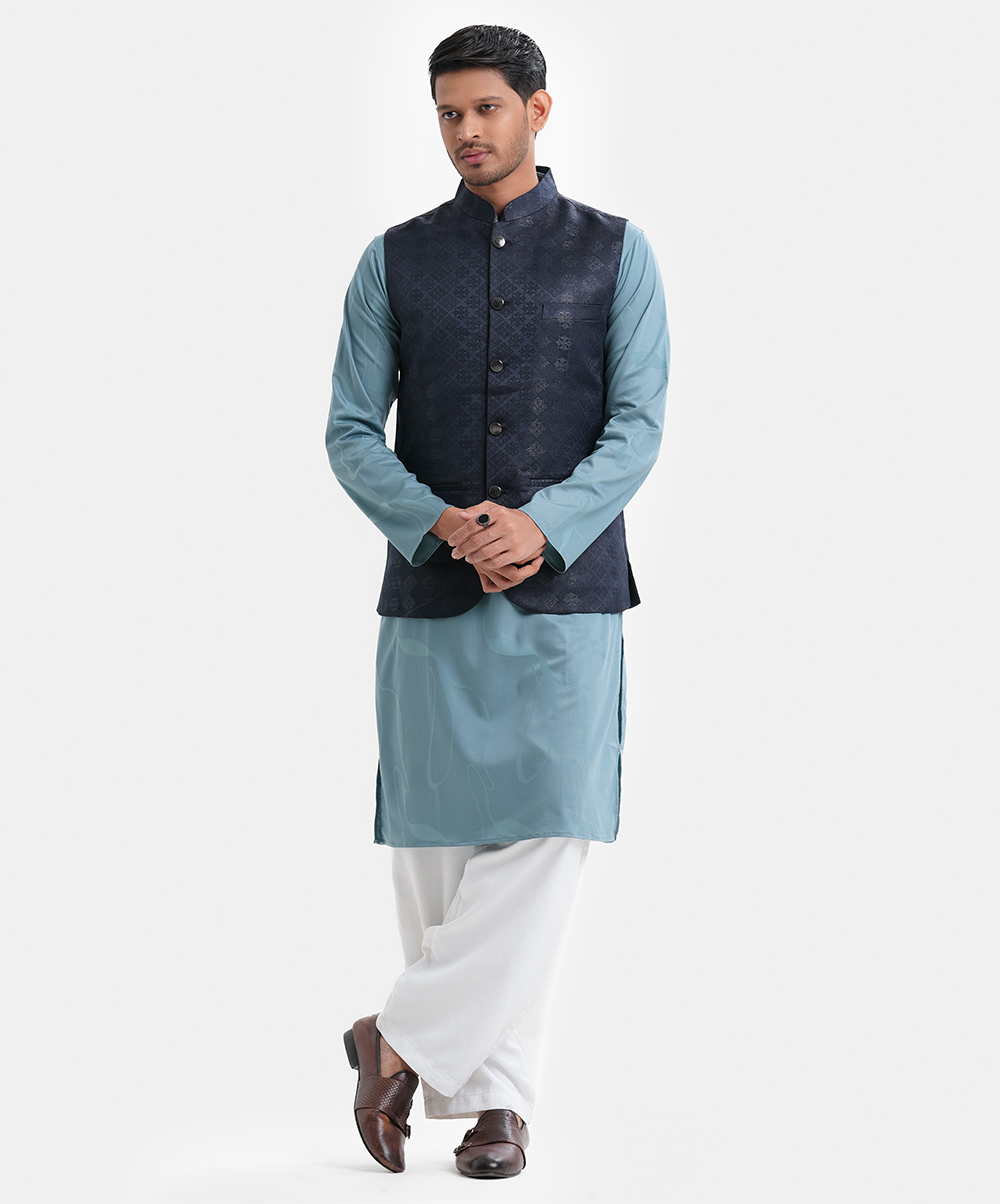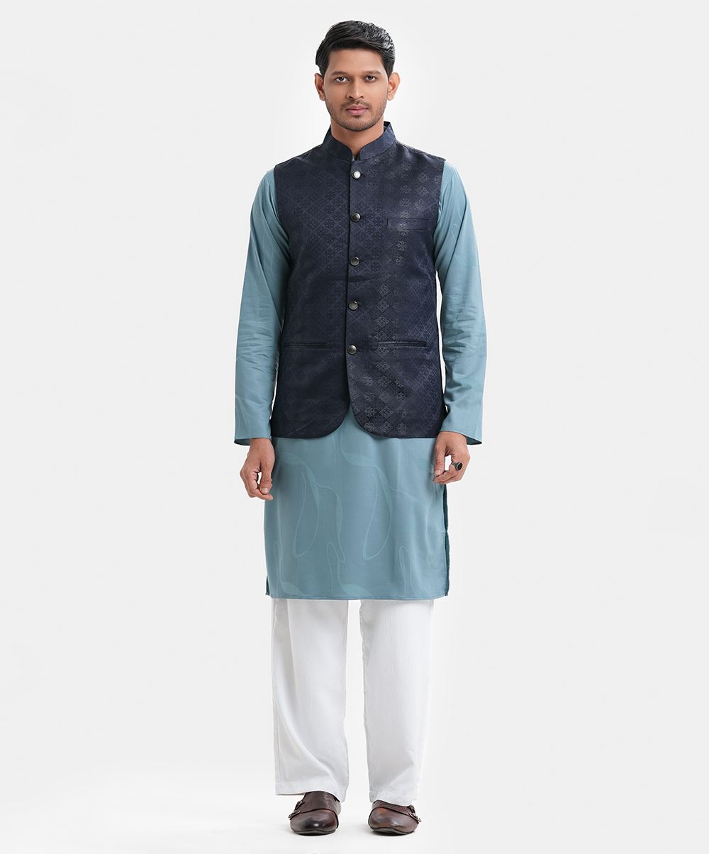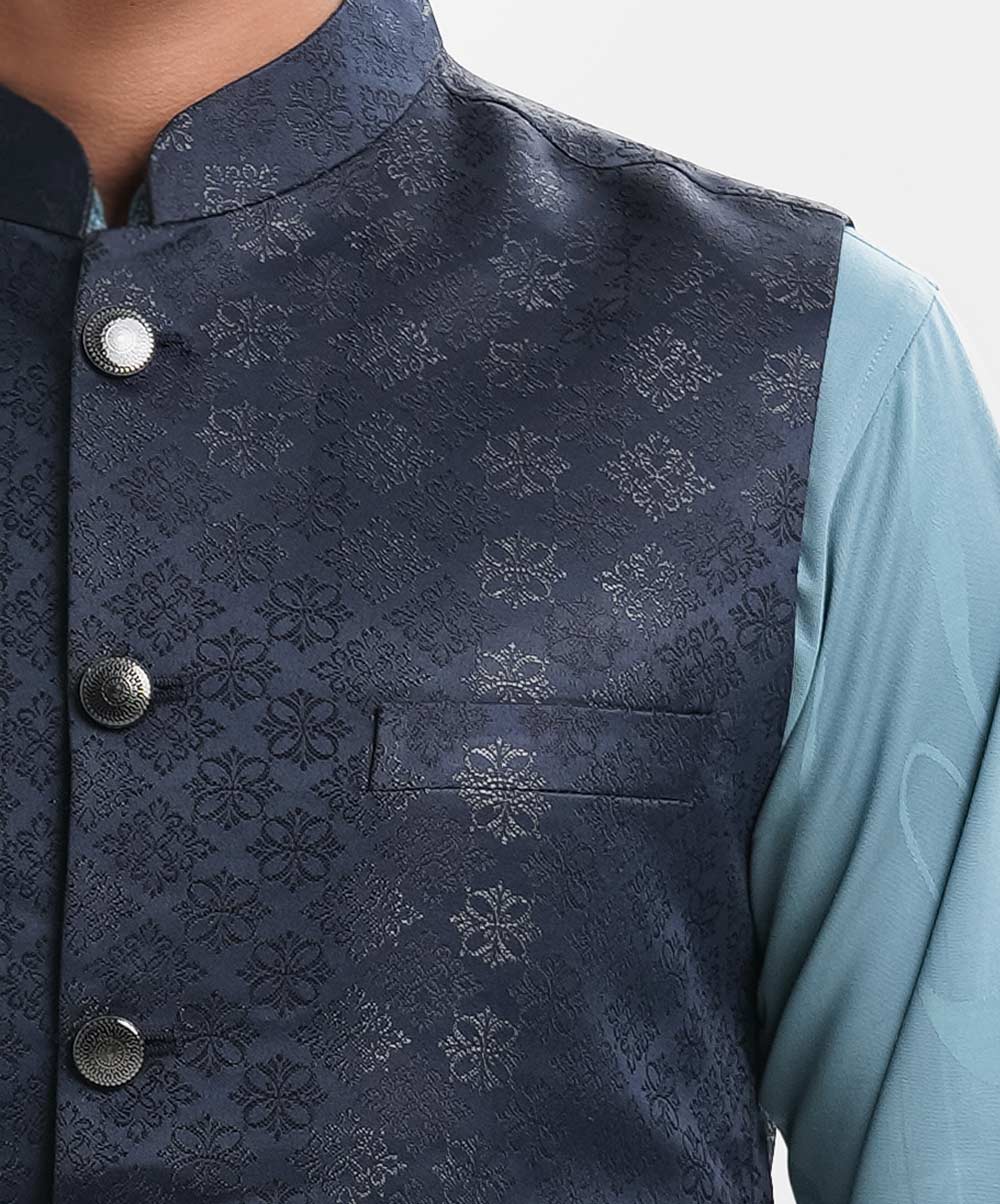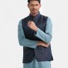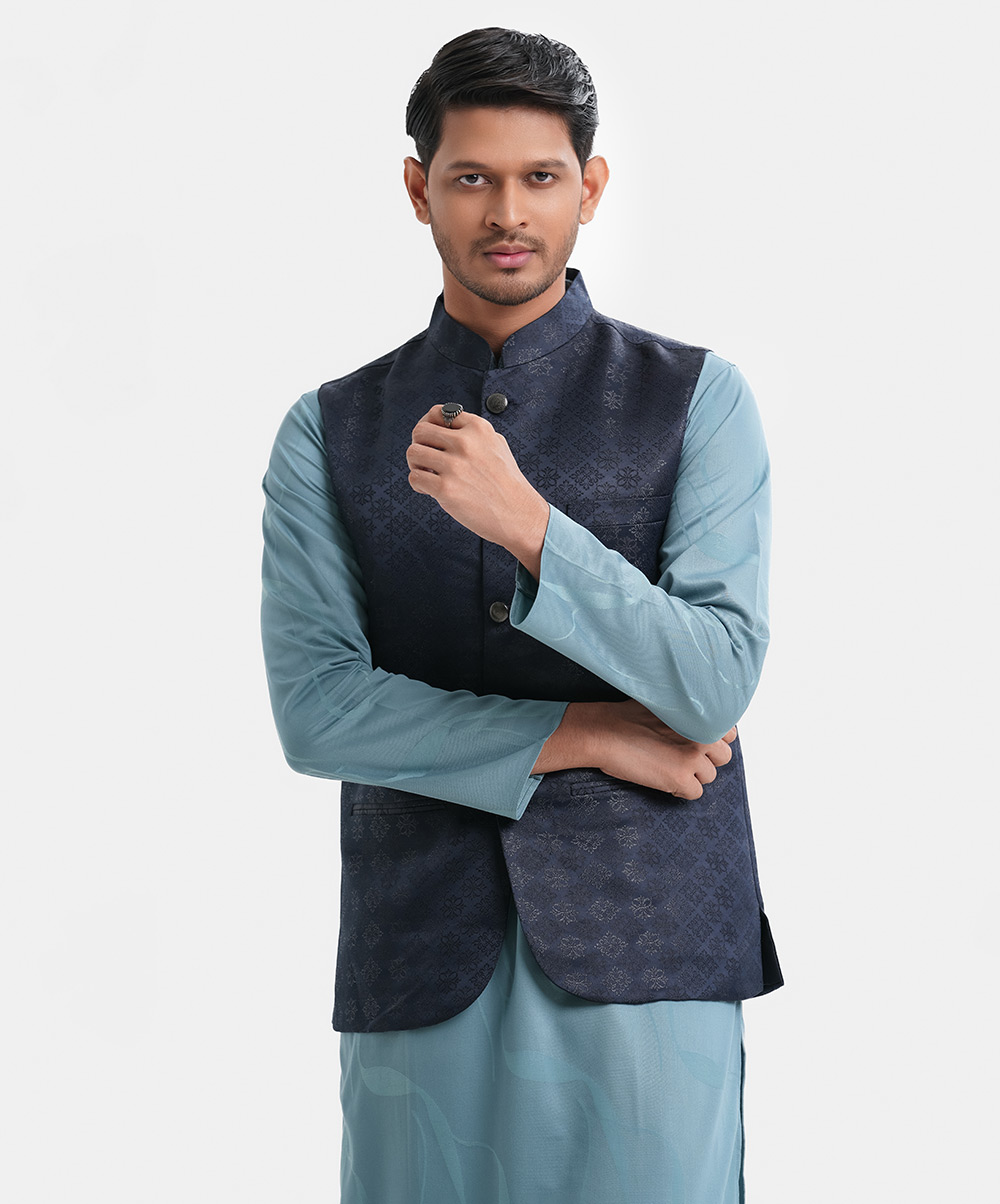 Men’s waistcoat in jacquard fabric. Mandarin collar, sleeveless, straight hem with button closure. One chest pocket and two jetted pockets at the front.