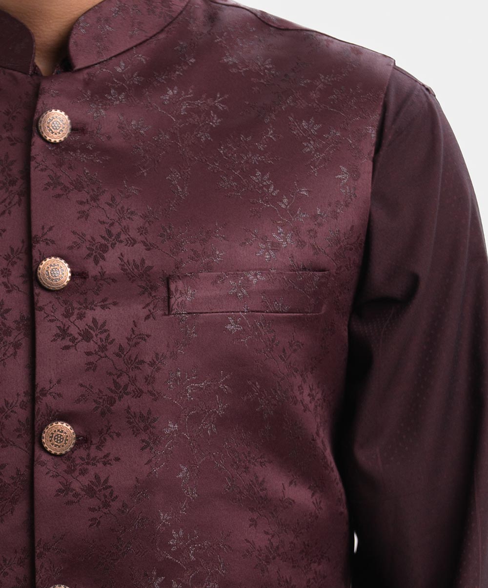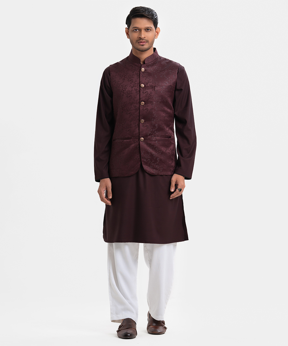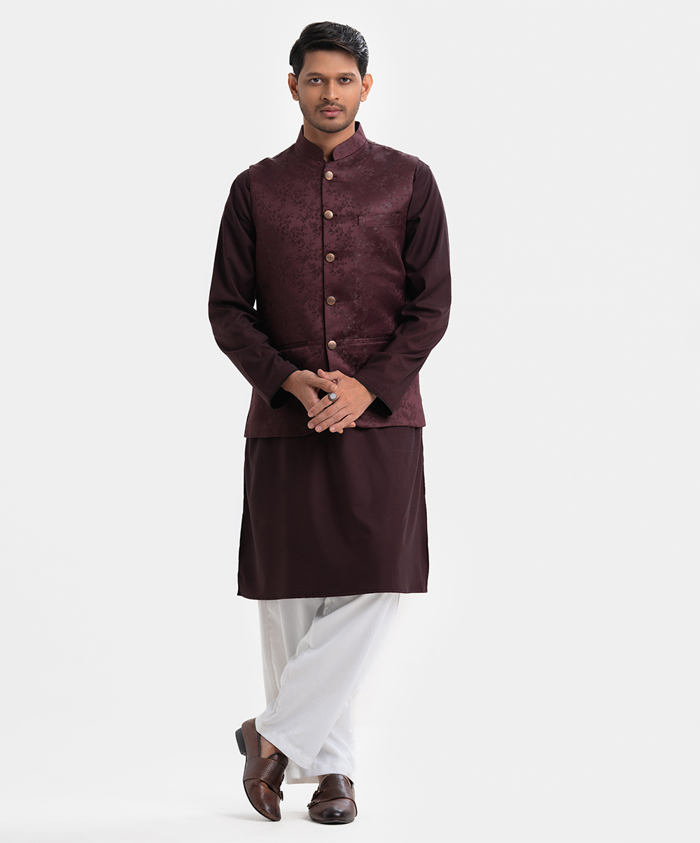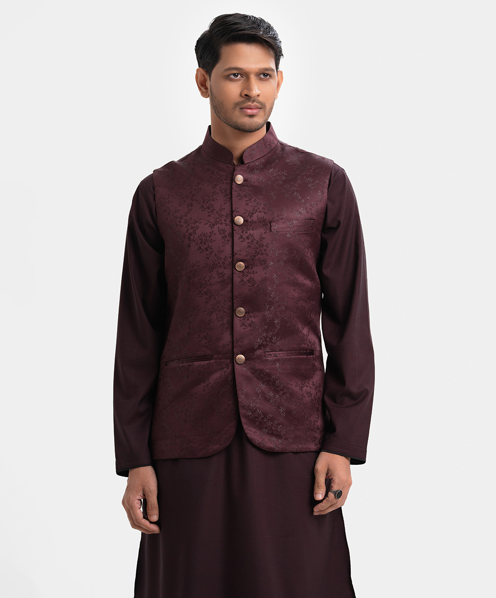 Men’s waistcoat in jacquard fabric. Mandarin collar, sleeveless, straight hem with button closure. One chest pocket and two jetted pockets at the front.
