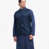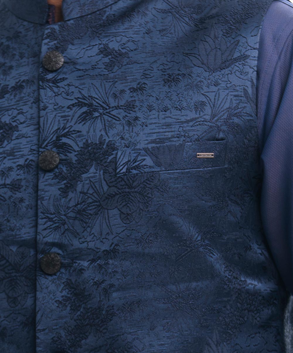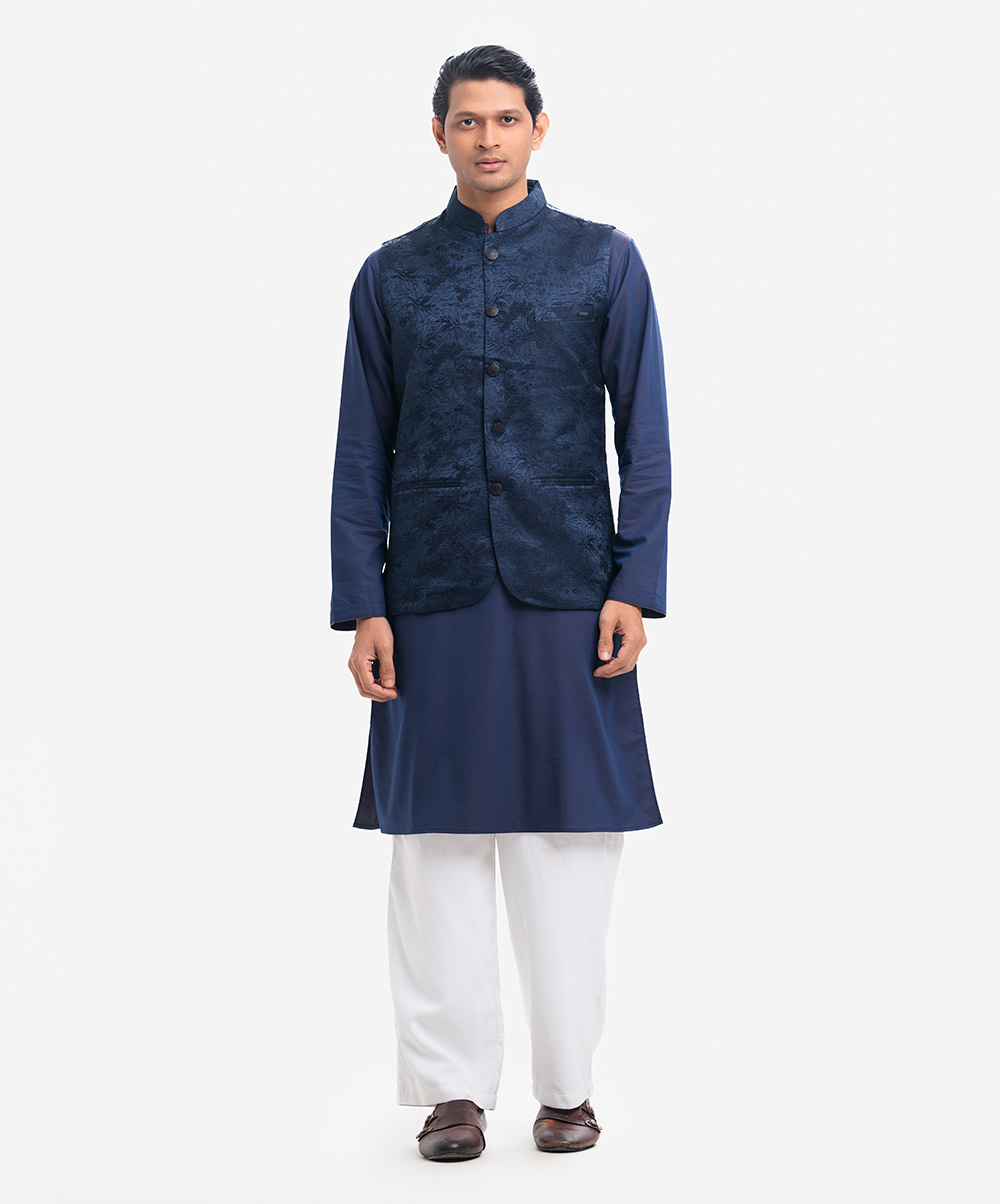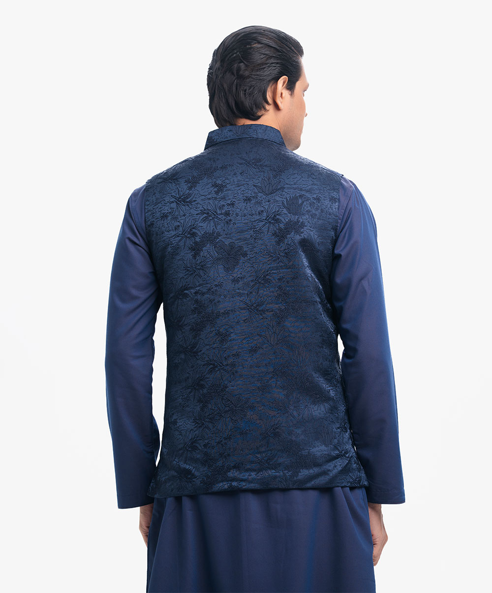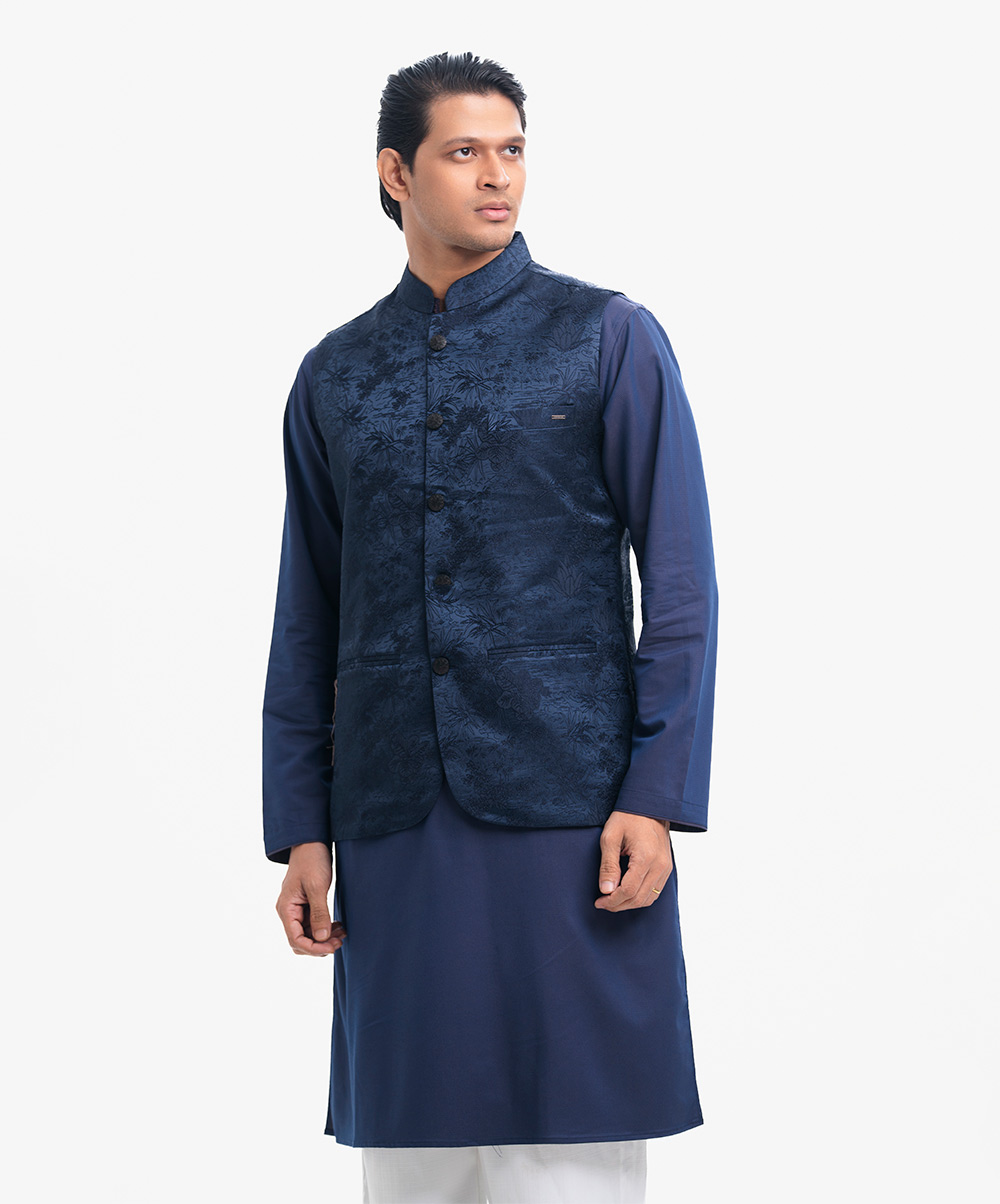 Men’s waistcoat in Jacquard fabric. Mandarin collar, sleeveless, straight hem with buttons closure and three pockets at front.