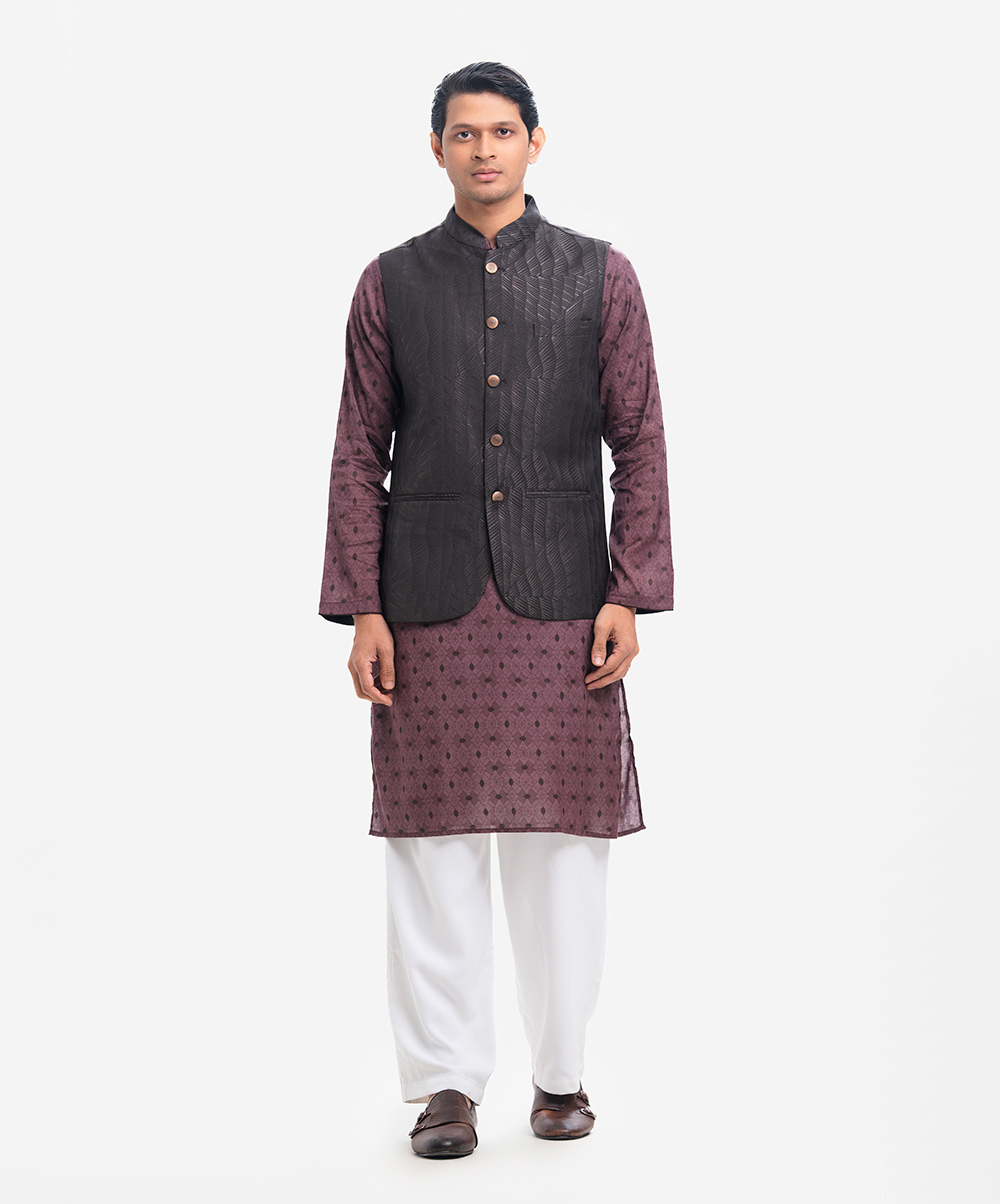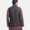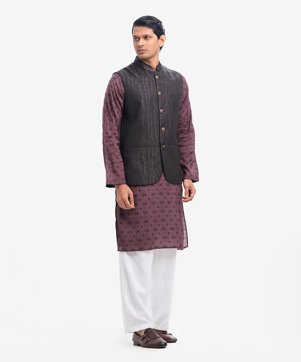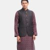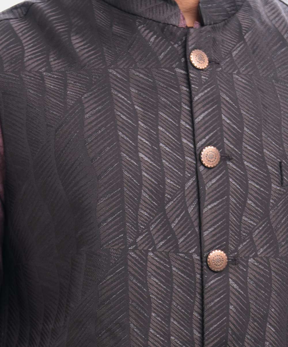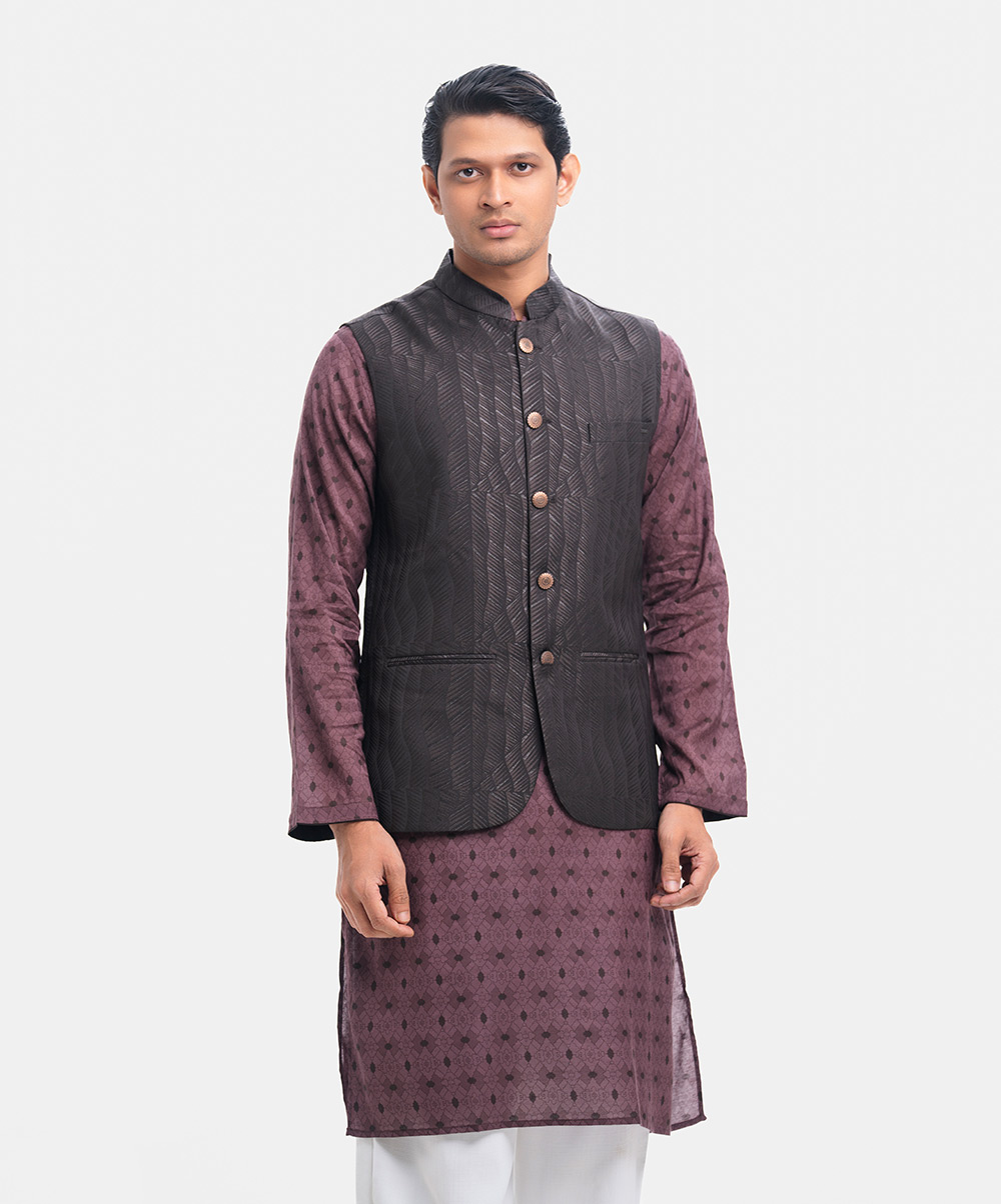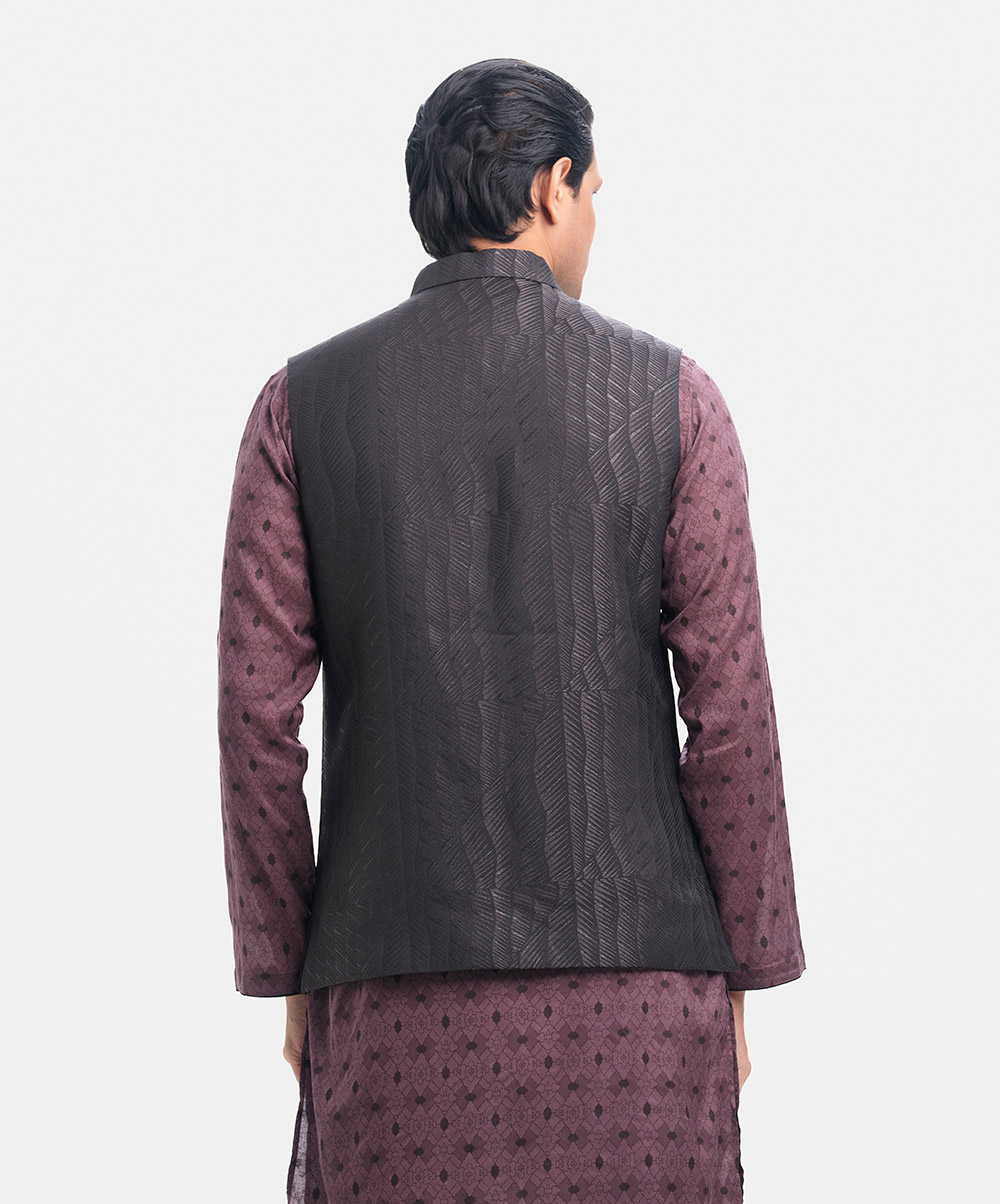 Men’s waistcoat in Jacquard fabric. Mandarin collar, sleeveless, straight hem with buttons closure and three pockets at front.