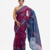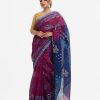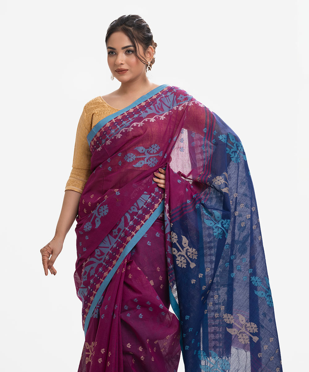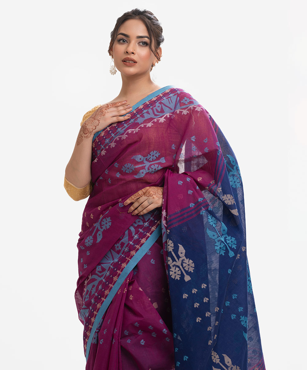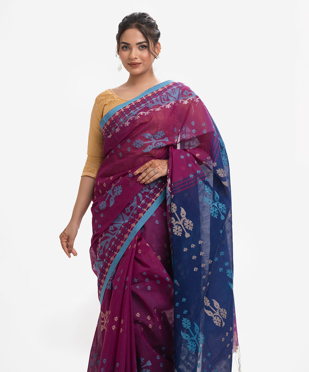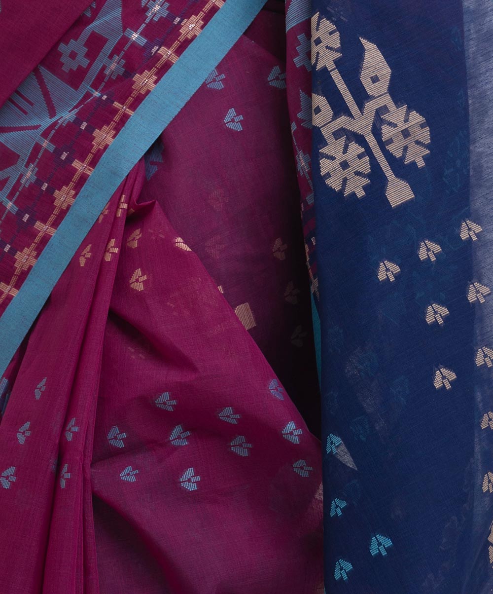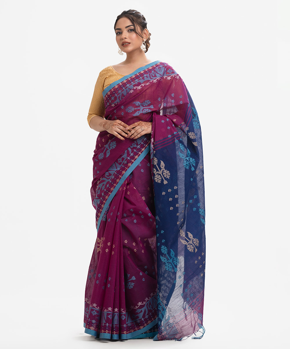 All-over weaving details saree in half-silk fabric. Golden thread detail and frill trim at the Aanchal.