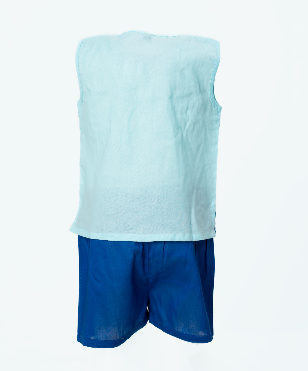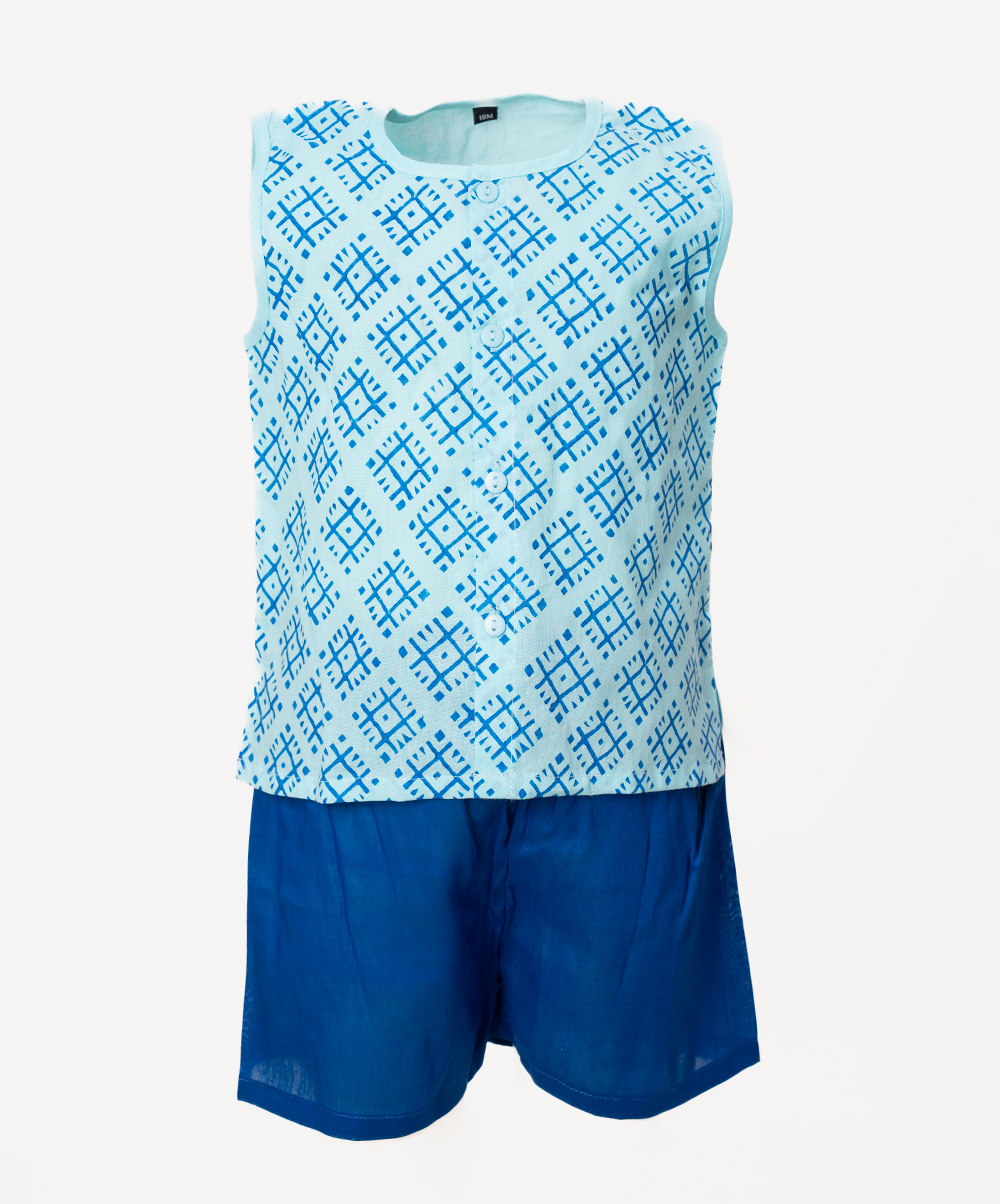 Newborn baby boys’ printed nima pant set in cotton fabric. Round neck, sleeveless and button fastening at the front.